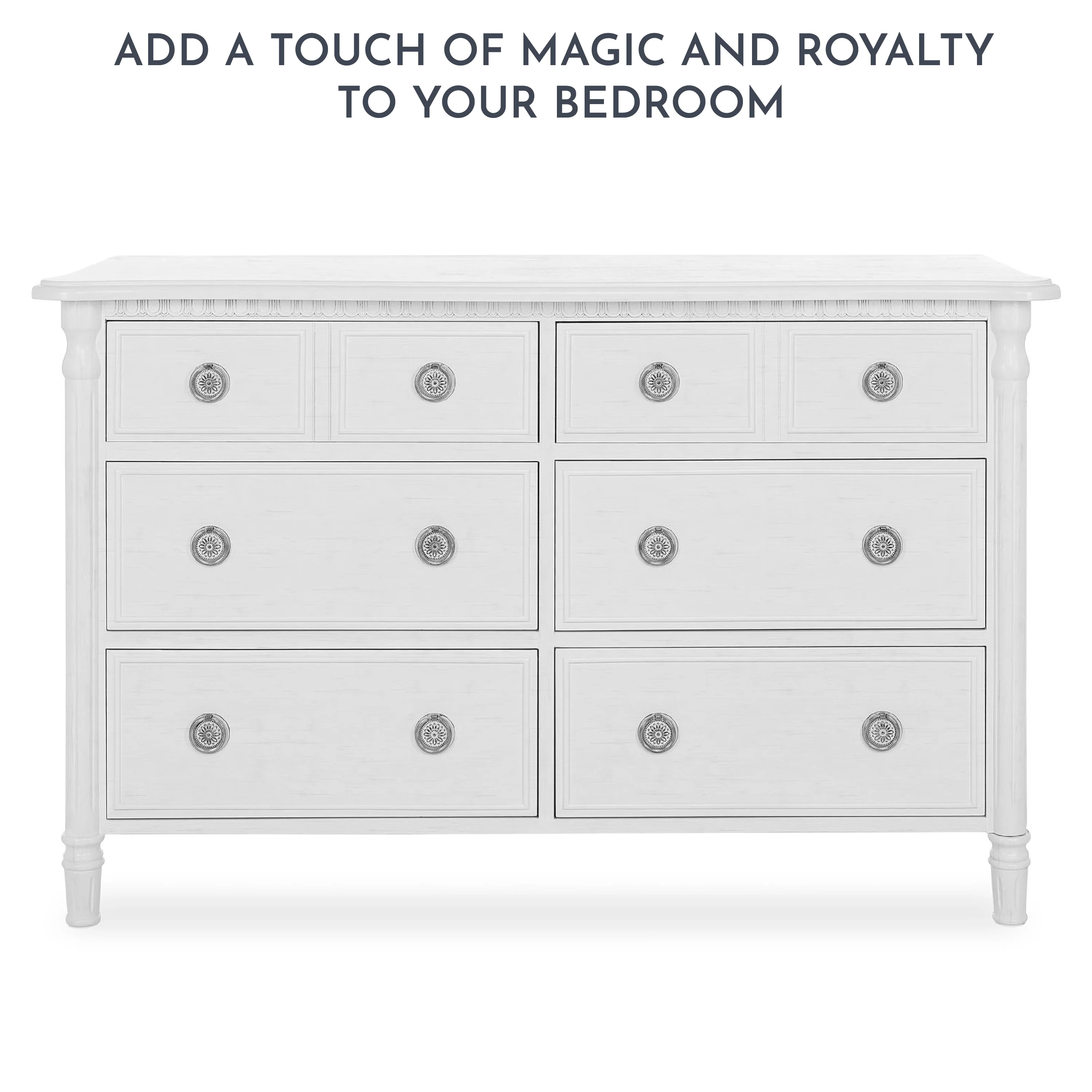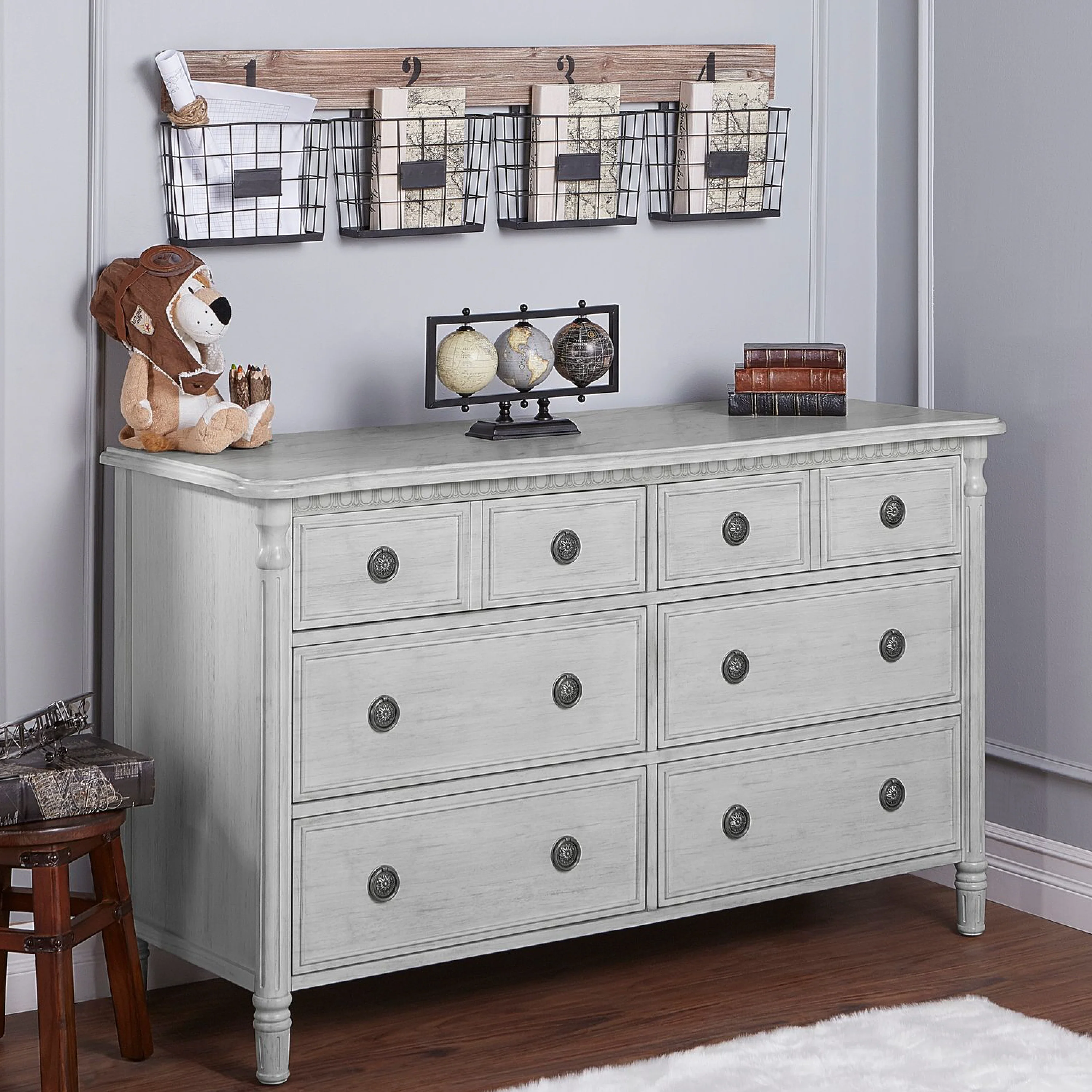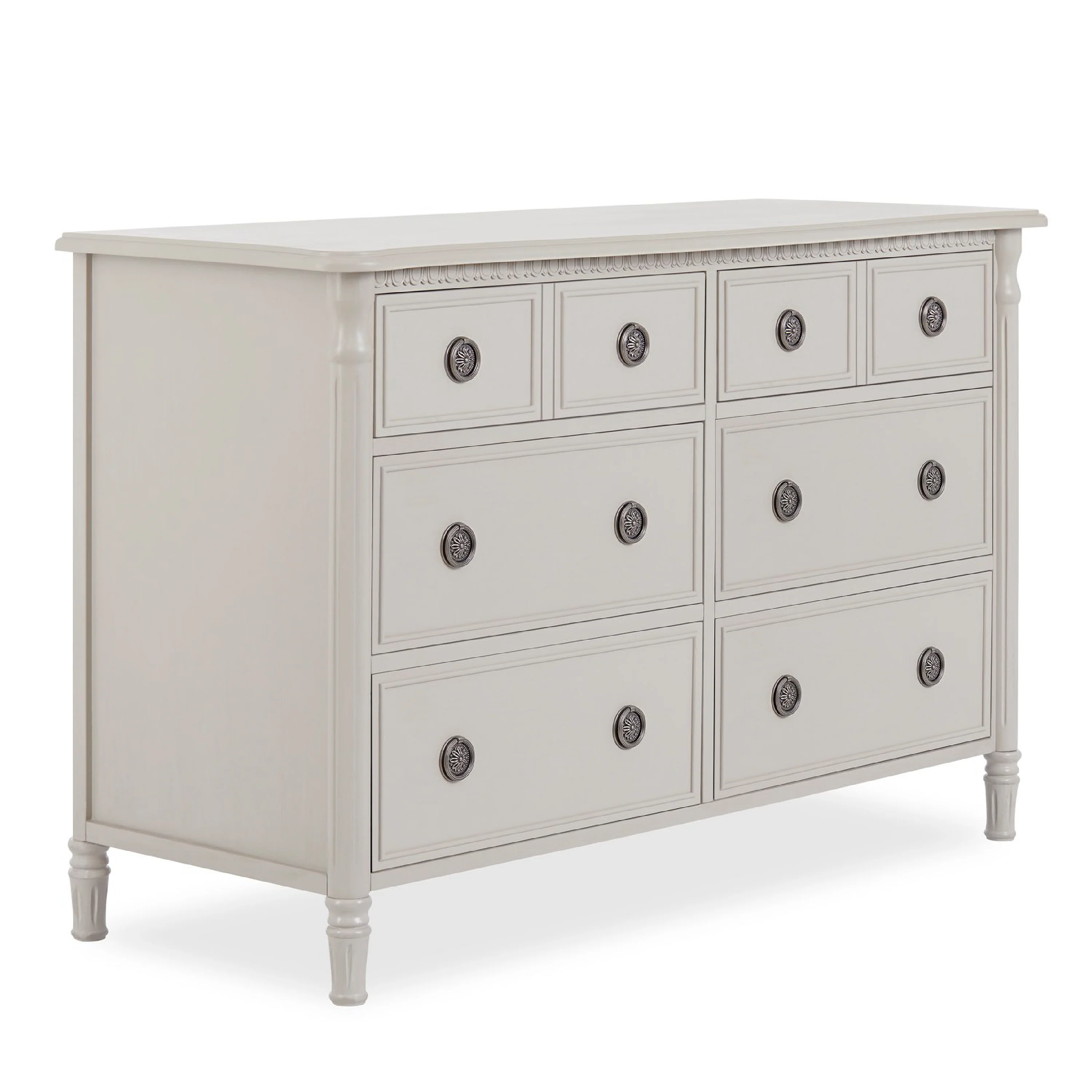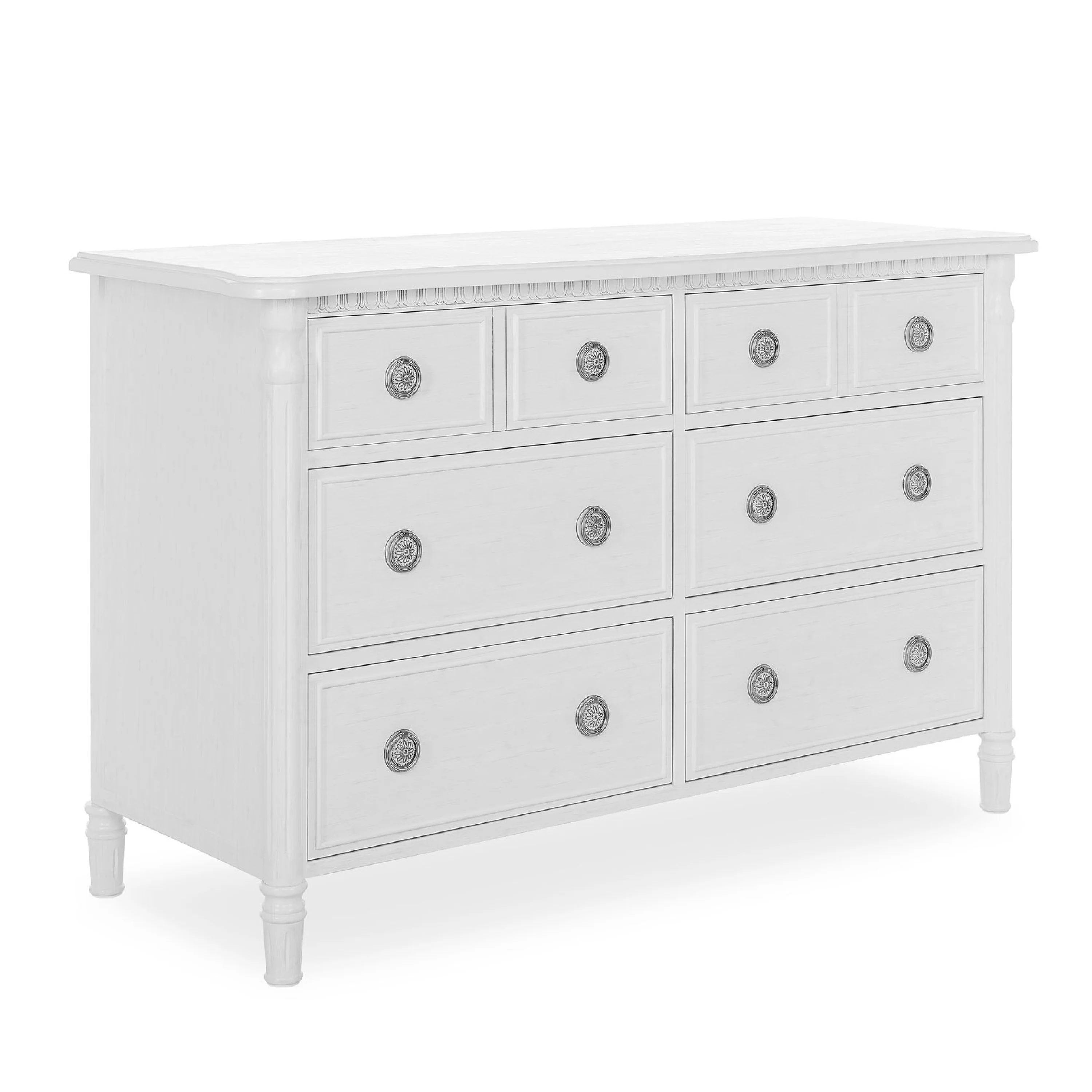 Inspired by antique French country furniture, this versatile double dresser adds old world charm to any nursery. The Evolur Julienne double dresser is designed with elegant detailing on the trim, fluted cylinder leg post and feet add an alluring sophistication. The dresser features antique drawer pulls and quality side-mounted 3 tier glides to help provide durability over the years with its quality material, craftsmanship and its forward-thinking functionality. This double dresser can serve as a changing surface by adding a contour pad (sold separately). Perfect for traditional or shabby chic inspired nurseries, where luxury and ambience are essential. The Julienne is available in Weathered Natural, Linen Gray and Antique Mist. This 6 drawer double dresser pairs beautifully with its matching crib, chest and hutch/bookcase to complete your nursery.