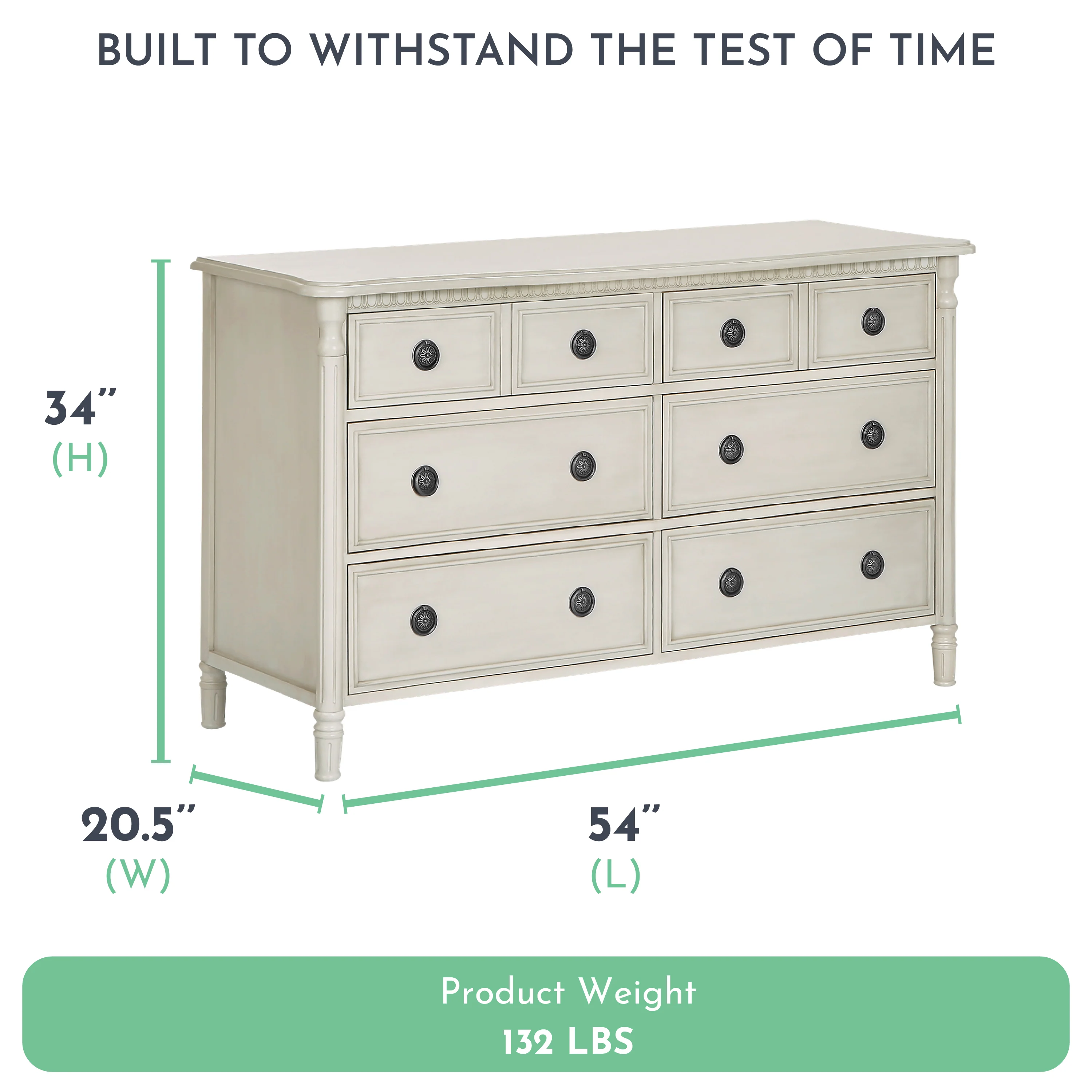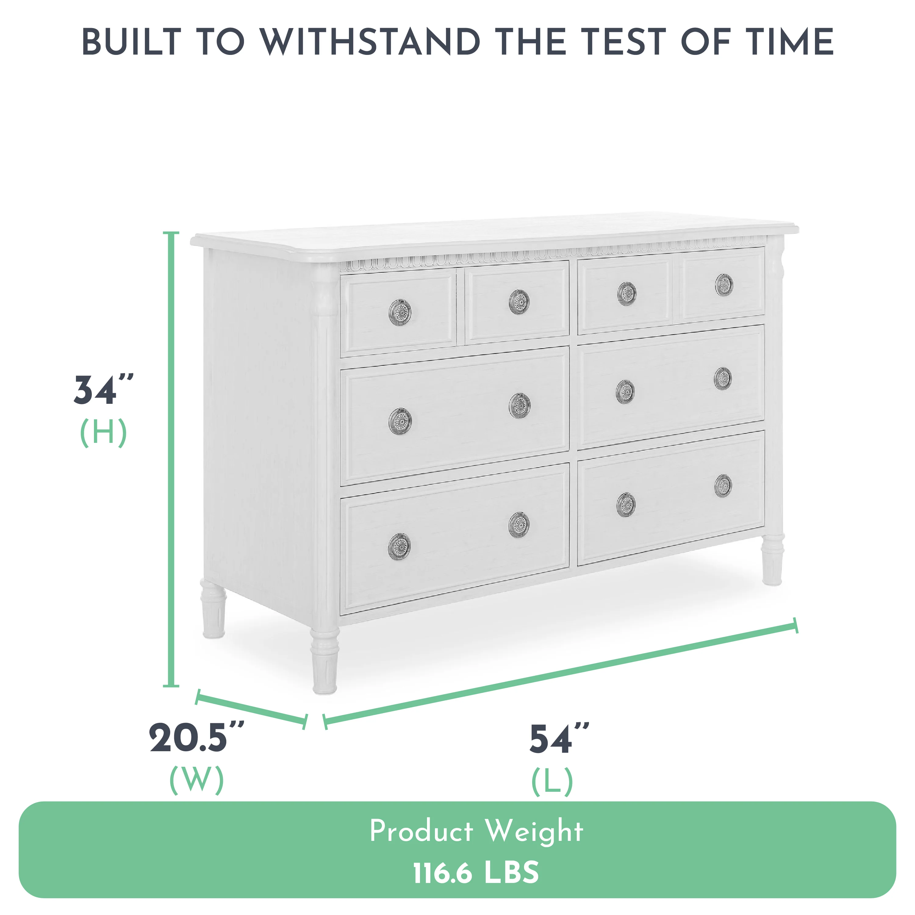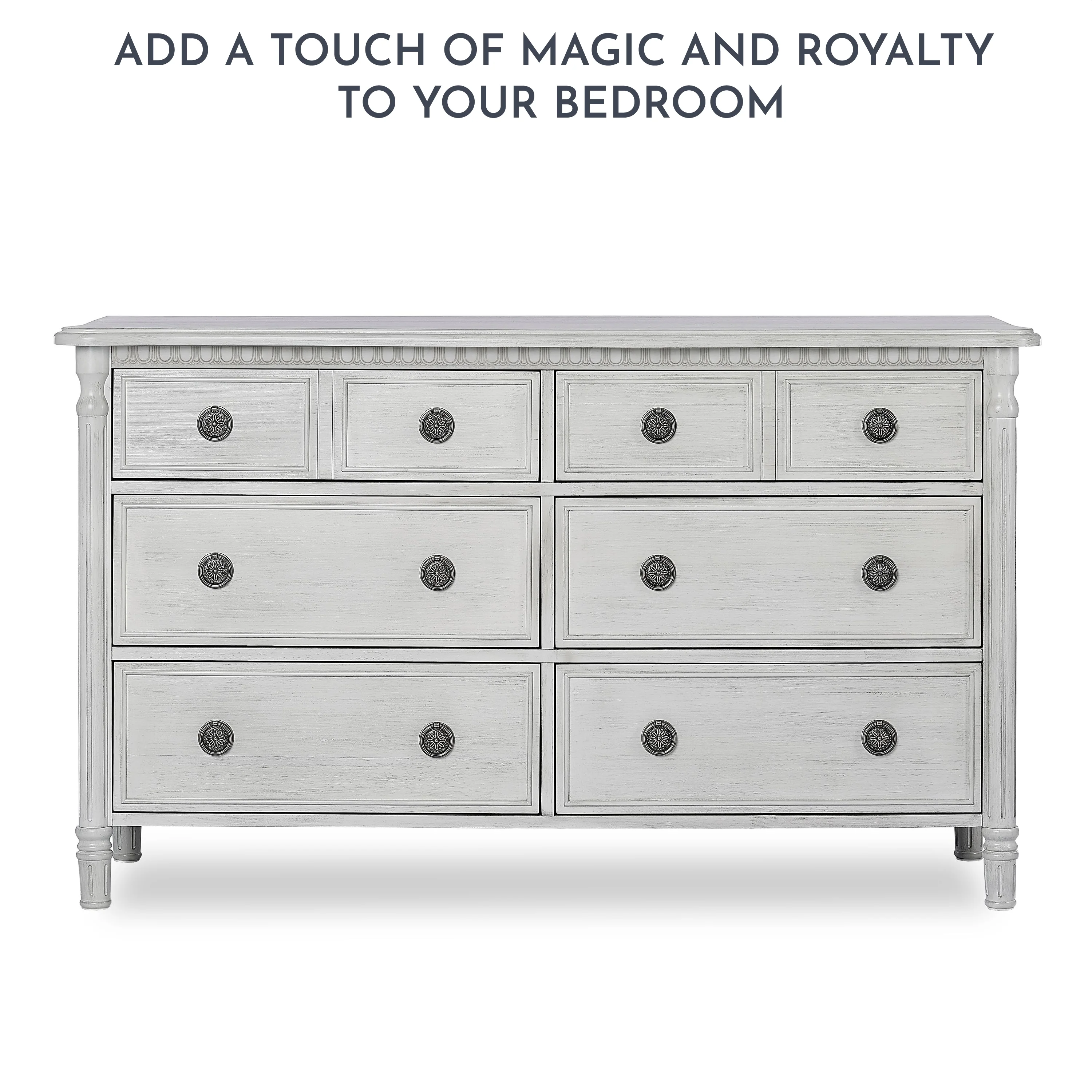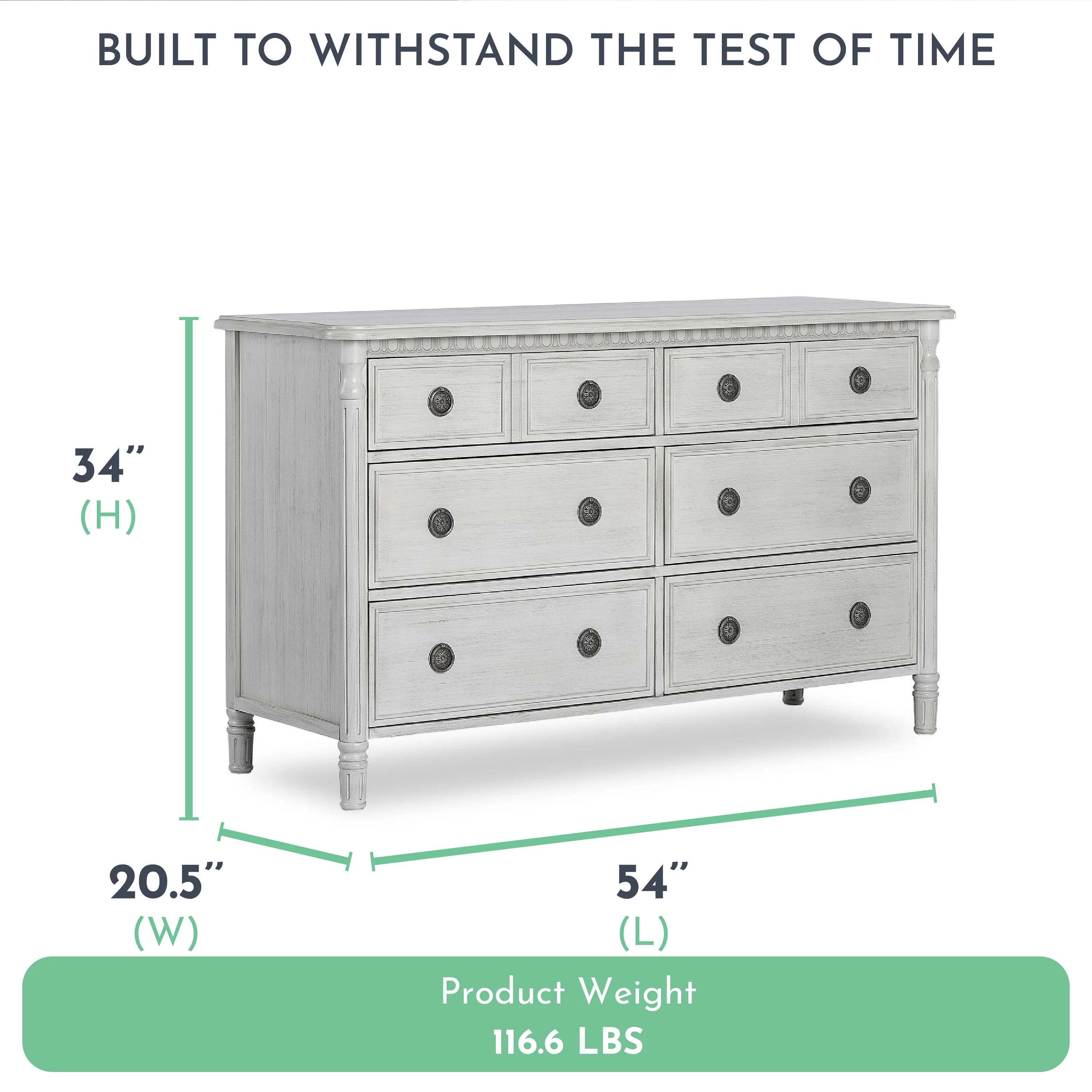 Inspired by antique French country furniture, this versatile double dresser adds old world charm to any nursery. The Evolur Julienne double dresser is designed with elegant detailing on the trim, fluted cylinder leg post and feet add an alluring sophistication. The dresser features antique drawer pulls and quality side-mounted 3 tier glides to help provide durability over the years with its quality material, craftsmanship and its forward-thinking functionality. This double dresser can serve as a changing surface by adding a contour pad (sold separately). Perfect for traditional or shabby chic inspired nurseries, where luxury and ambience are essential. The Julienne is available in Weathered Natural, Linen Gray and Antique Mist. This 6 drawer double dresser pairs beautifully with its matching crib, chest and hutch/bookcase to complete your nursery.