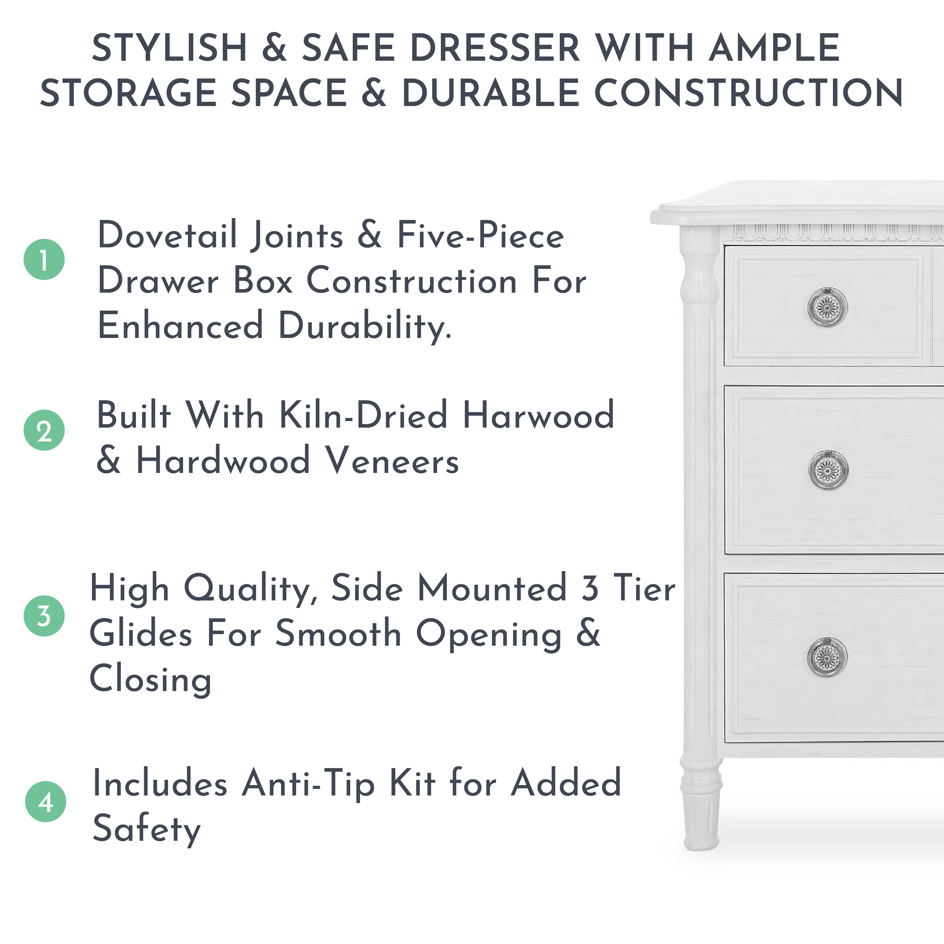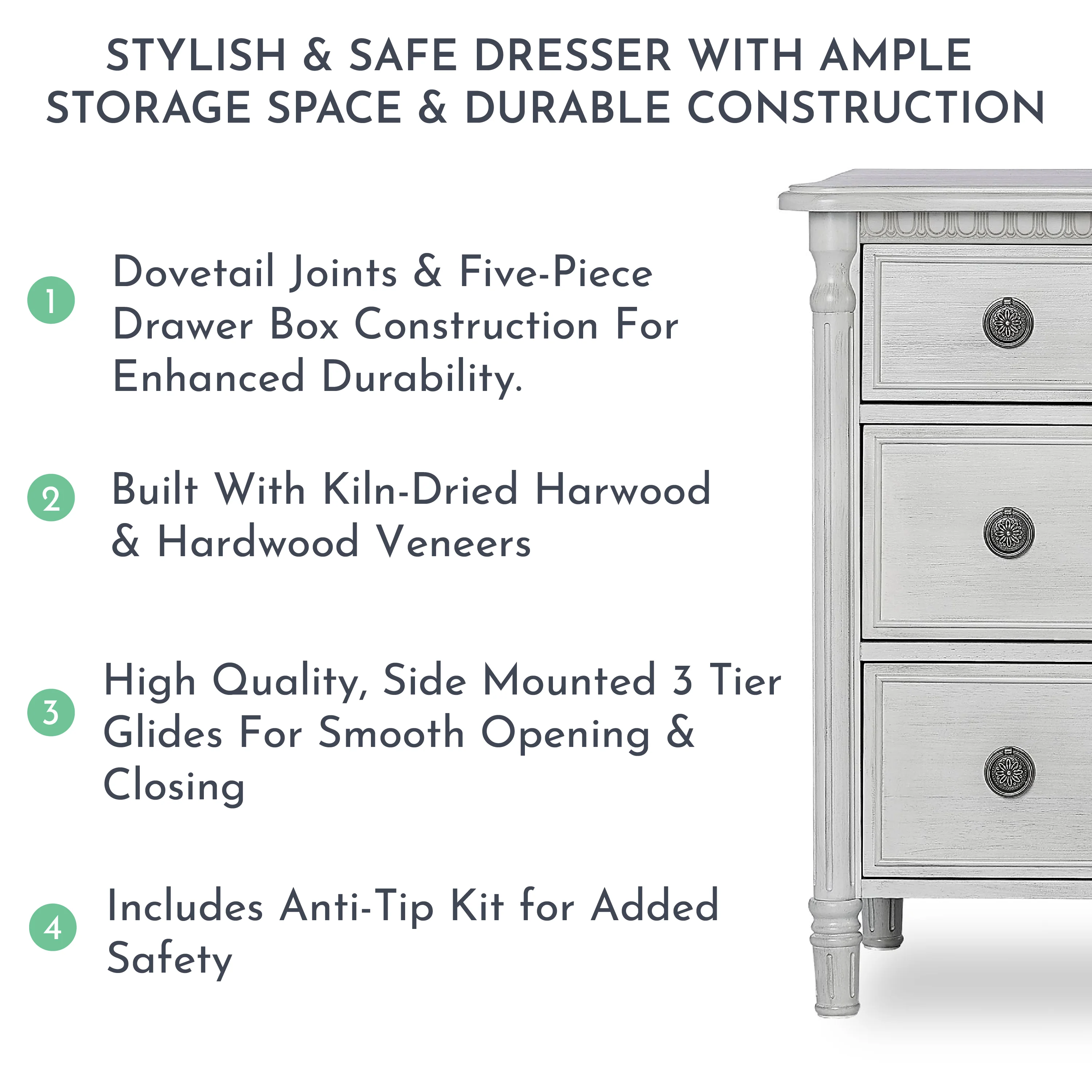 - All the drawers feature Dovetail joints and five-piece drawer box construction. The drawers feature quality side-mounted 3 tier glides and antique drawer pulls which provide durability over the years.
