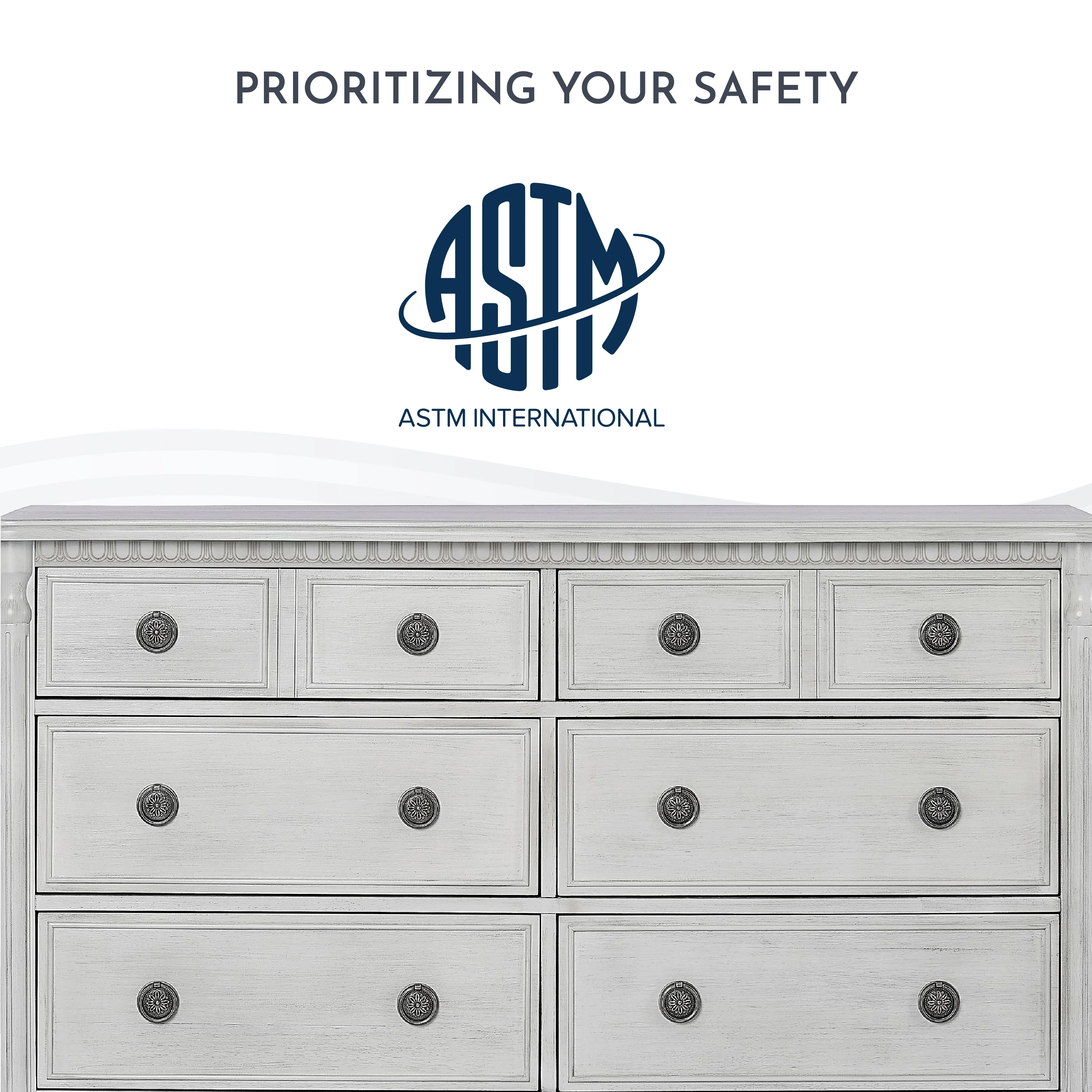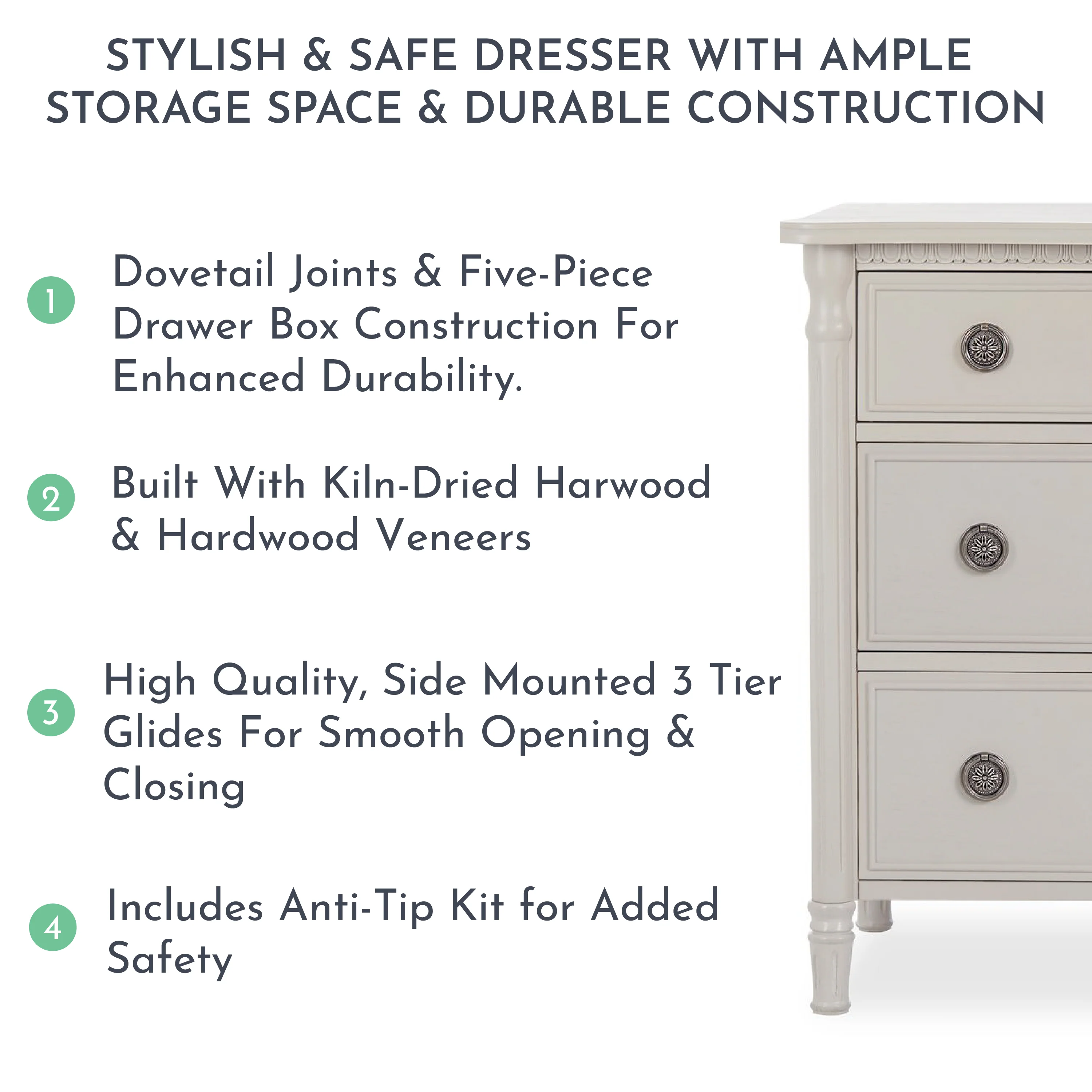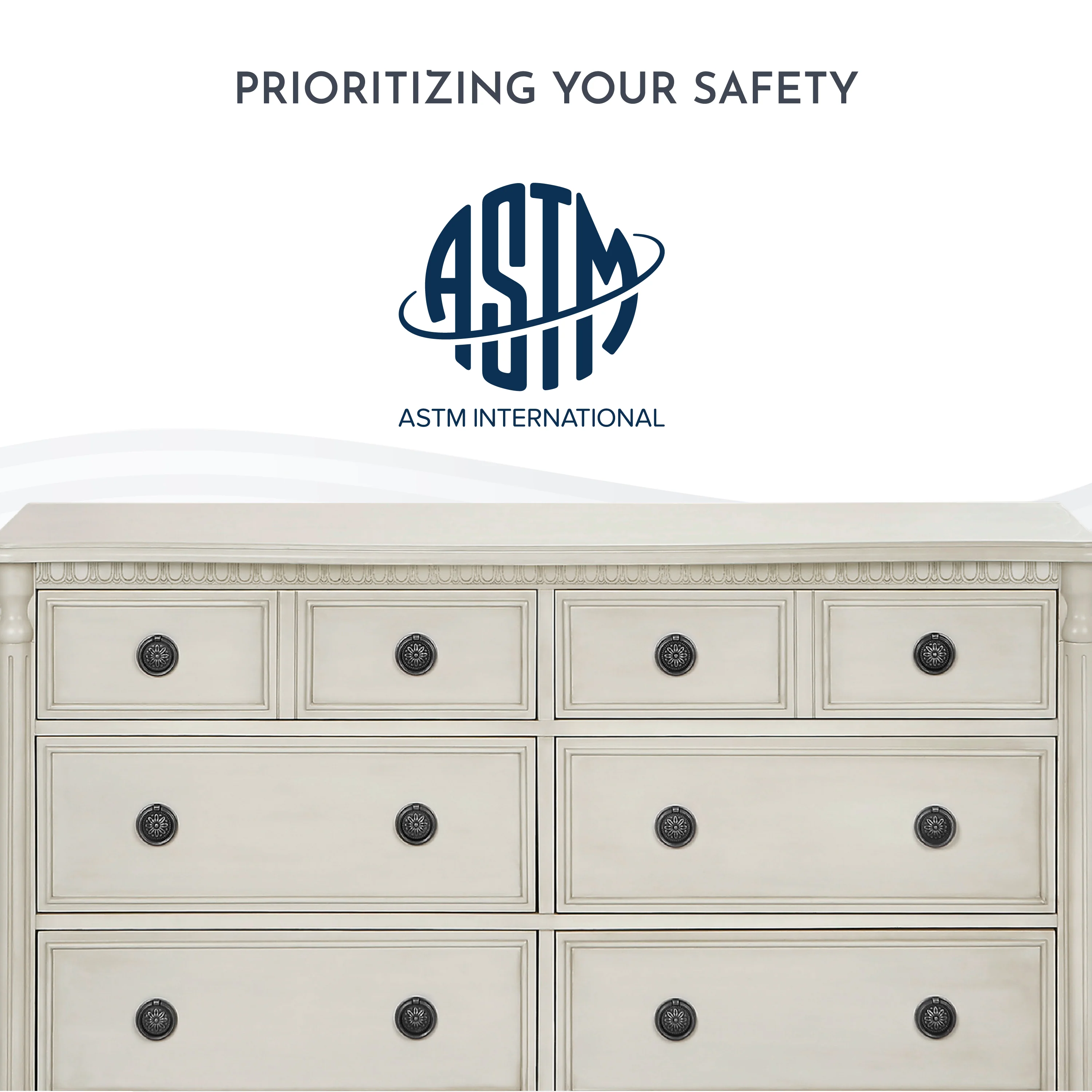Inspired by antique French country furniture, this versatile double dresser adds old world charm to any nursery. The Evolur Julienne double dresser is designed with elegant detailing on the trim, fluted cylinder leg post and feet add an alluring sophistication. The dresser features antique drawer pulls and quality side-mounted 3 tier glides to help provide durability over the years with its quality material, craftsmanship and its forward-thinking functionality. This double dresser can serve as a changing surface by adding a contour pad (sold separately). Perfect for traditional or shabby chic inspired nurseries, where luxury and ambience are essential. The Julienne is available in Weathered Natural, Linen Gray and Antique Mist. This 6 drawer double dresser pairs beautifully with its matching crib, chest and hutch/bookcase to complete your nursery.