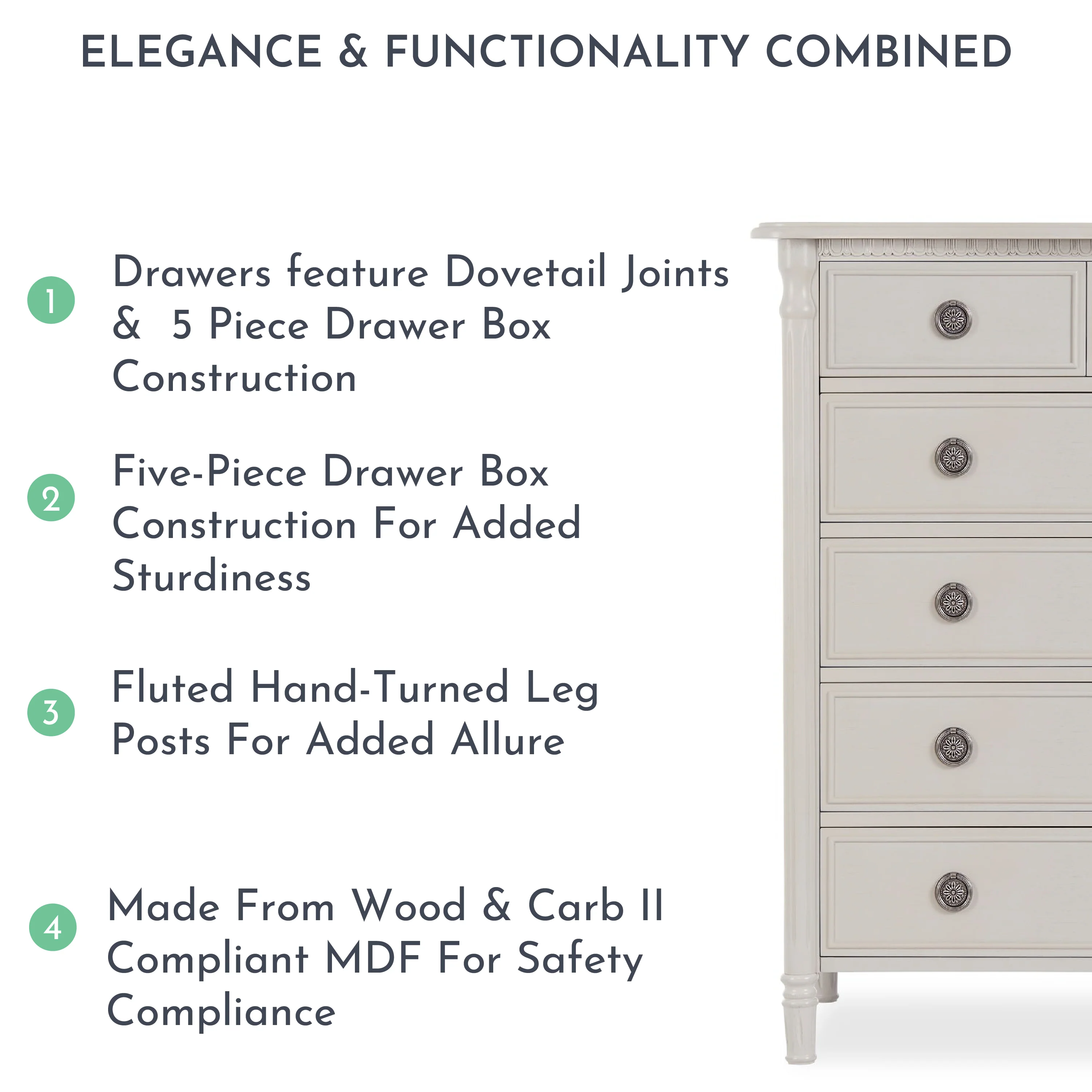 Blending form and function, the Evolur Julienne Tall Chest offers you a charming yet practical piece of storage furniture for your home.