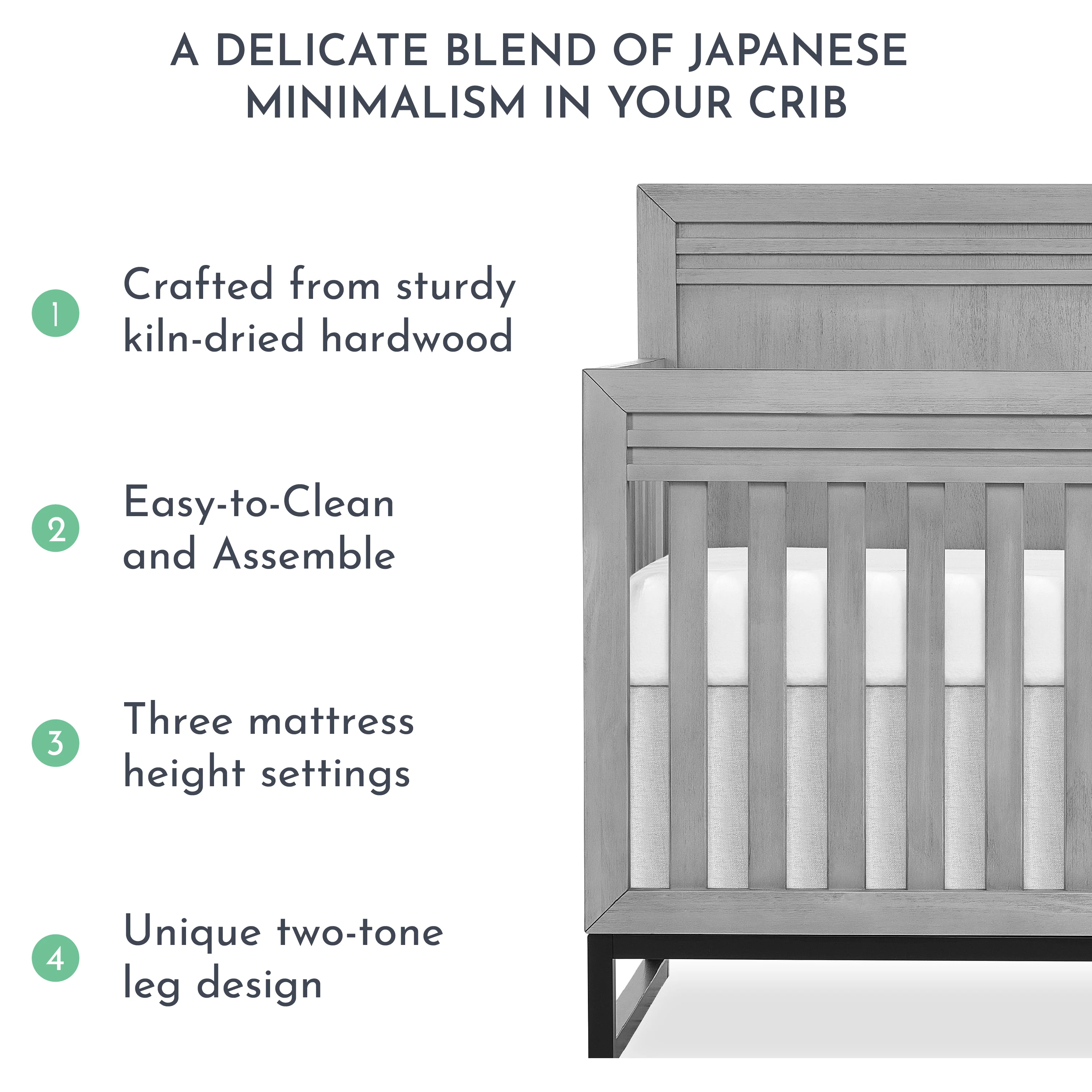 • ORIENTAL & MODERN INFLUENCE: This convertible crib combines Japanese charm and clean, modern lines with a unique two-tone leg design for an airy, elevated feel.