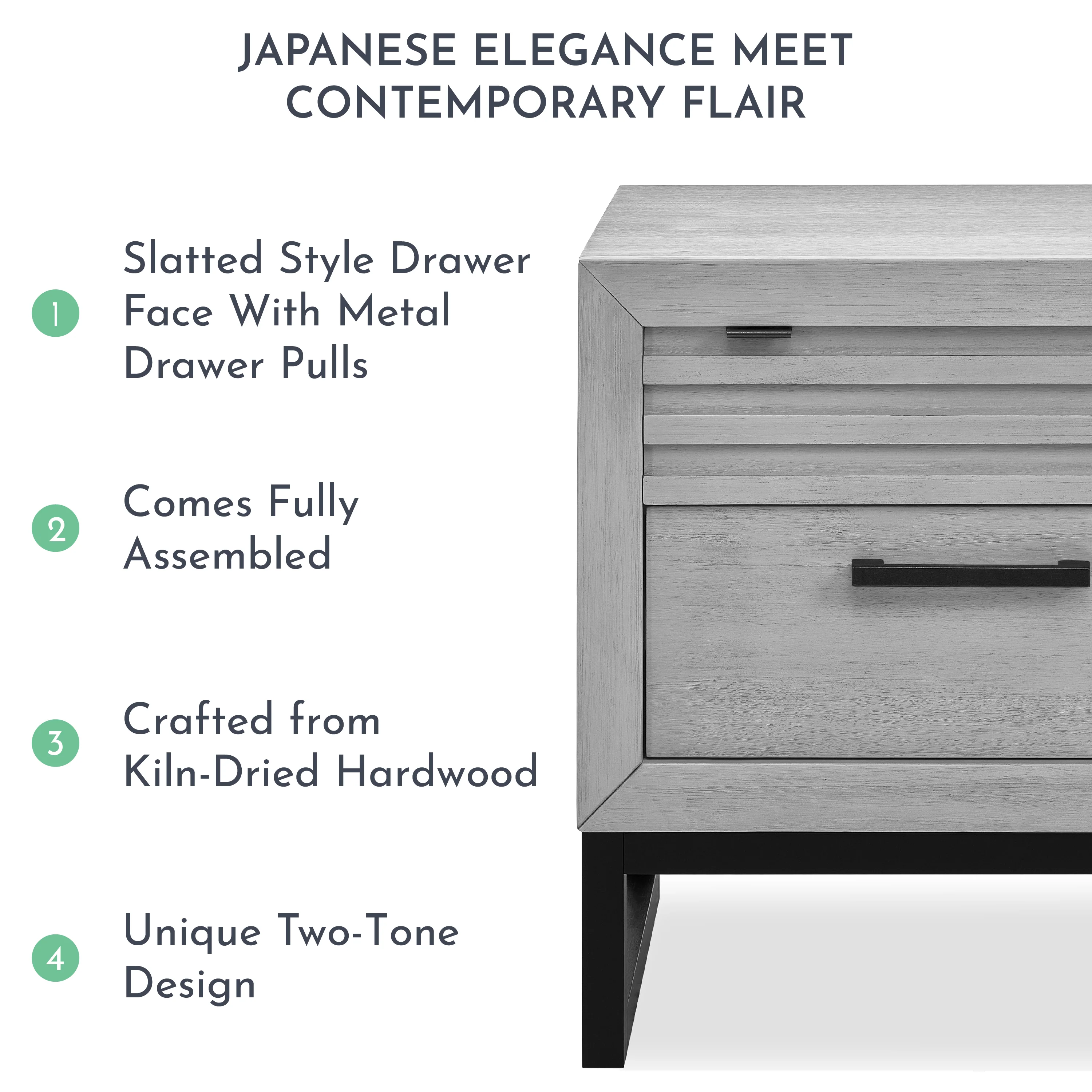 - ORIENTAL & MODERN INFLUENCE: The Kyoto Nightstand effortlessly combines the charm of intricate Japanese lines with Dovetail joints �?a recognized mark of craftsmanship. The unique two-tone leg design gives it an airy, elevated feel.