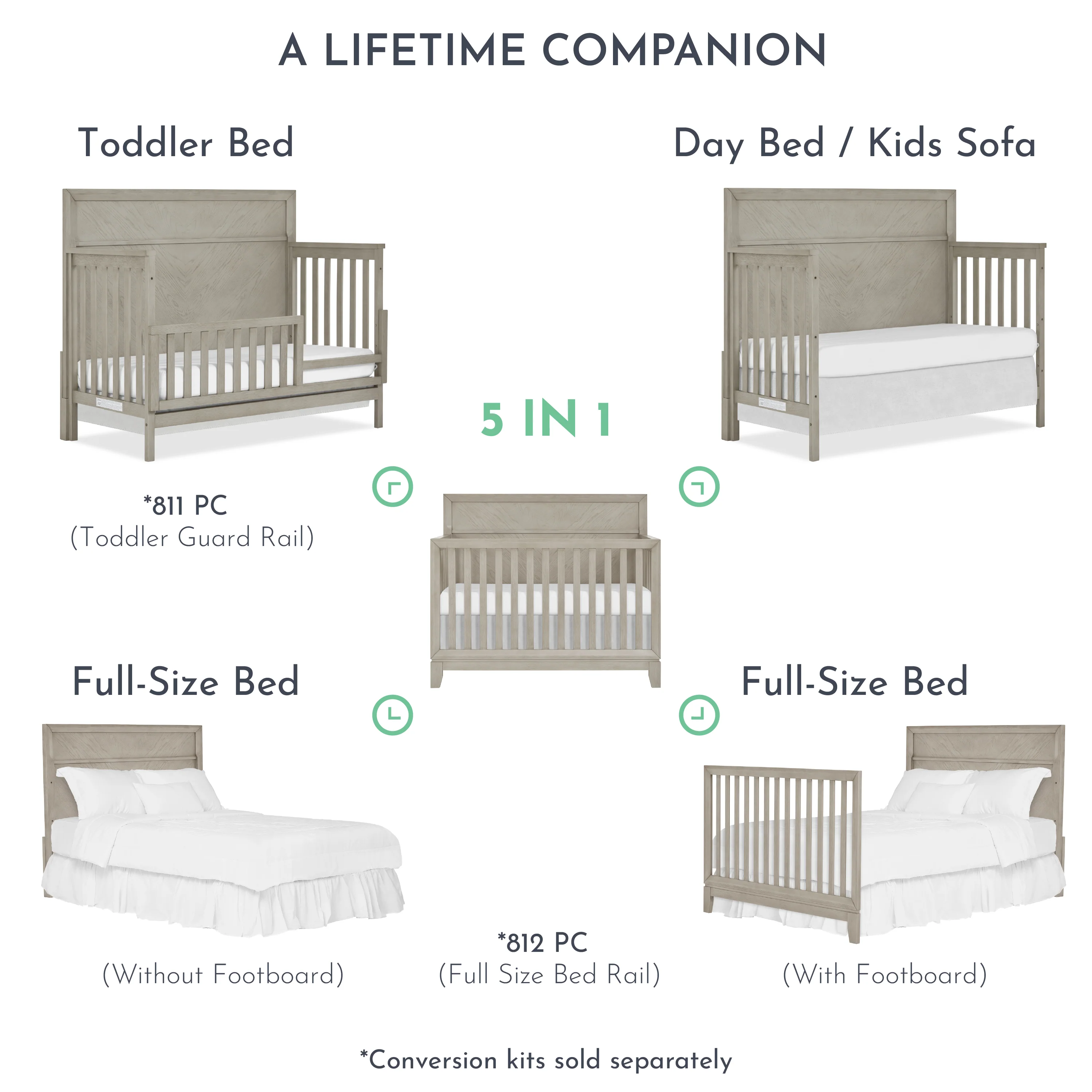 - GROWS WITH YOUR BABY: This crib effortlessly grows along with your baby, with its 5-in-1 convertibility mode from crib to a daybed, toddler bed and full-size bed.