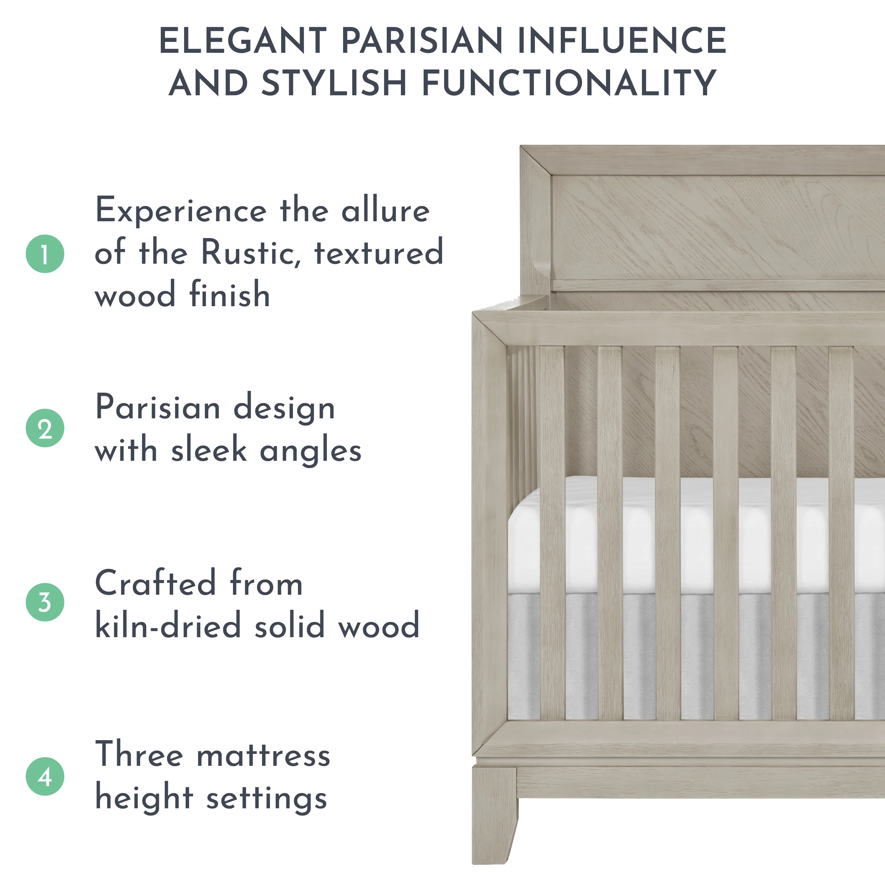 - CHIC PARISIAN STYLE: Designed with elegant Parisian influence and stylish functionality, this crib is available in 2 sophisticated finishes - Porcini & Greyhound, that blend well with most nursery decor themes.