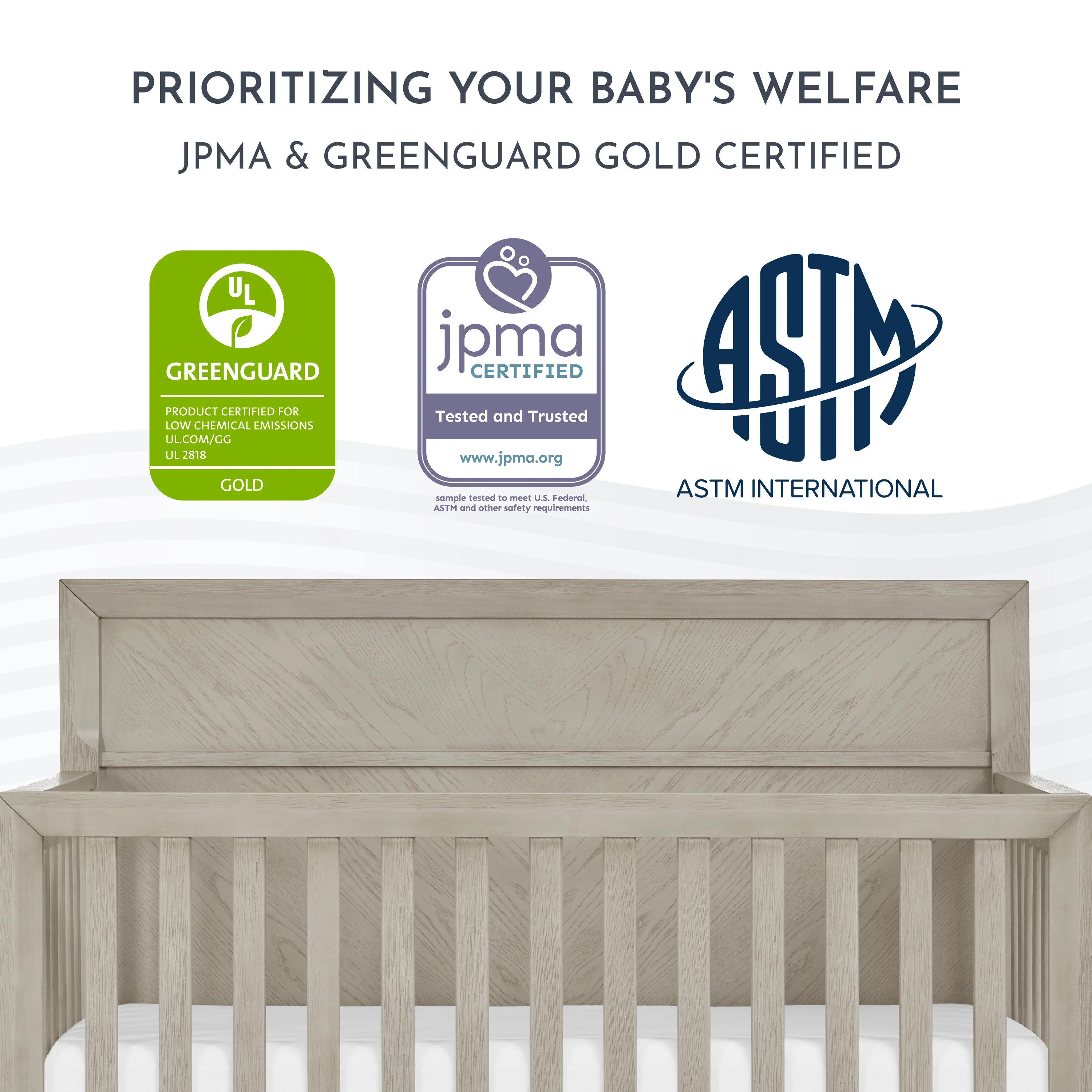 - SAFETY FIRST: The Lourdes 5-in-1 Convertible Crib is built to the highest safety standards and is both JPMA & Greenguard Gold certified.