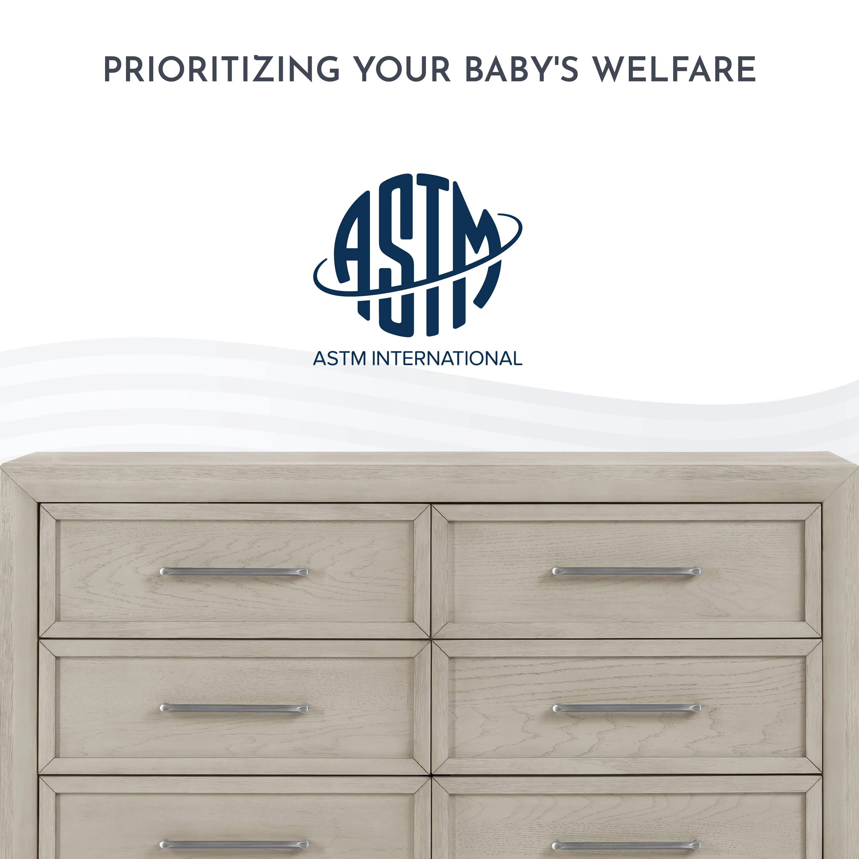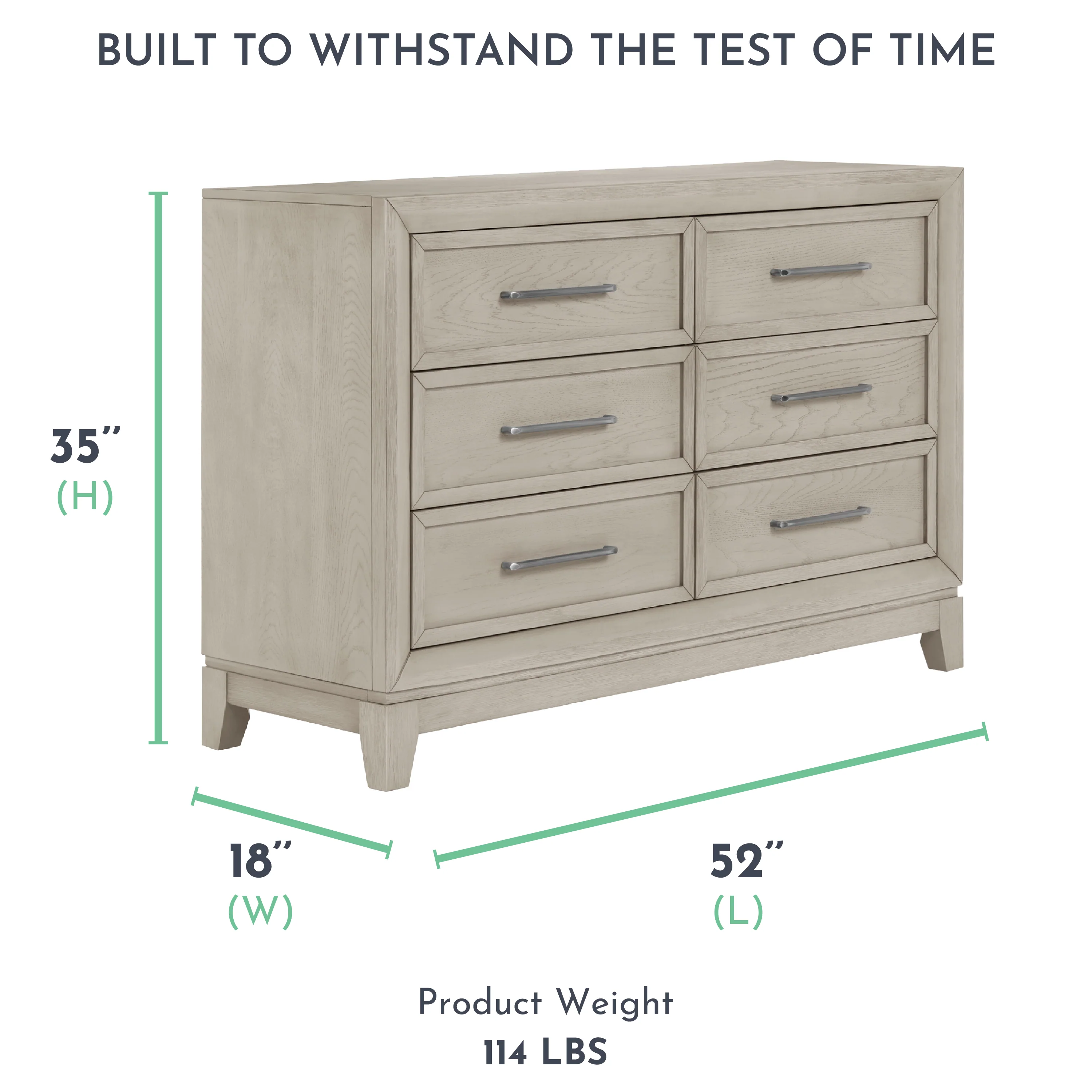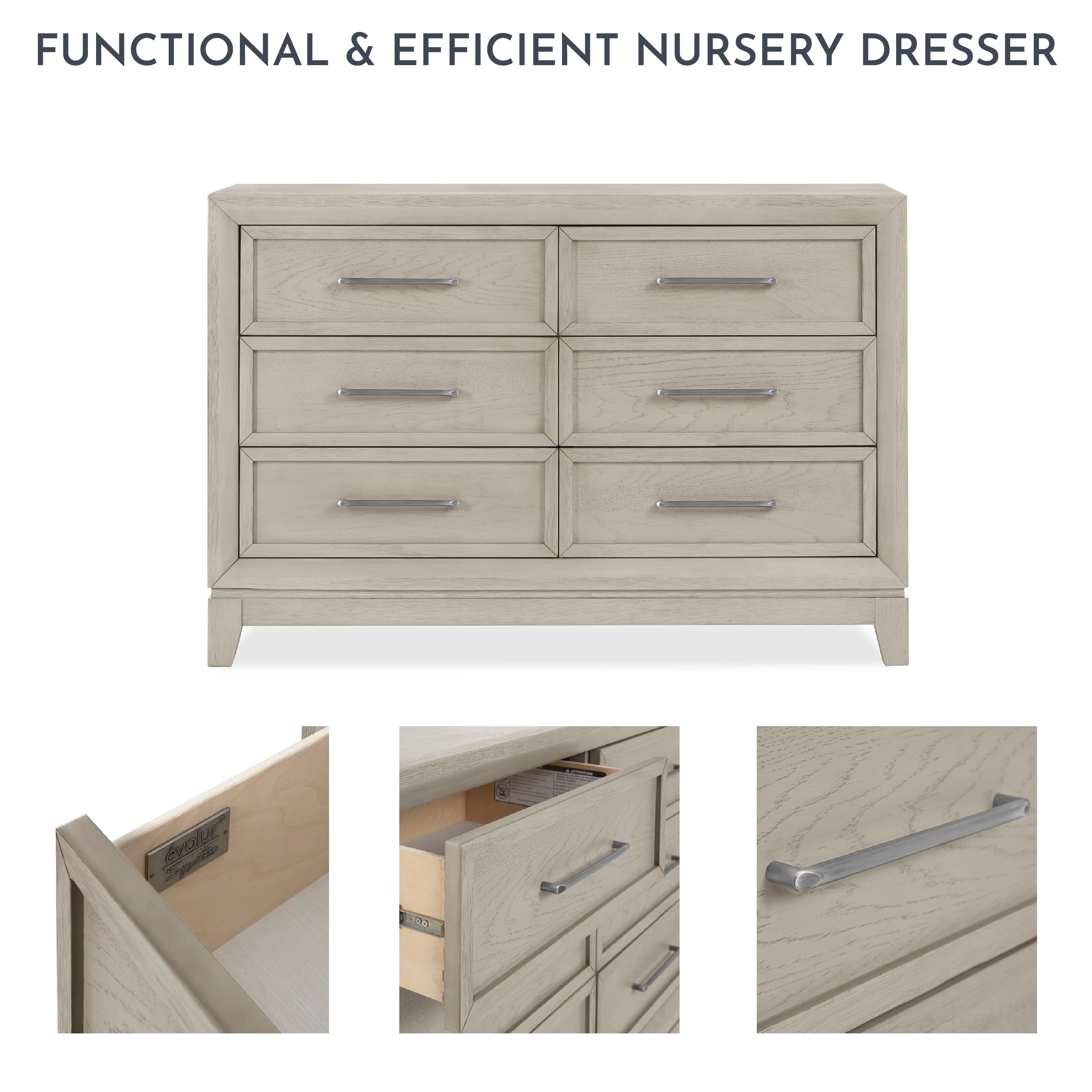 Bringing not only a charming, modern design but also adding useful storage to your child’s nursery is the Evolur Lourdes Double Dresser. Designed with influences of sleek, unique Parisian craftsmanship, this double dresser is a tasteful addition to your home and nursery. With 6 spacious drawers, there’s plenty of room to neatly organize your little one’s clothes, toys and essentials. The strong and sturdy Lourdes Double Dresser is crafted with unique Dovetail joints - a recognized mark of precise craftsmanship. Offering an ageless look and feel, this elegant crib is made with robust kiln-dried hardwood and tied together with an Oak Veneer finish that accentuates the beautiful wood grains. Prioritizing your safety, the Lourdes Double Dresser comes with an anti-tipping kit and meets/exceeds ASTM standards. It comes in 2 charming finishes - Porcini & Greyhound. Complete your dream nursery by pairing this must-have double dresser with the 5-in-1 Convertible Crib & Changing Tray from the Evolur Lourdes Collection. The product has dimensions of 52 L x 18W x 35 H,