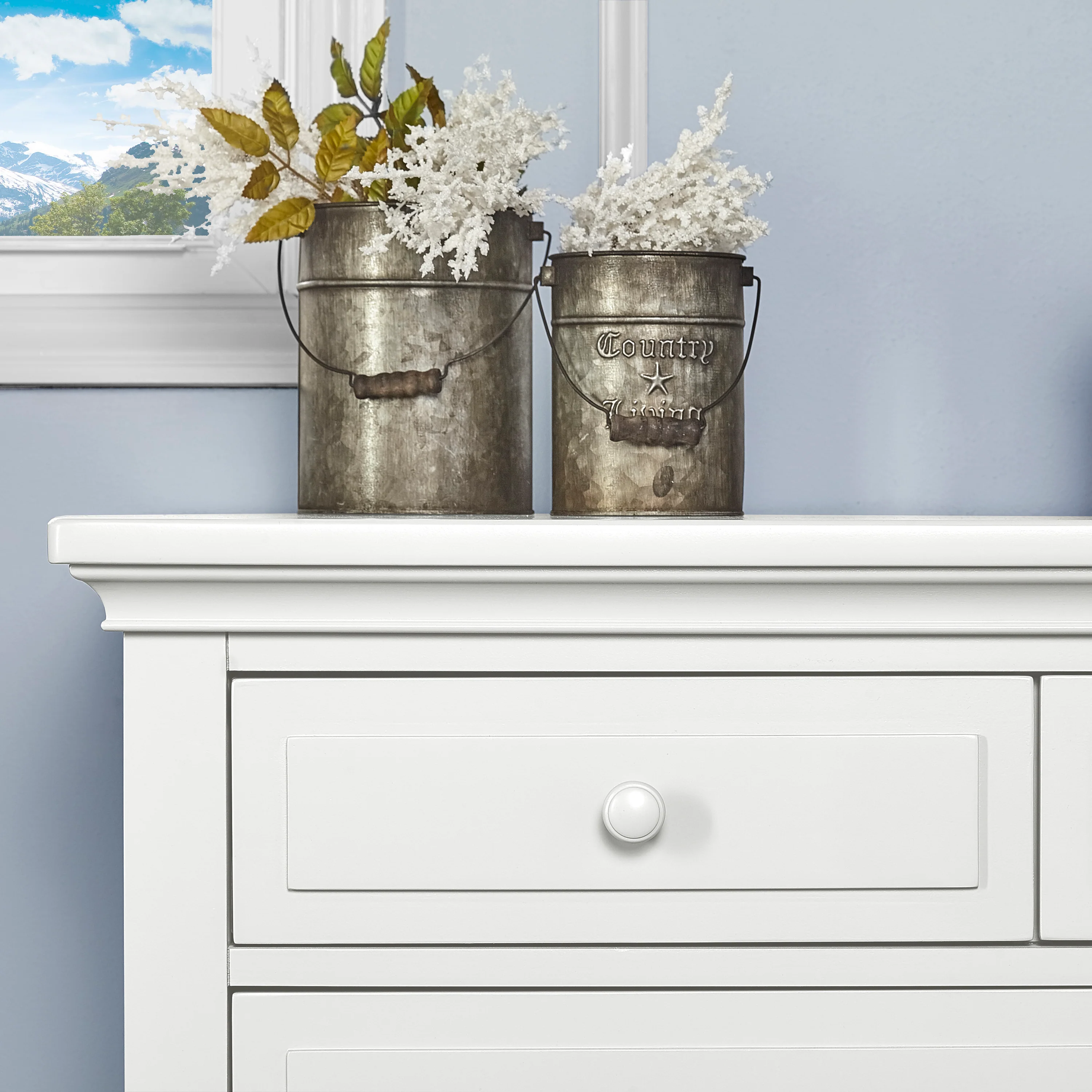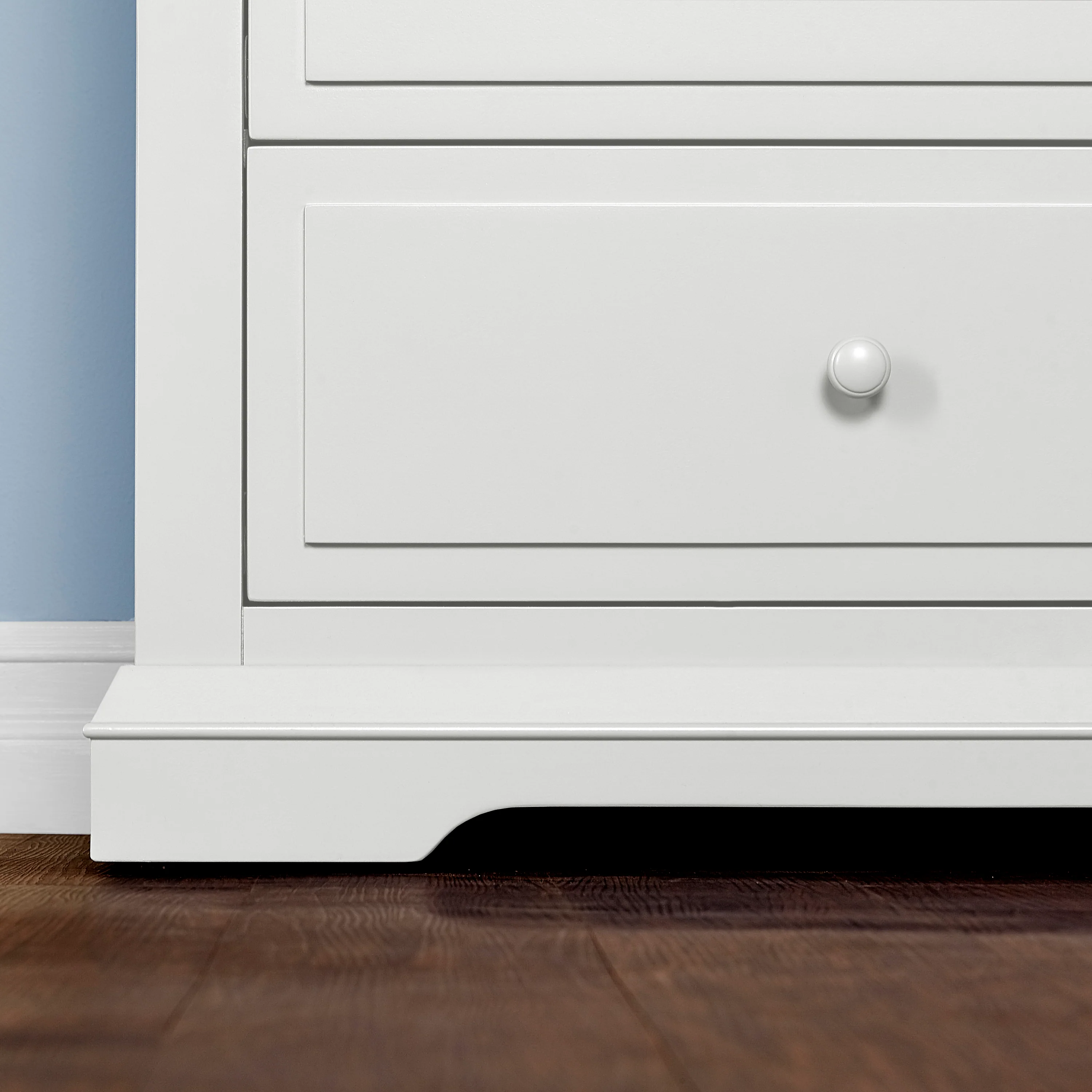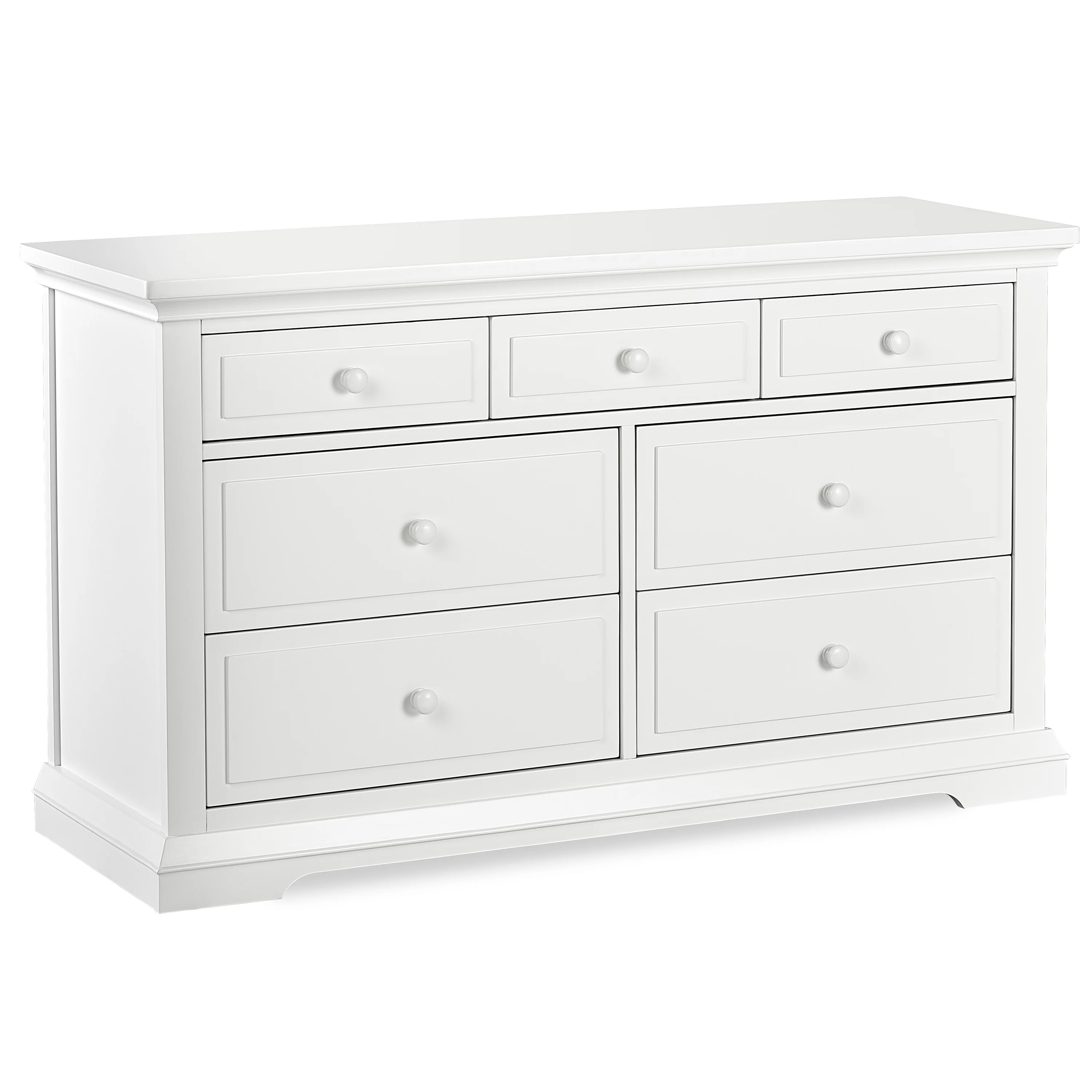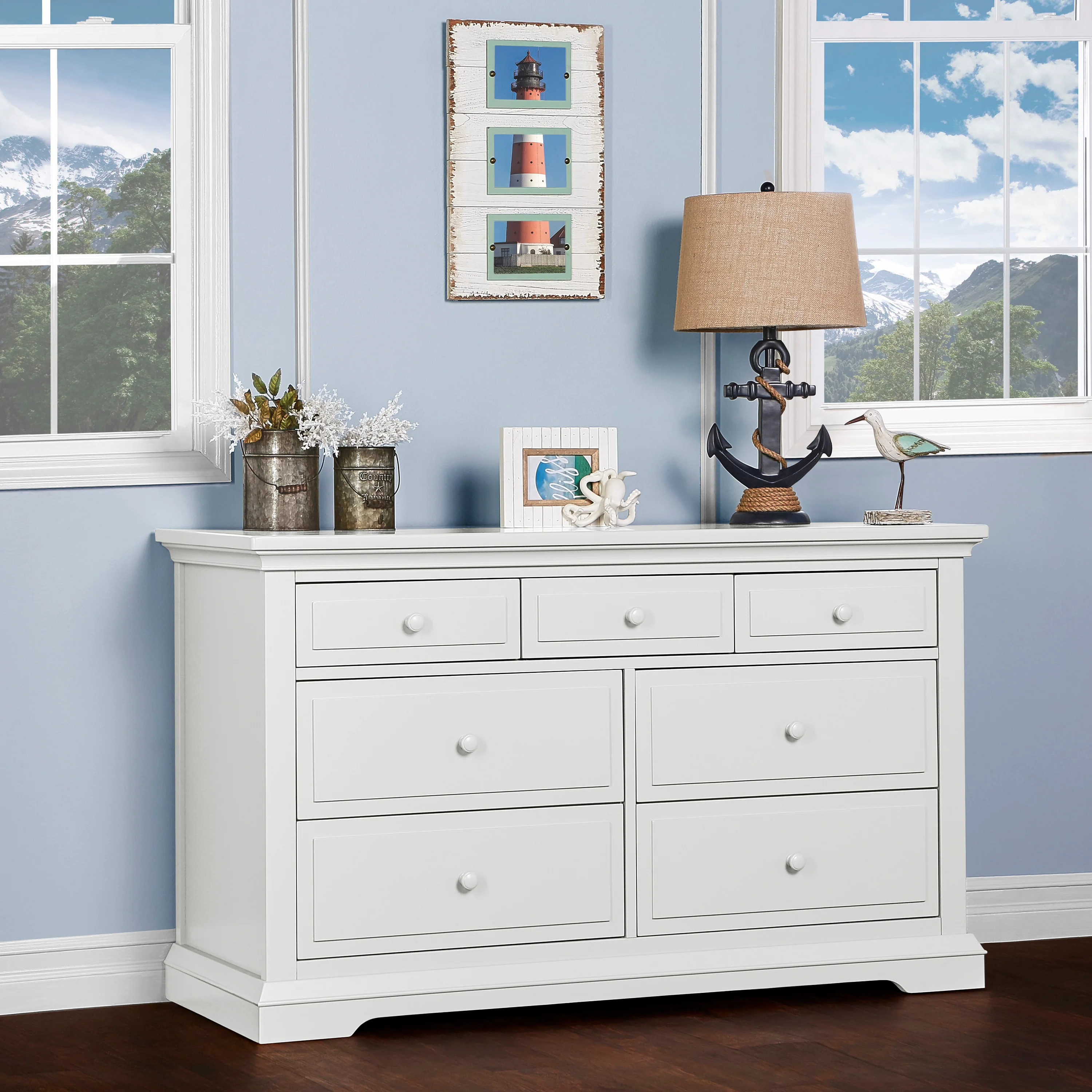 Transitional in design, the Evolur Parker 7 drawer double dresser provides a soft contemporary appeal to the ever changing styles of nursery design. The dresser features seven drawers with ample storage space for clothes and other essentials. The drawers feature wooden drawer pulls, quality side-mounted 3 tier glides and English dovetailed construction, to help provide durability over the years with its quality materials, craftsmanship and its forward-thinking functionality. This double dresser can serve as a changing surface by adding a contour pad (sold separately). The Evolur Parker 7 drawer double dresser is available in Distressed White, Stone, and Pebble Gray finish. This double dresser is paired beautifully with its matching crib and chifferobe, to complete your nursery each sold separately.