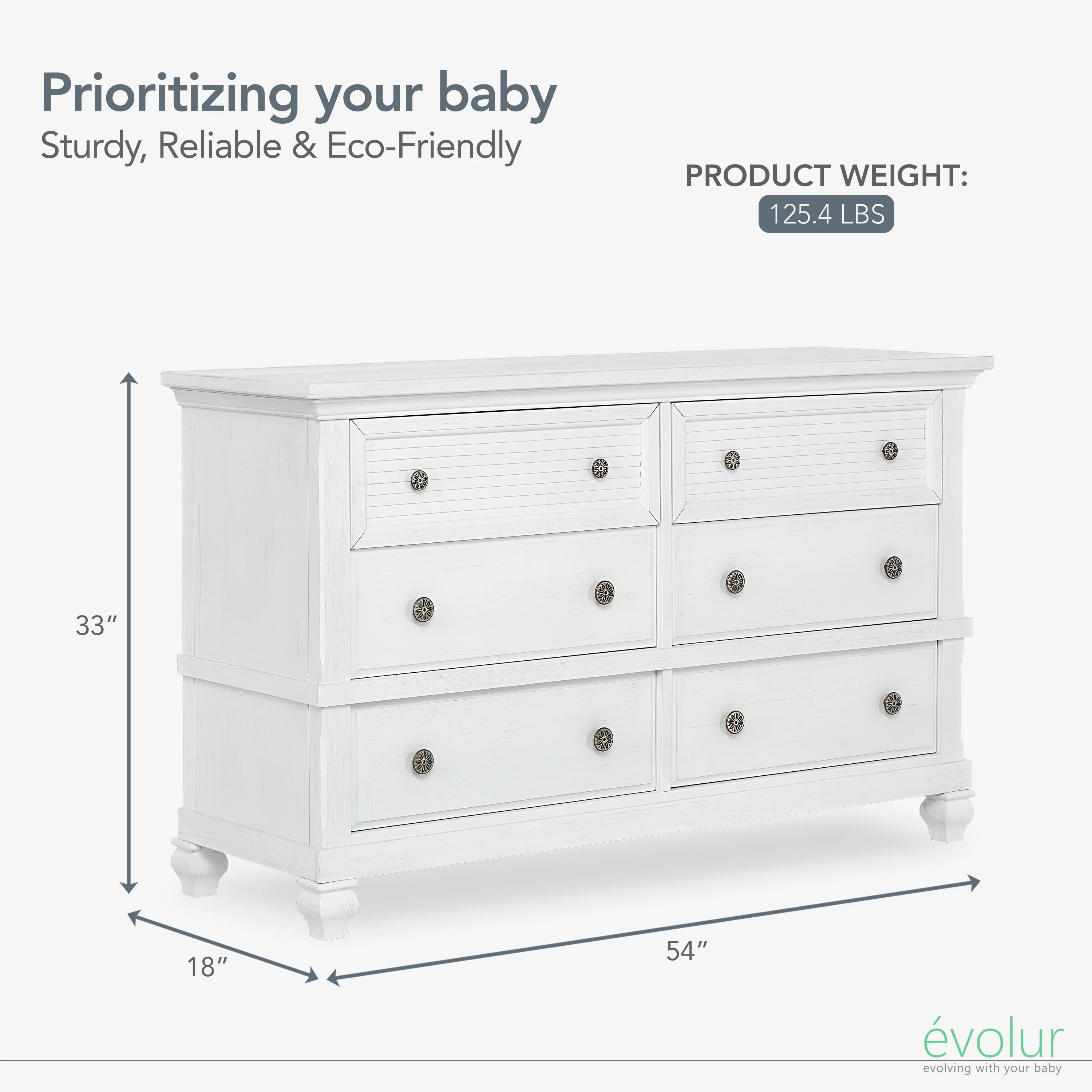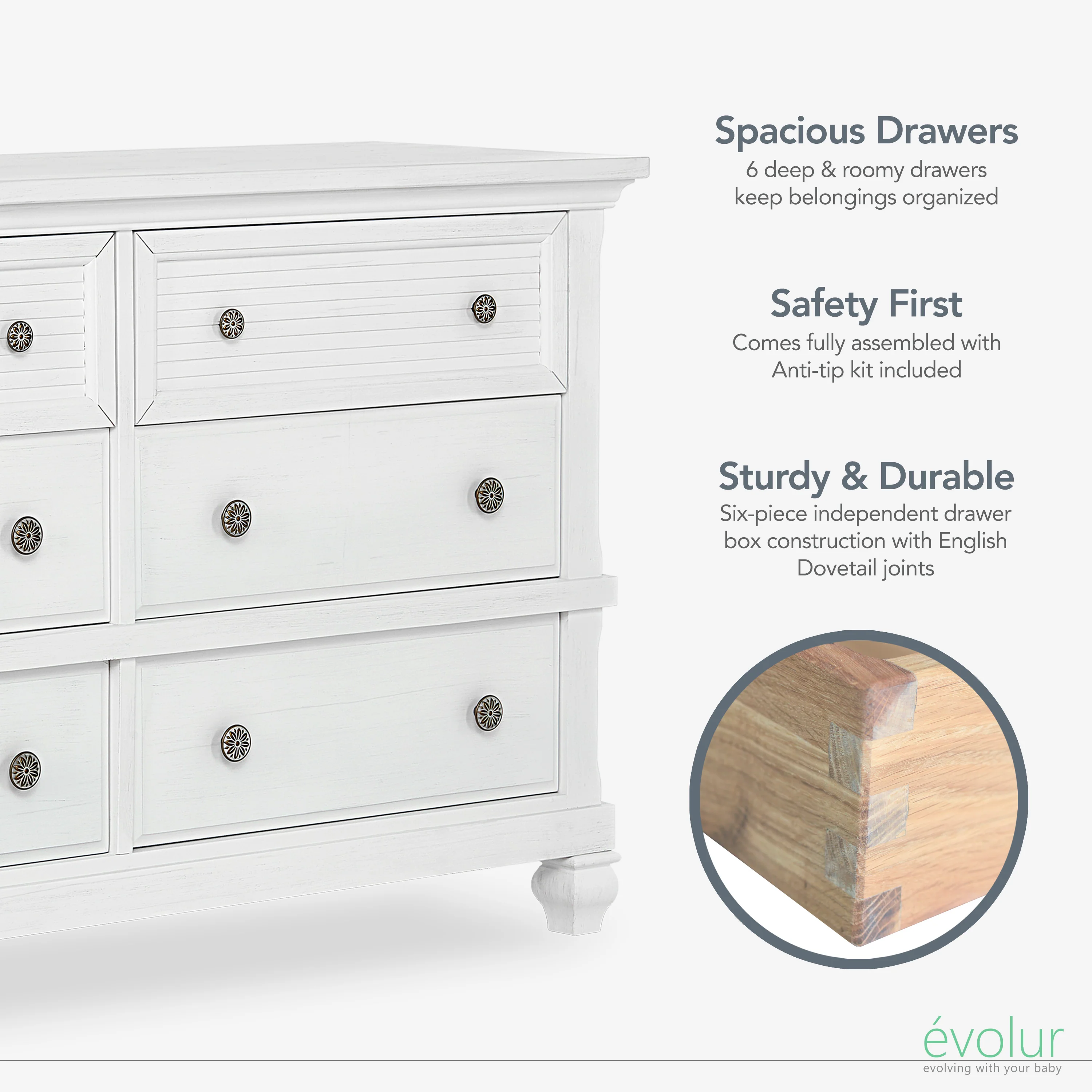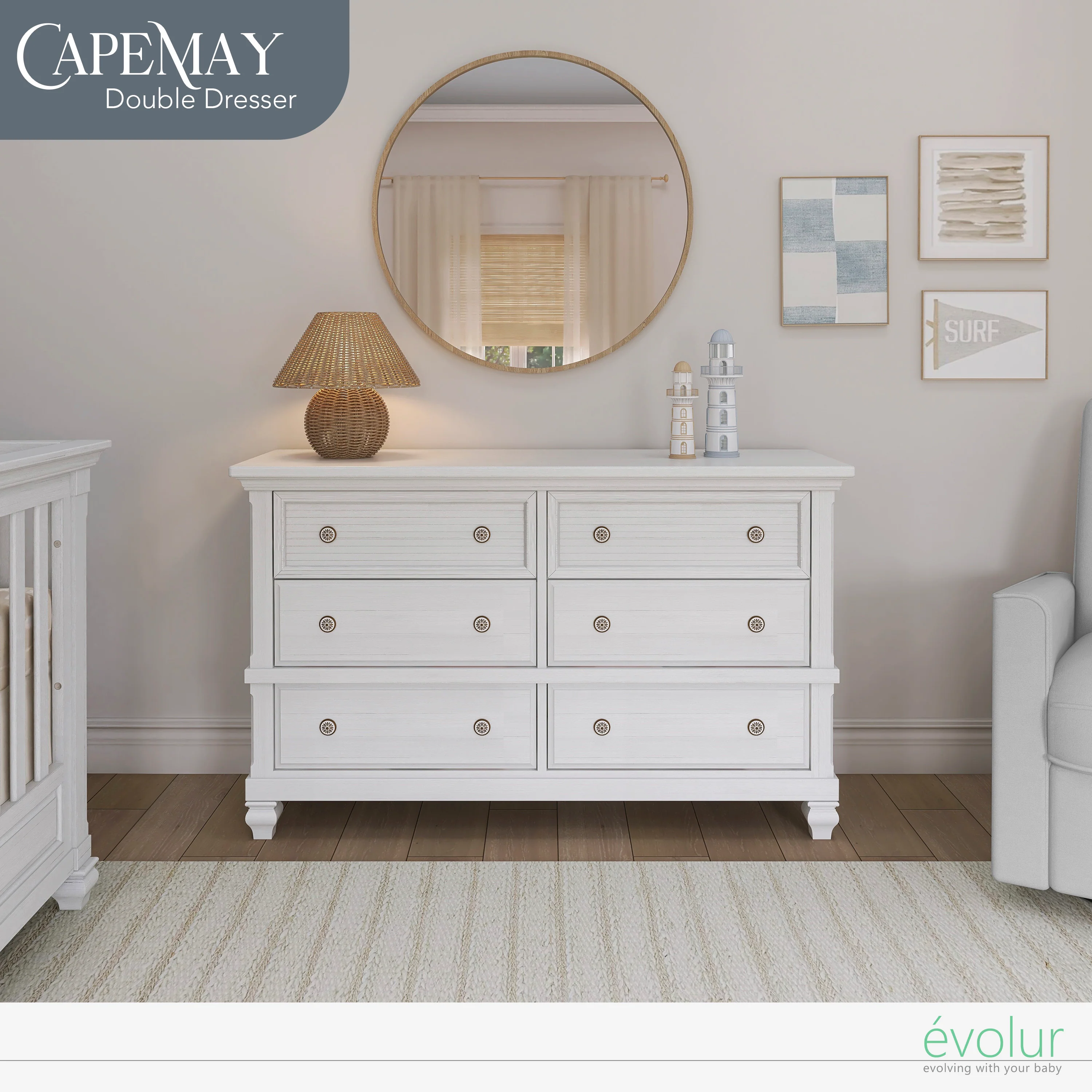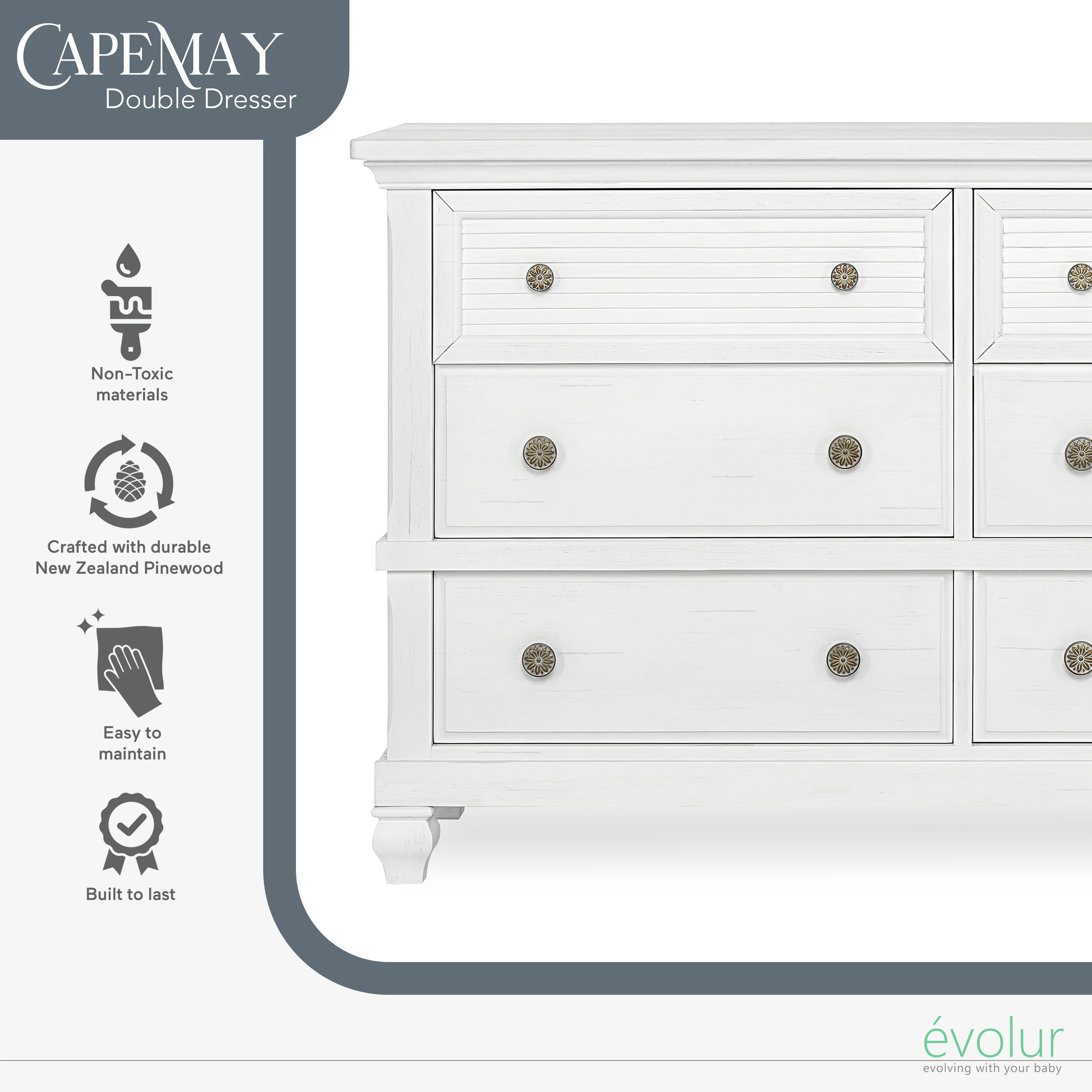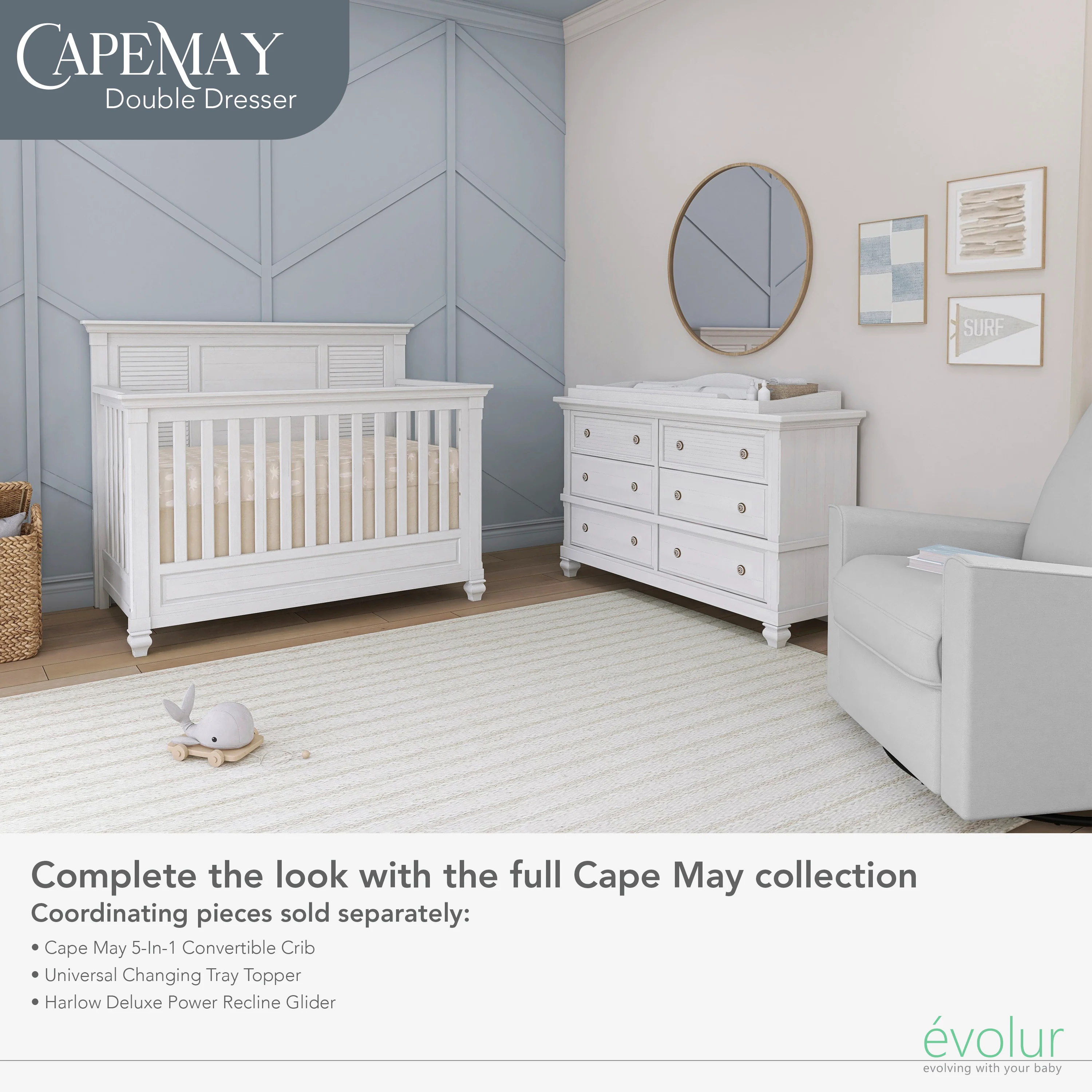 Evolur Signature introduce its Cape May collection which is inspired by elegant coastal living. This collection is reminiscent of a summer day when the sun shines happily on the cool blue ocean. The Cape May dresser offers a beach house design showcasing shutter panel with framed drawer fronts surrounded by substantial molding. This dresser has seven drawers with metal weathered pull which transform your baby nursery into a seaside sanctuary with coastal wall art, sky blue rugs and crispy white accents you have carved out your own slice of paradise. Using quality materials and craftsmanship, along with forward-thinking functionality, this piece is designed to work effortlessly throughout the years. The textured and detail finish set this collection apart from all others it will take you back to the days of warm breezes, open shutters, weathered porch, or as young children we are the first out of the cars, and we start running frantically towards the ocean where the seagulls call echo in the horizon. The Cape May collection can be paired with natural elements, bead board walls, paneled ceilings, hits of aqua/sea foam for your little girl or hits of navy blue for your little boy. Let the waves of the clear blue ocean sooth your baby to sleep.