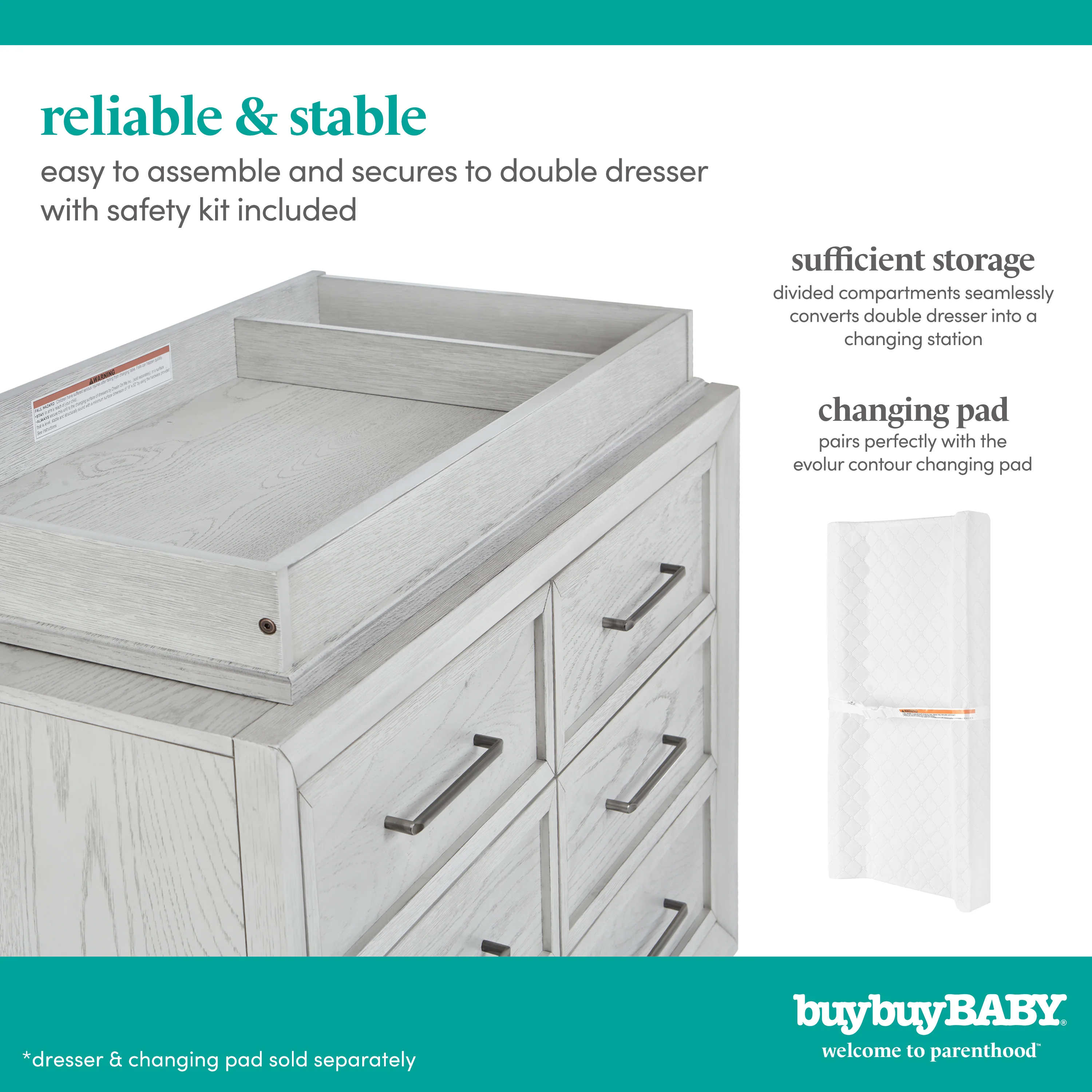- Changing pad (sold separately) fits within the topper.