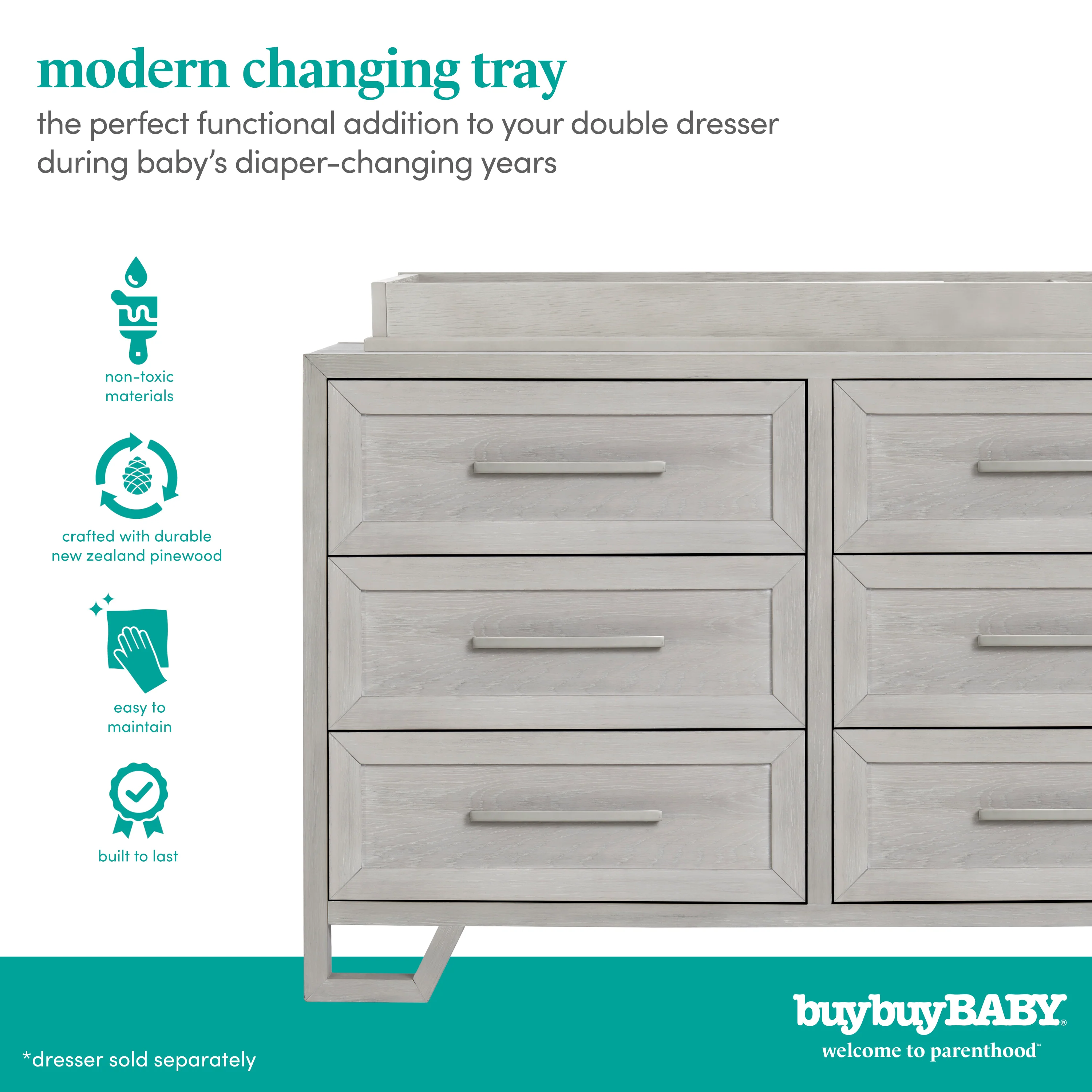The Vienna changing tray is the perfect functional addition to your double dresser during baby’s diaper-changing years. With a divided compartment, this tray will seamlessly convert the Vienna double dresser into a changing station that can keep your changing necessities close at hand. The changing tray is secured to your double-wide dresser with safety brackets. Once you are out of the diaper-changing stage, the tray can be easily removed to allow your dresser to grow with your child.