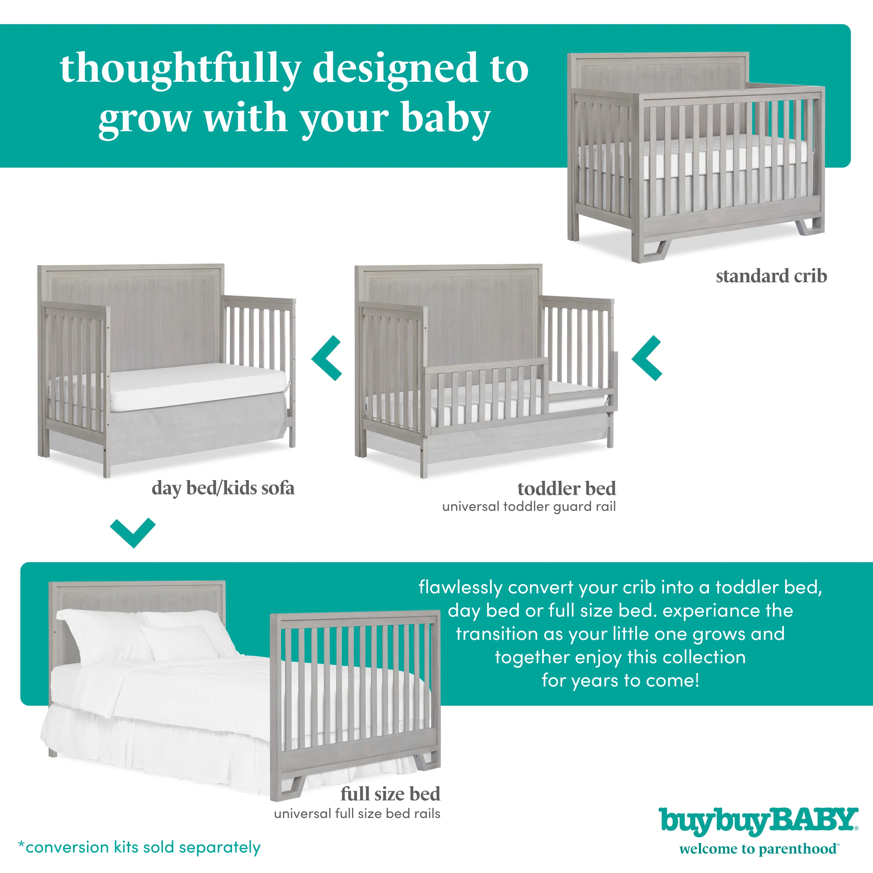 - 5 IN 1 CONVERTIBILITY: a masterpiece in nursery design that evolves with your child, this crib seamlessly transitions from crib to toddler bed, daybed, and full-size bed.