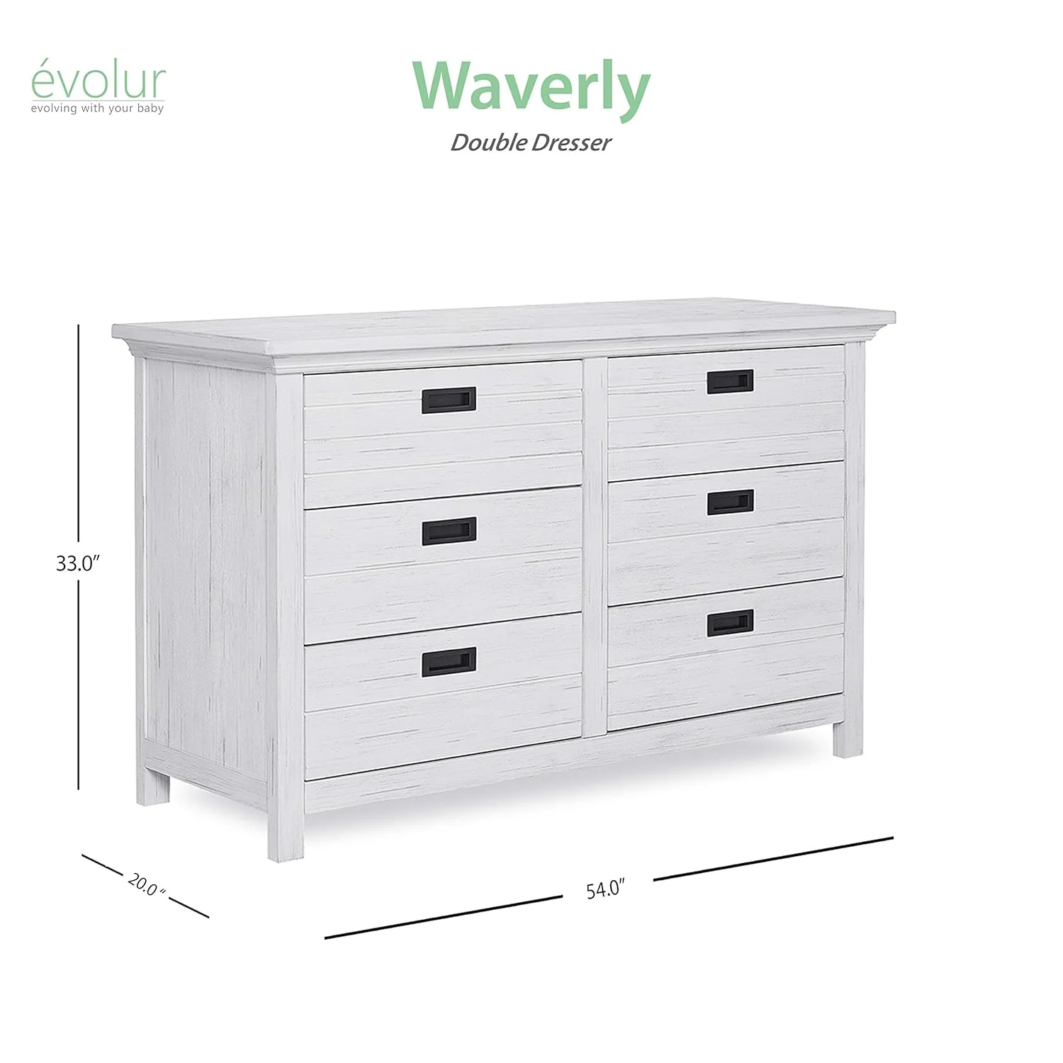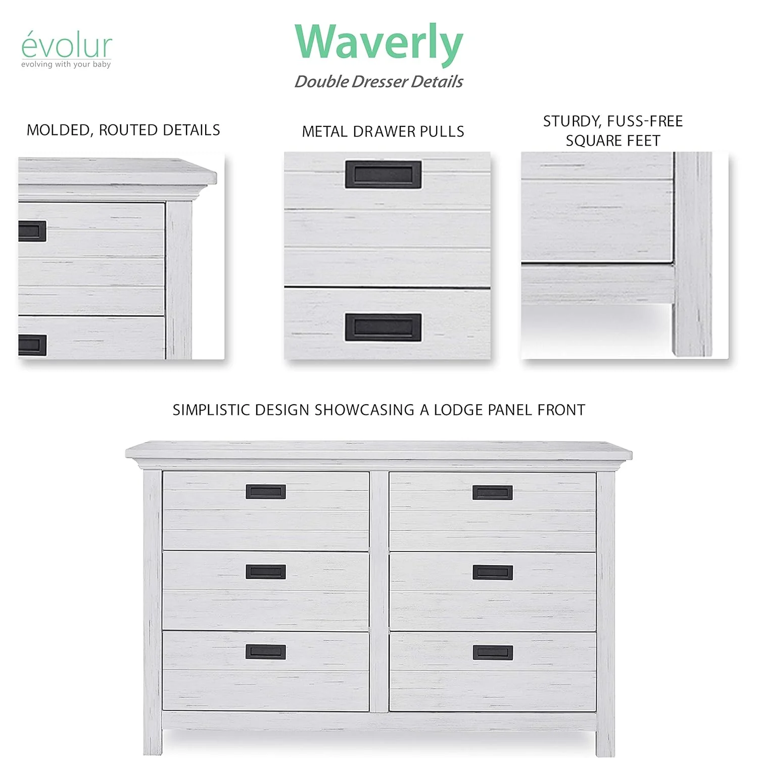 - The Evolur Waverly double dresser is designed with exquisite gender neutral offering a simplistic design showcasing a lodge panel front ,metal drawer pulls with straight lines surrounded by substantial molding.