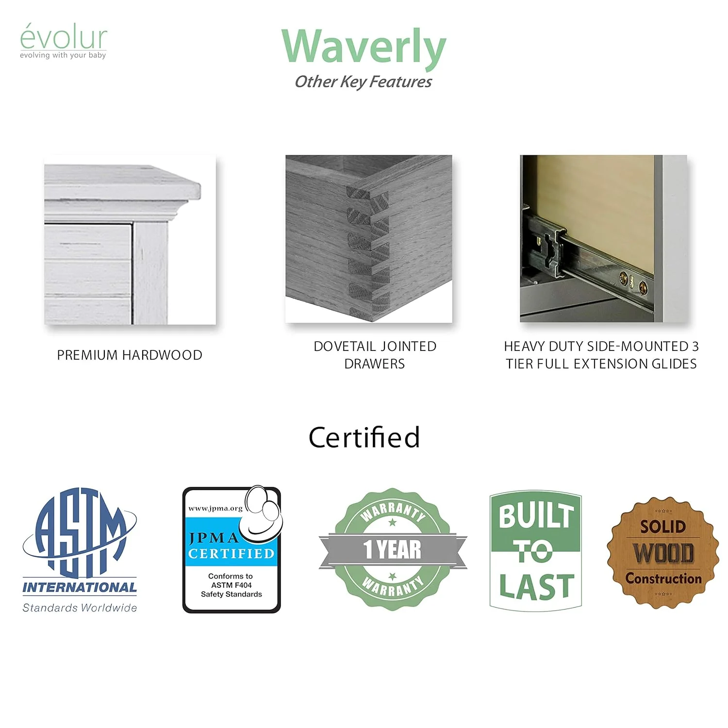 - Evolur Waverly collection offers as an array of case goods including crib, and tall chest. Also available is a universal night stand, change station tray, conversion kit and toddler rail( sold separately).