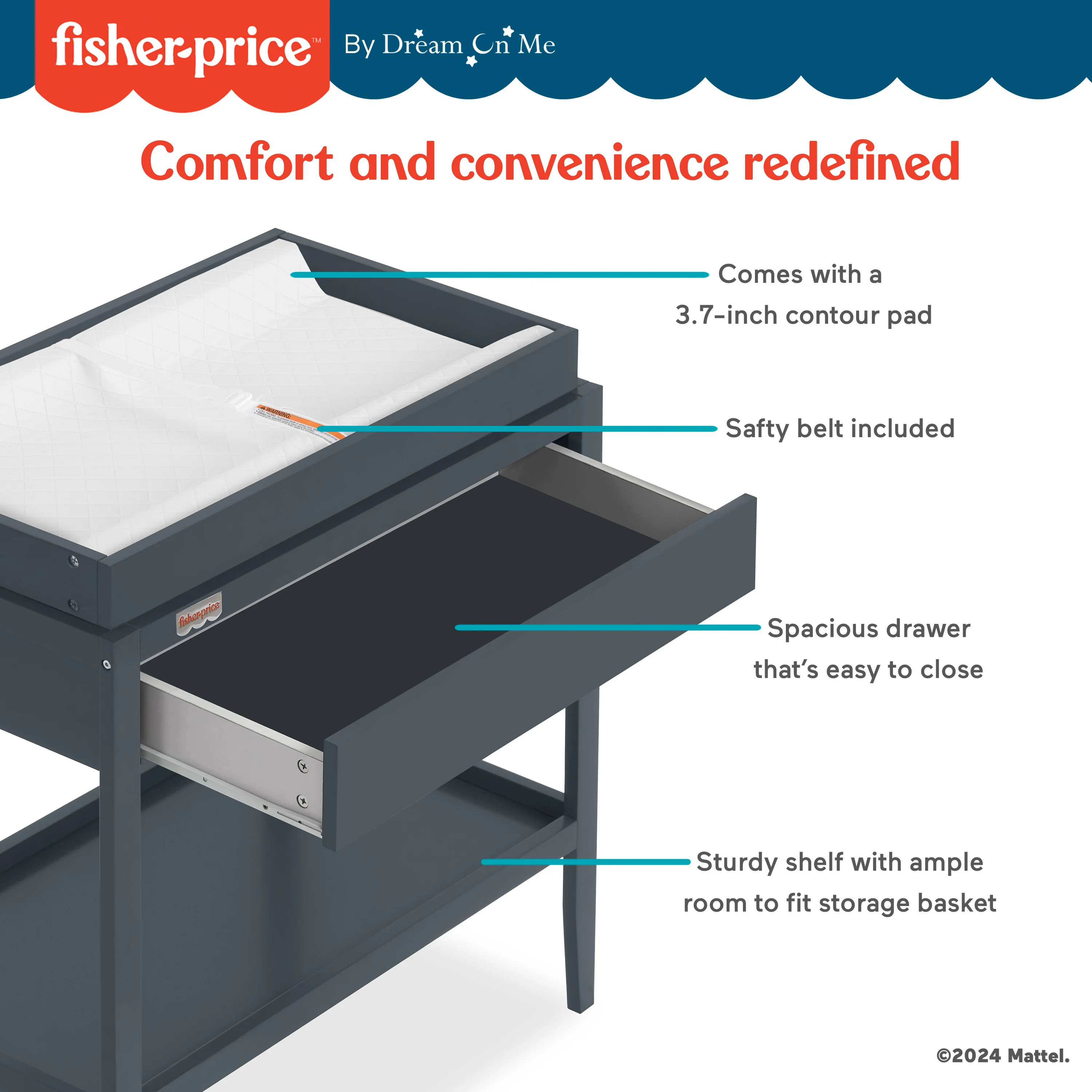 - YOUR NURSERY BFF: The Fisher-Price�?by Dream On Me Delani Changing Table is your multi-purpose nursery BFF! With a sturdy shelf that provides ample storage, keep your changing necessities within reach, and you'll be done in no time.