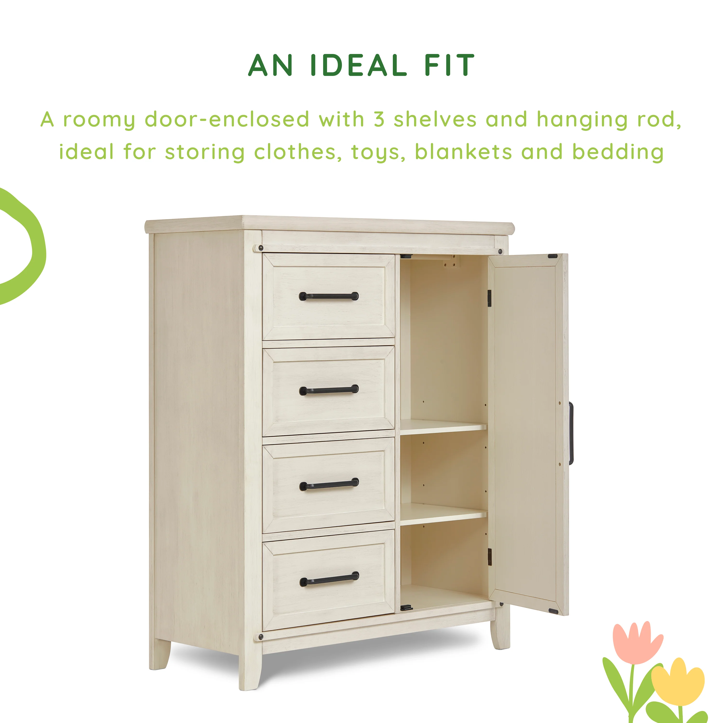 - AN IDEAL FIT: The Sweetpea Baby Bayfield Chifferobe comes with 4 spacious drawers, a roomy door-enclosed with 3 shelves and hanging rod, ideal for storing clothes, toys, blankets and bedding.