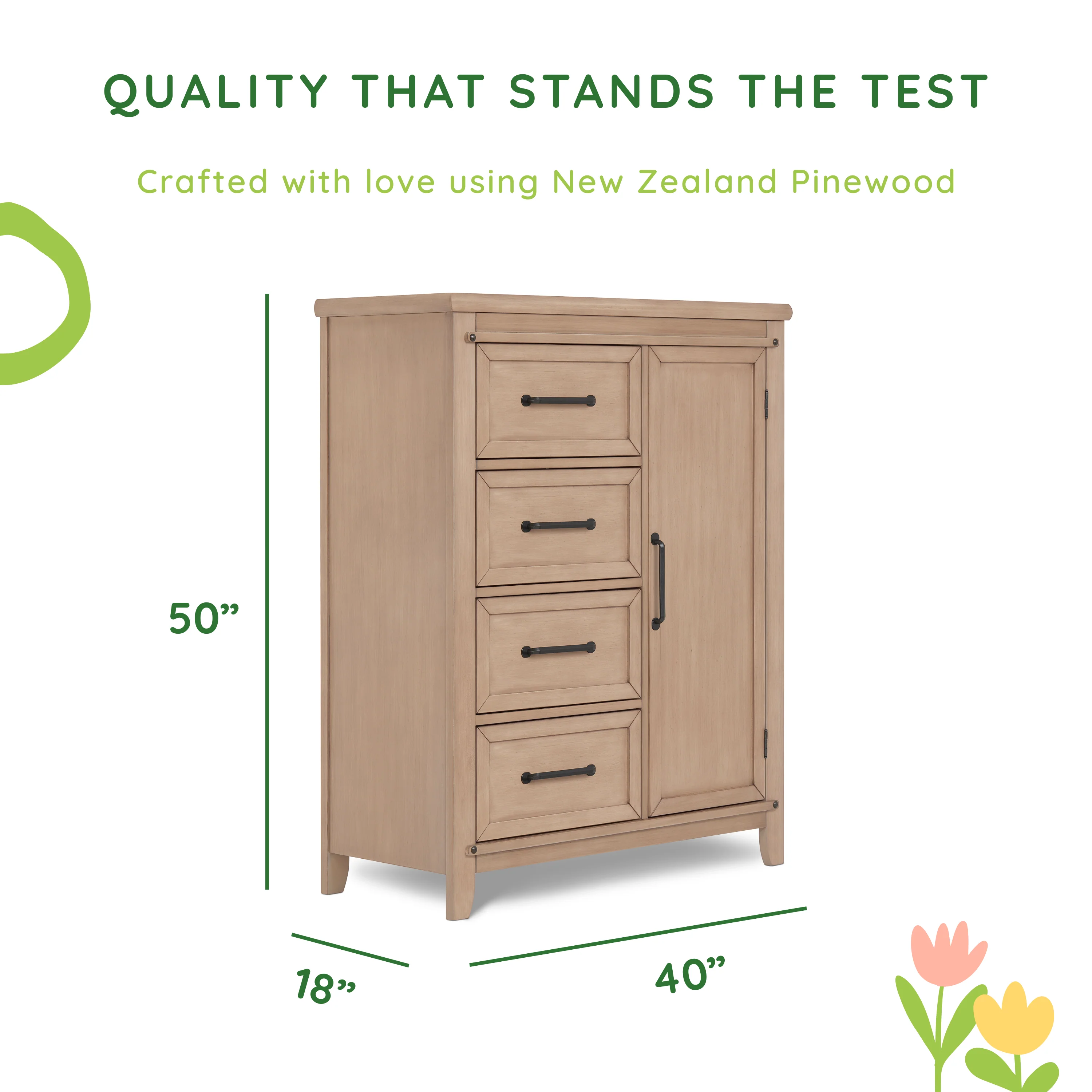 A stunning, sleek storage solution that adds a whole lot of character and charm to your nursery. The Sweetpea Baby Bayfield Chifferobe comes with 4 spacious drawers, a roomy door-enclosed with 3 shelves and hanging rod, ideal for storing clothes, toys, blankets or bedding. Keeping your convenience in mind, this thoughtfully designed, easy-to-maintain case piece is crafted using sustainable New Zealand Pinewood. Safety is our priority and the Sweetpea Baby Bayfield Chifferobe is no exception as it is ASTM certified. Available in 2 classy finishes - Glazed Brush White and Sand Dunes, pair this Chifferobe with our 5-in-1 Convertible Crib, Changing Tray and Double Dresser from The Bayfield Collection to create a unique nursery setup. Product dimensions are 55.33�?L x 25.20�?W x 16.19�?H, with a weight of 155 Lbs.