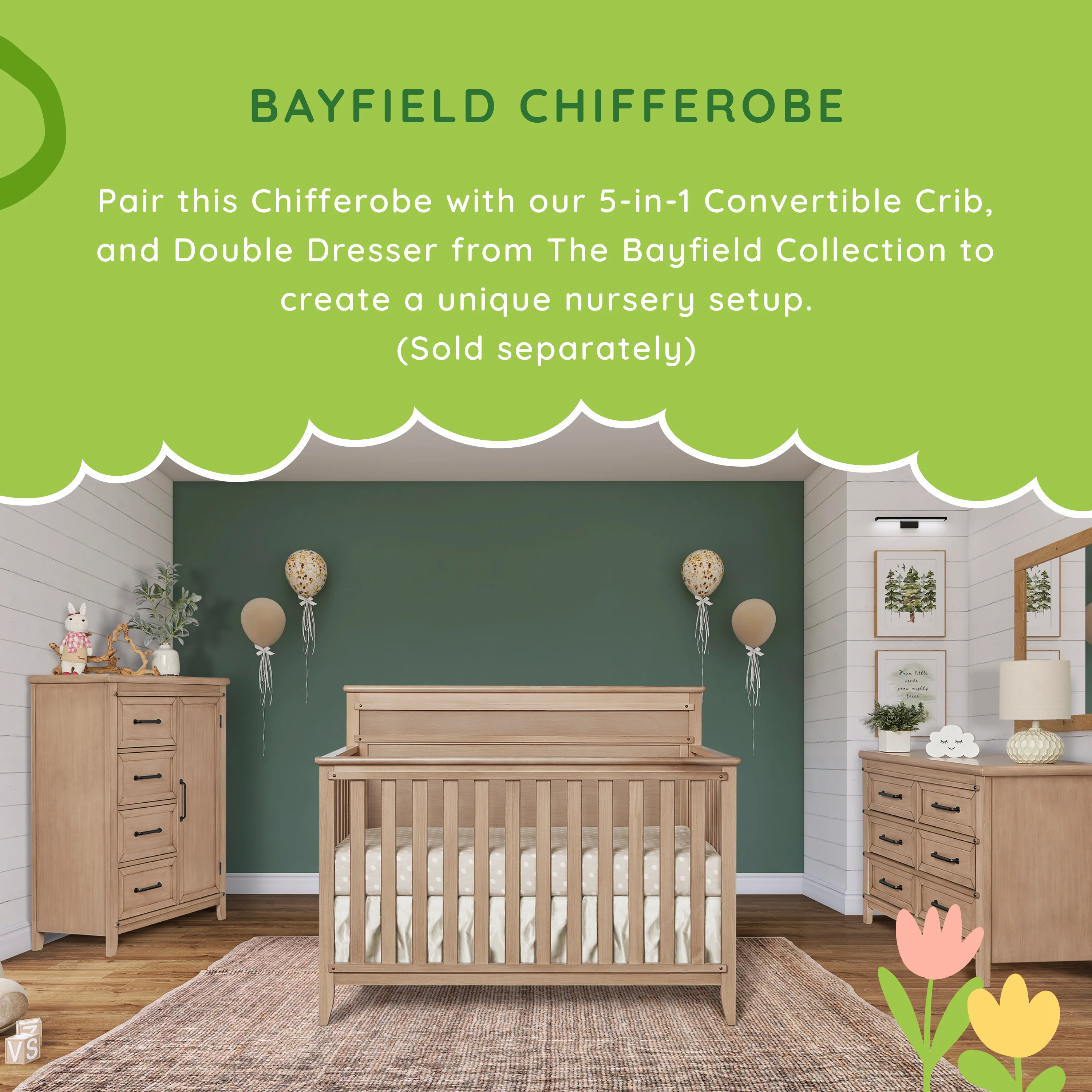 - UNIQUE &CHARMING: Available in 2 classy finishes - Glazed Brush White and Sand Dunes, pair this Chifferobe with our 5-in-1 Convertible Crib, Changing Tray and Double Dresser from The Bayfield Collection to create a unique nursery setup.