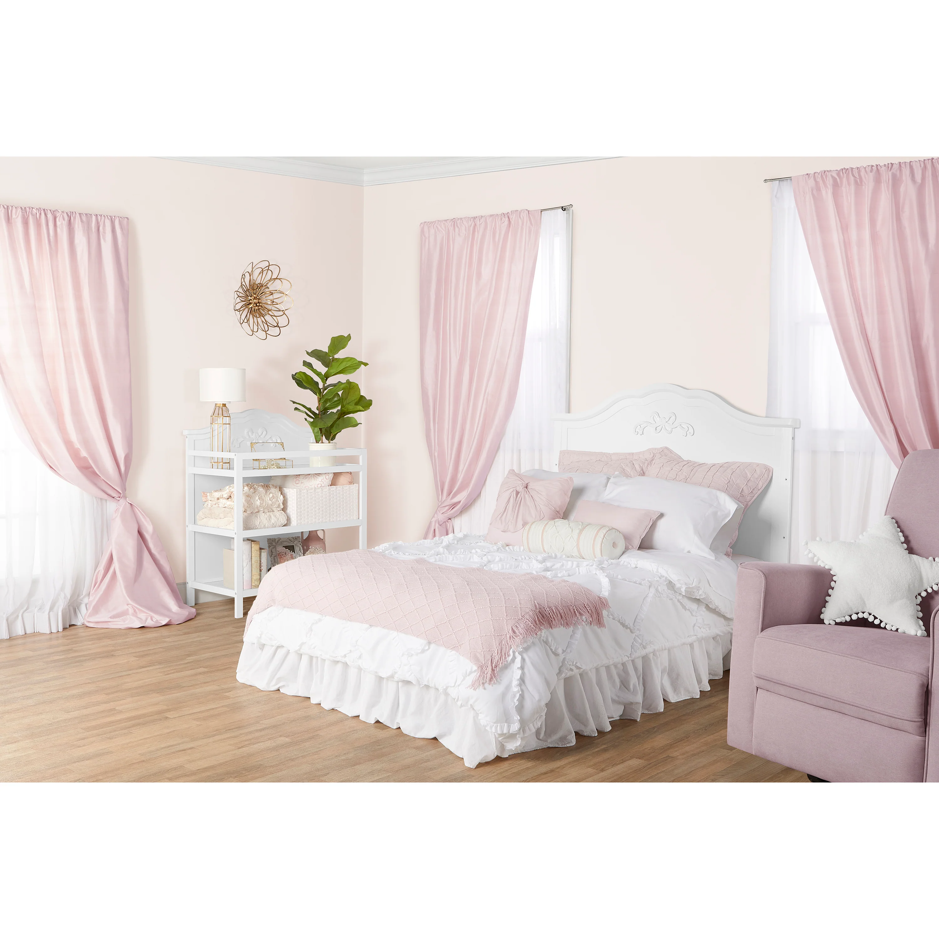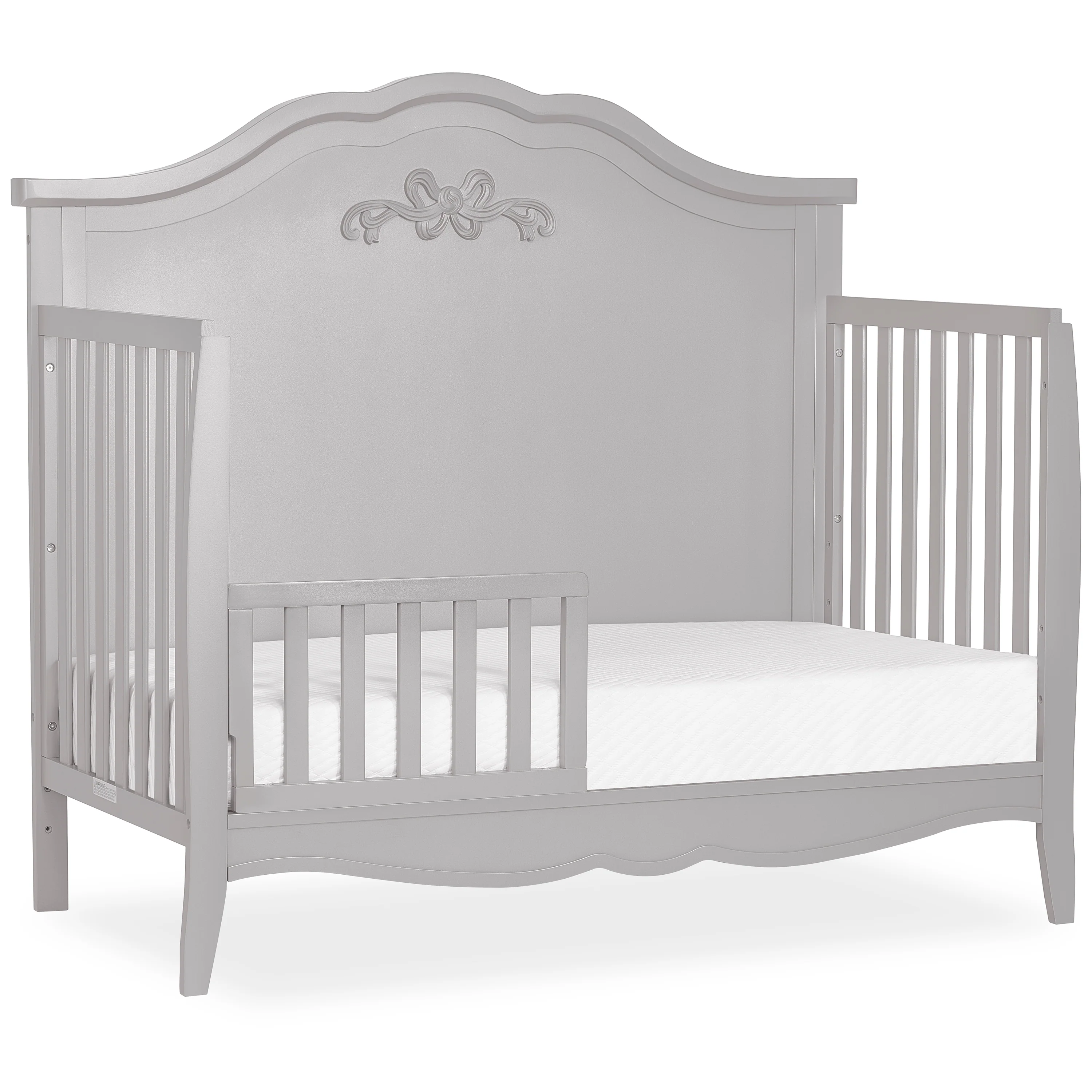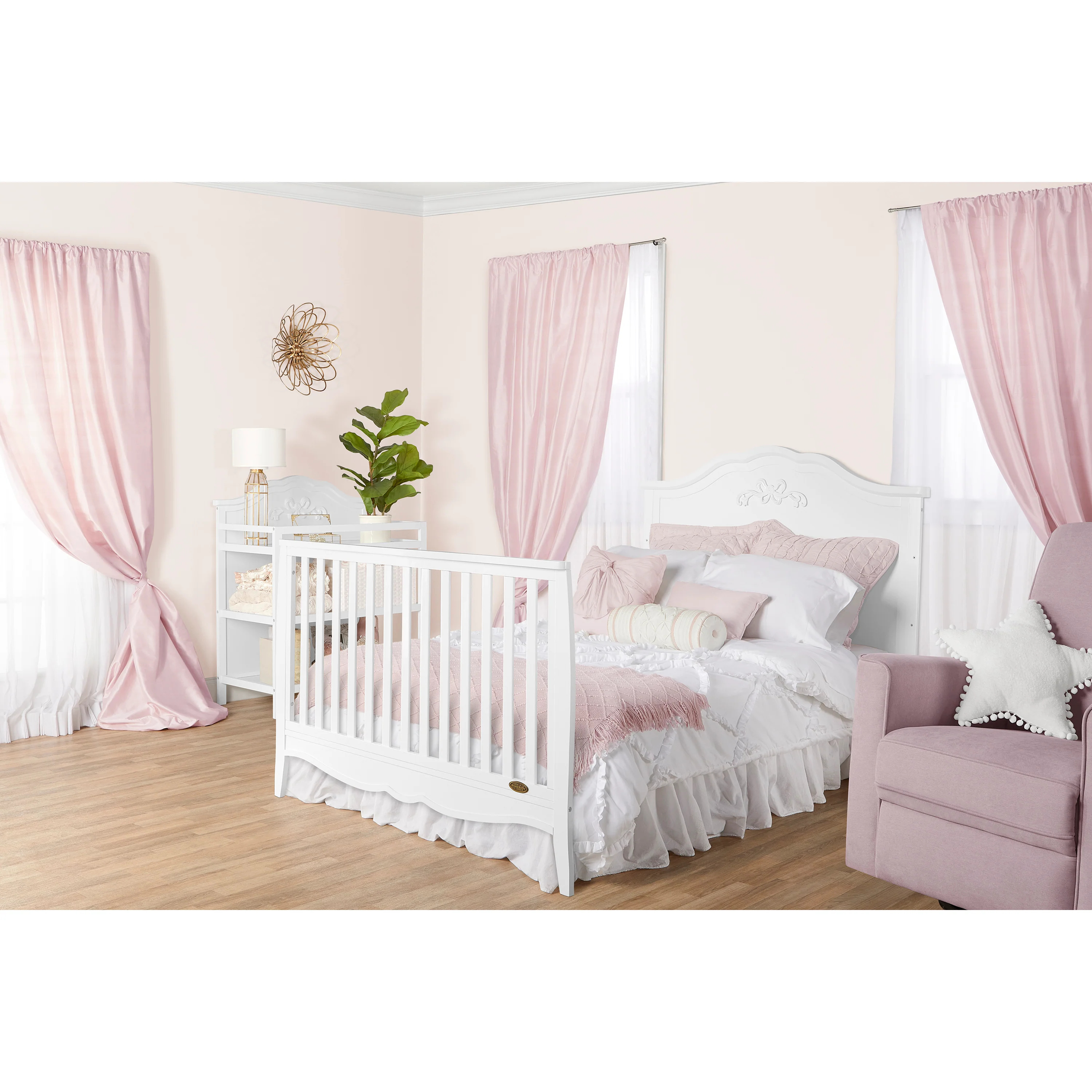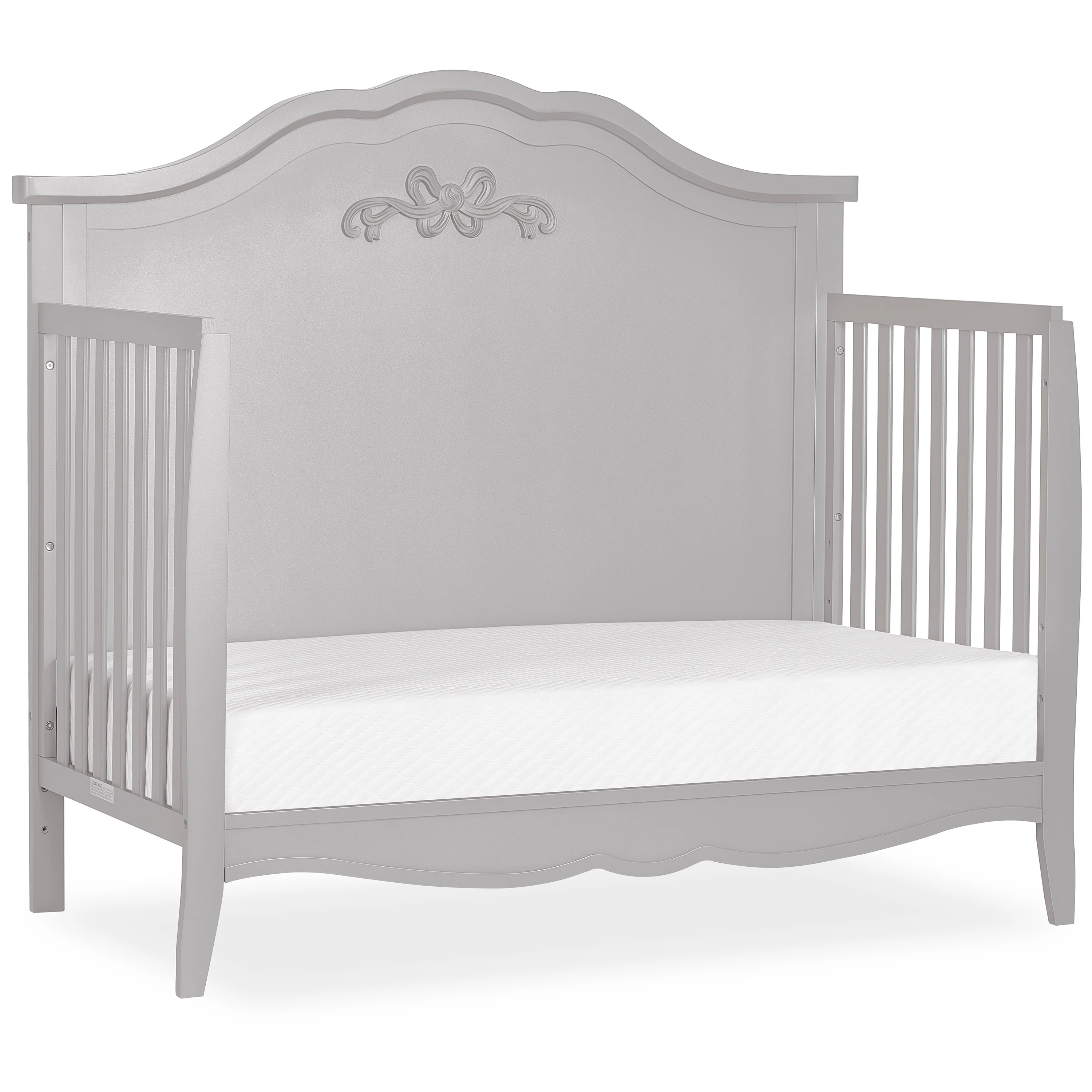 For magical dreams and sweet slumber comes the ever-so-quaint and charming Sweetpea Baby Jasmine 4-in-1 Convertible Crib. This precious crib grows with your little one as it easily transitions to a daybed, toddler bed, and full-size bed (conversion kit sold separately). Made of solid New Zealand Pinewood, it comes with a metal mattress support for added stability. With an easy-to-clean finish and 3 mattress height settings as your baby grows, it’s designed for convenience. In addition, this convertible crib prioritizes safety as it is JPMA and Greenguard Gold certified, meeting/exceeding all ASTM & CPSC safety standards. What’s more, with the Jasmine Convertible Crib, the magic lies in the details. This beautiful crib boasts of intricate carving on the headboard for that added touch of whimsy. Combined with 3 evergreen finishes �?Blush Pink, White, and Platinum �?it’s a must-have for any new nursery!