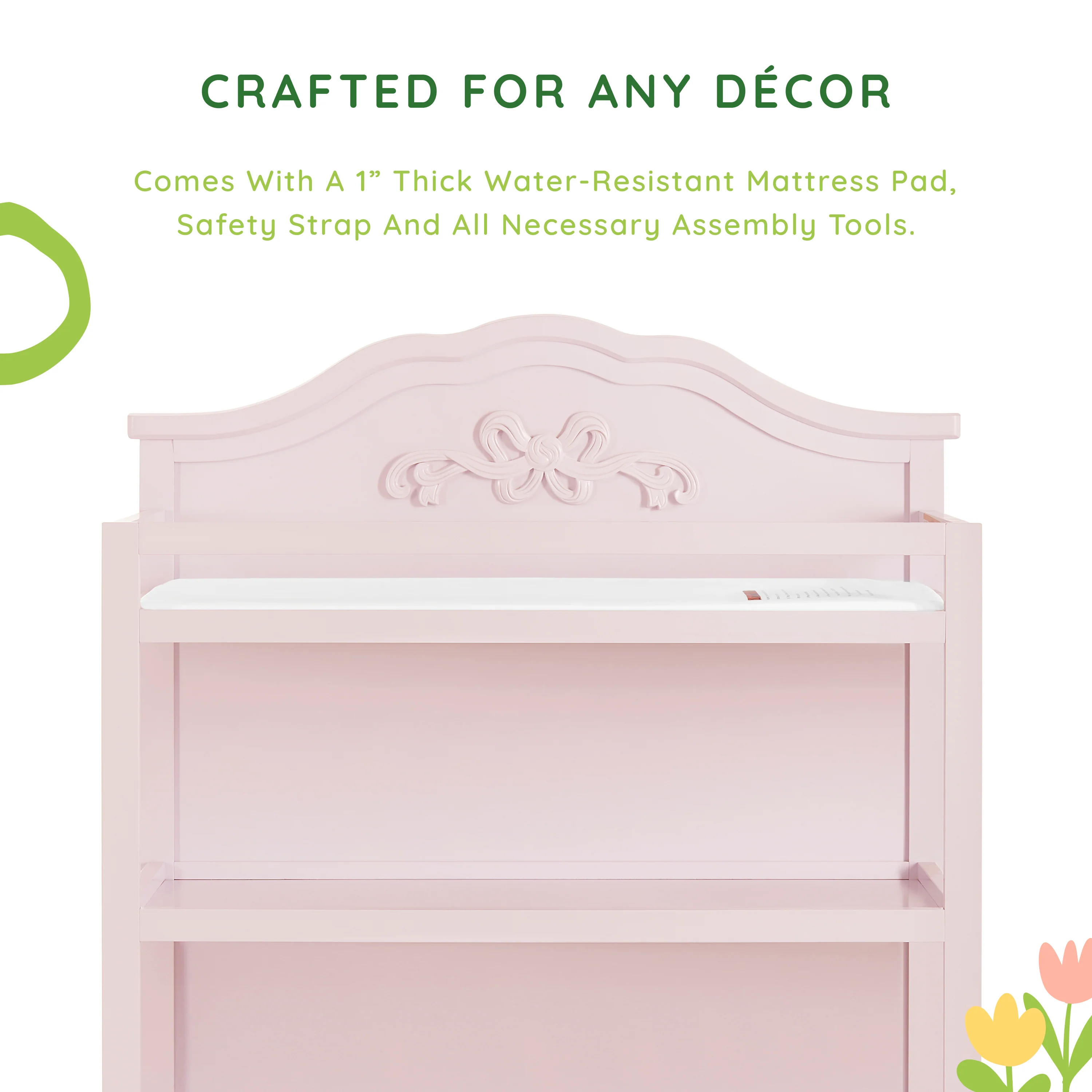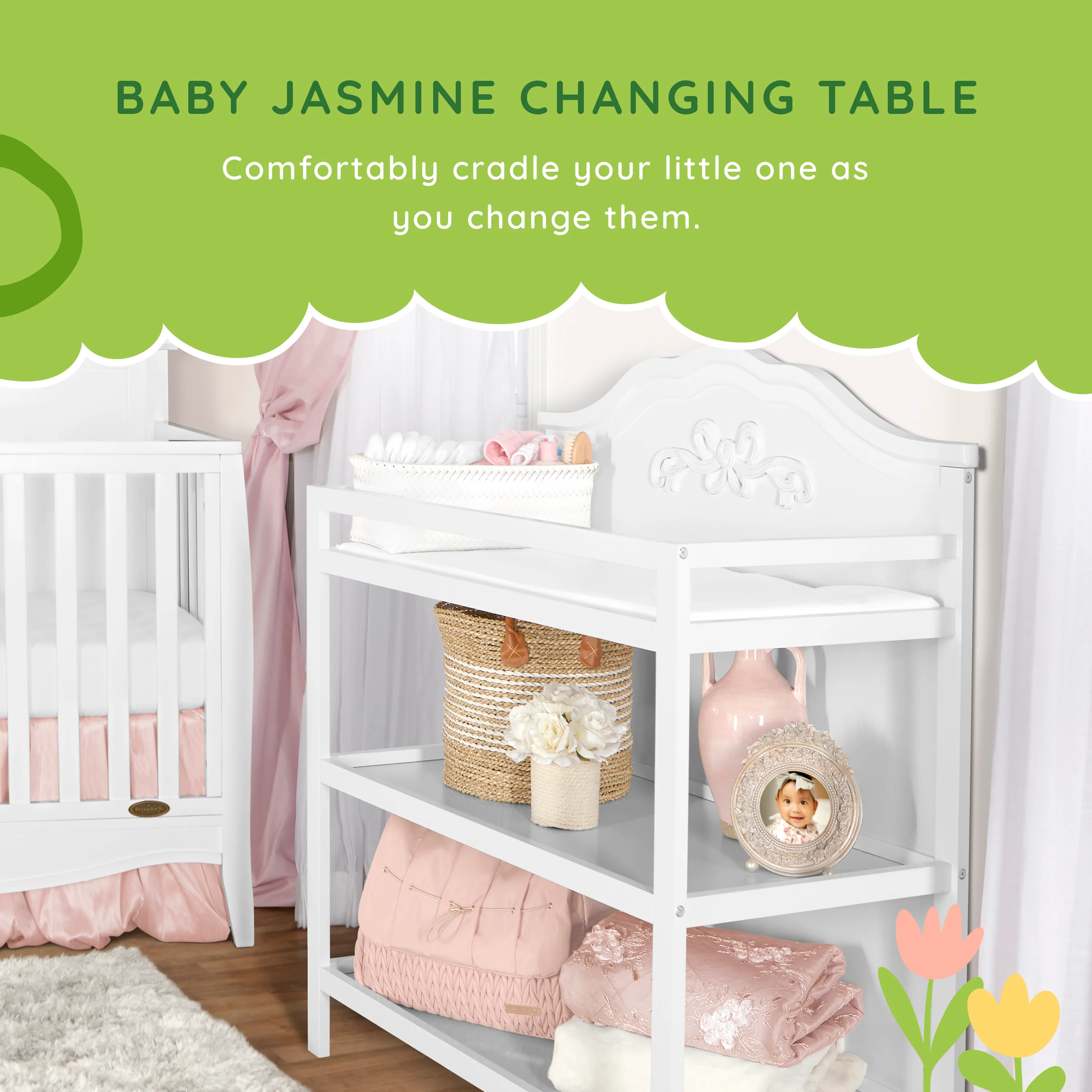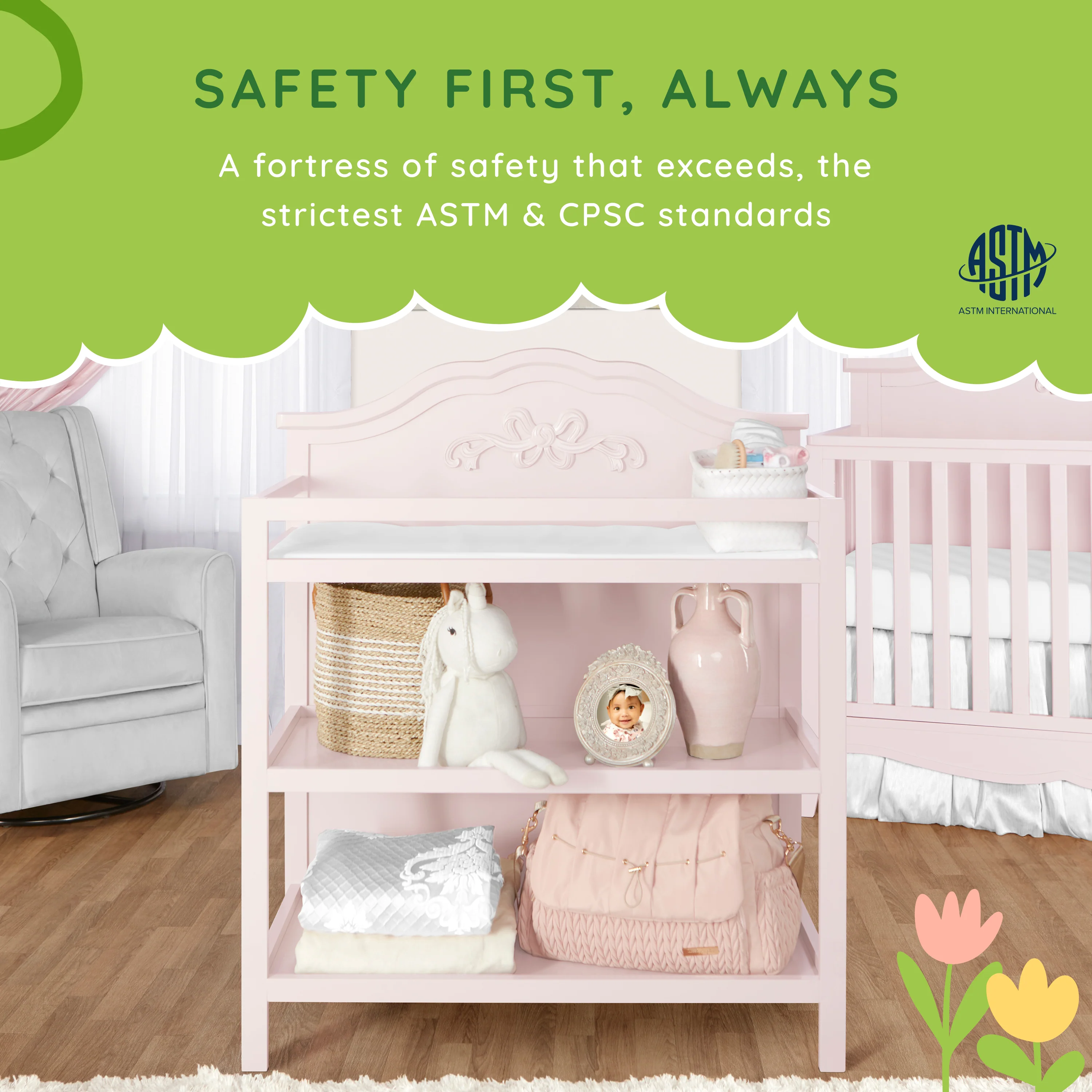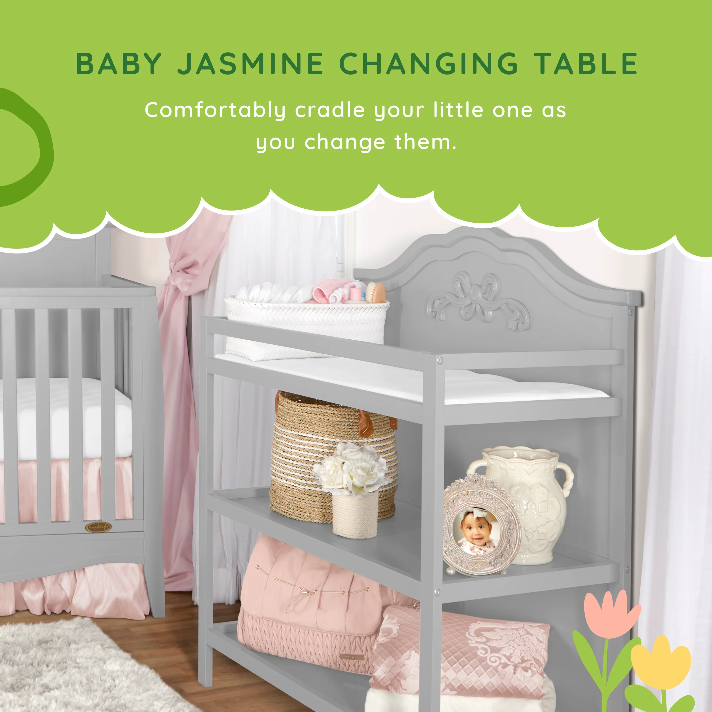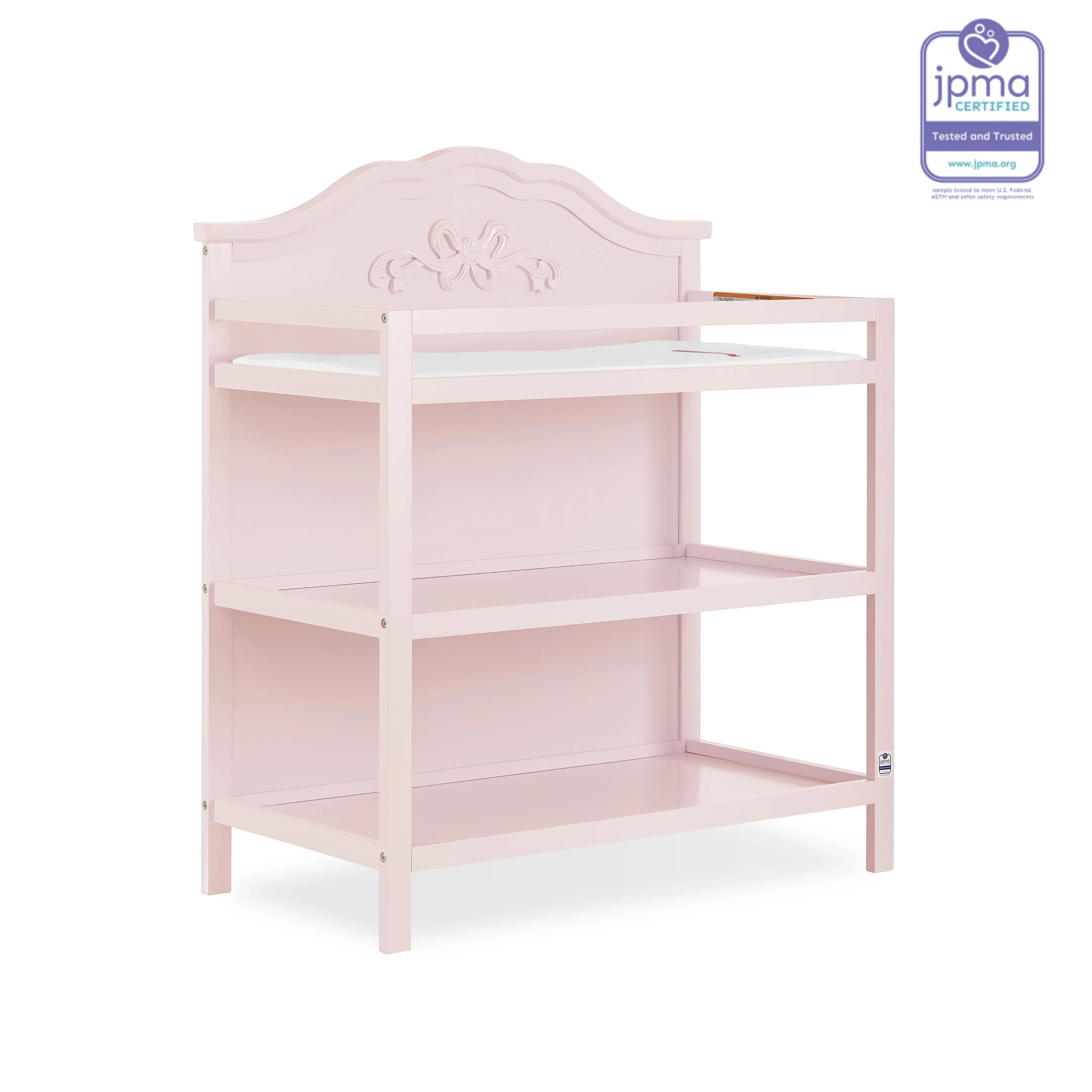 - CRAFTED FOR ANY DÉCOR: The Jasmine Changing Table boasts of intricate ribbon bow scrollwork and comes in 4 lovely, non-toxic finishes �?Blush Pink, Lavender, Platinum, and White.