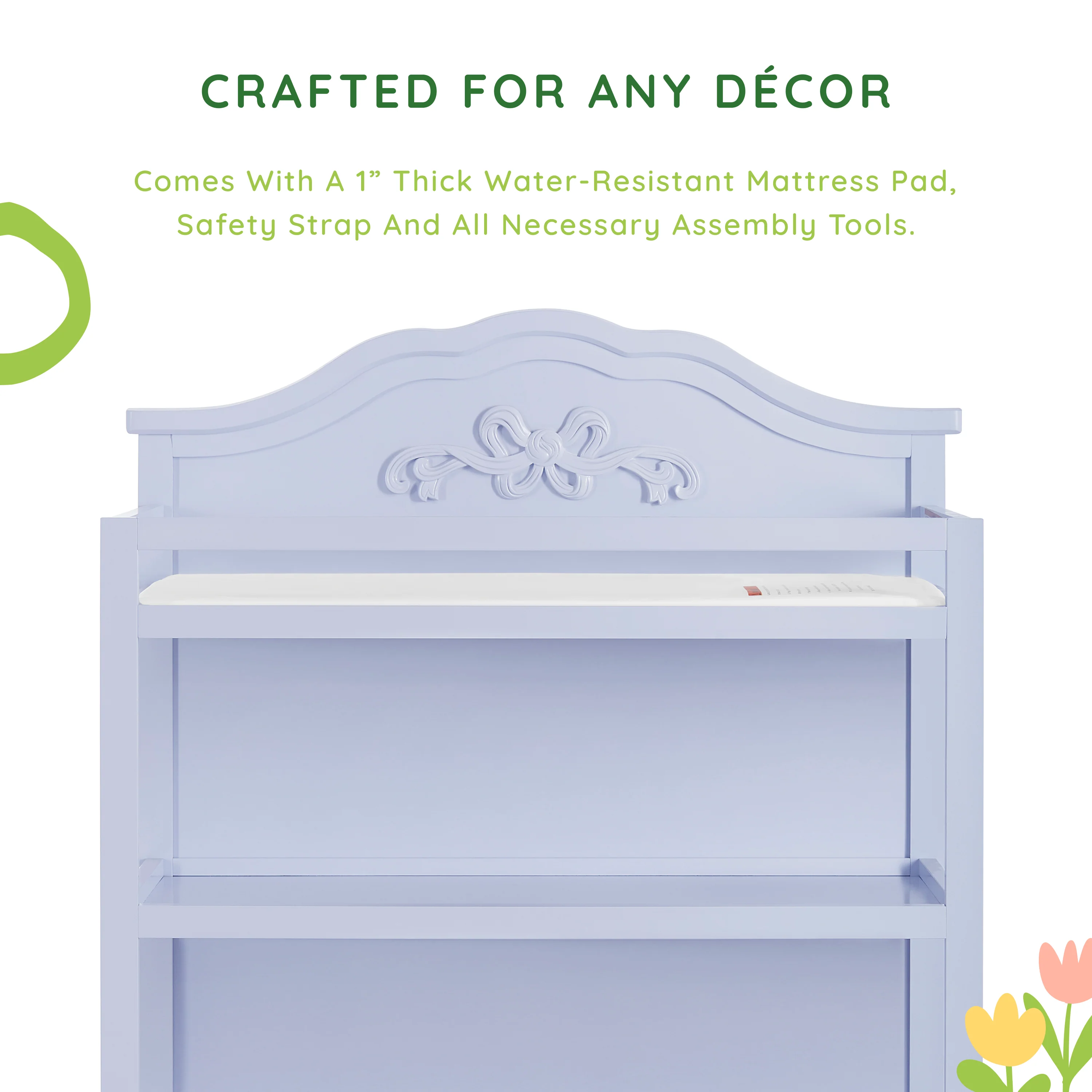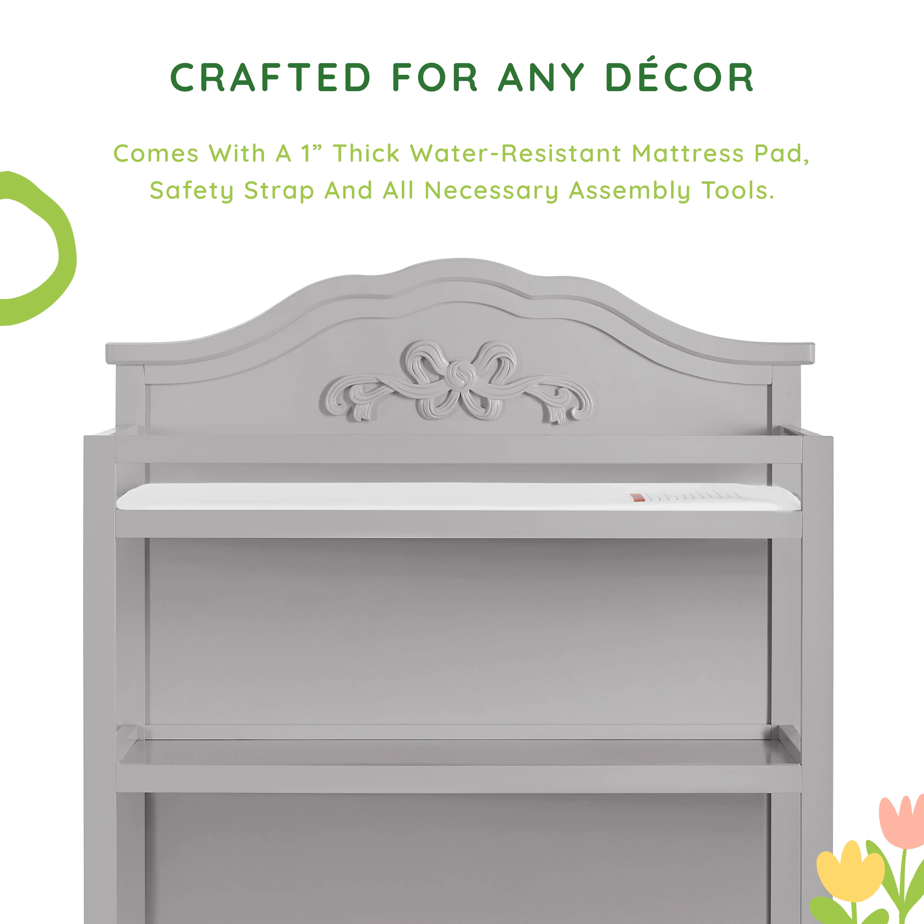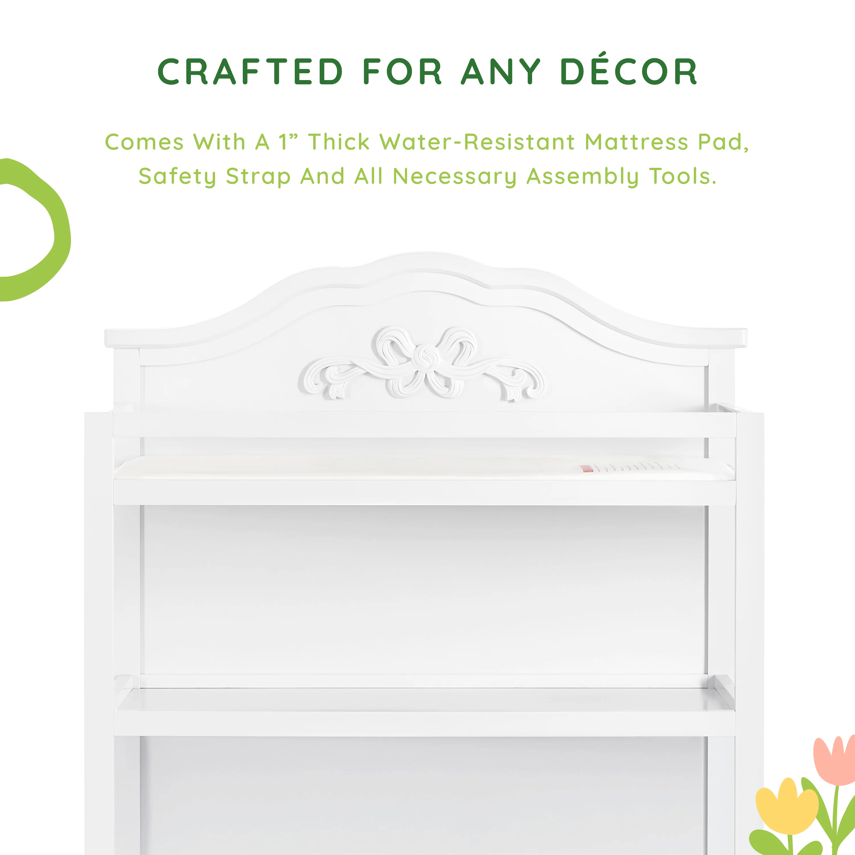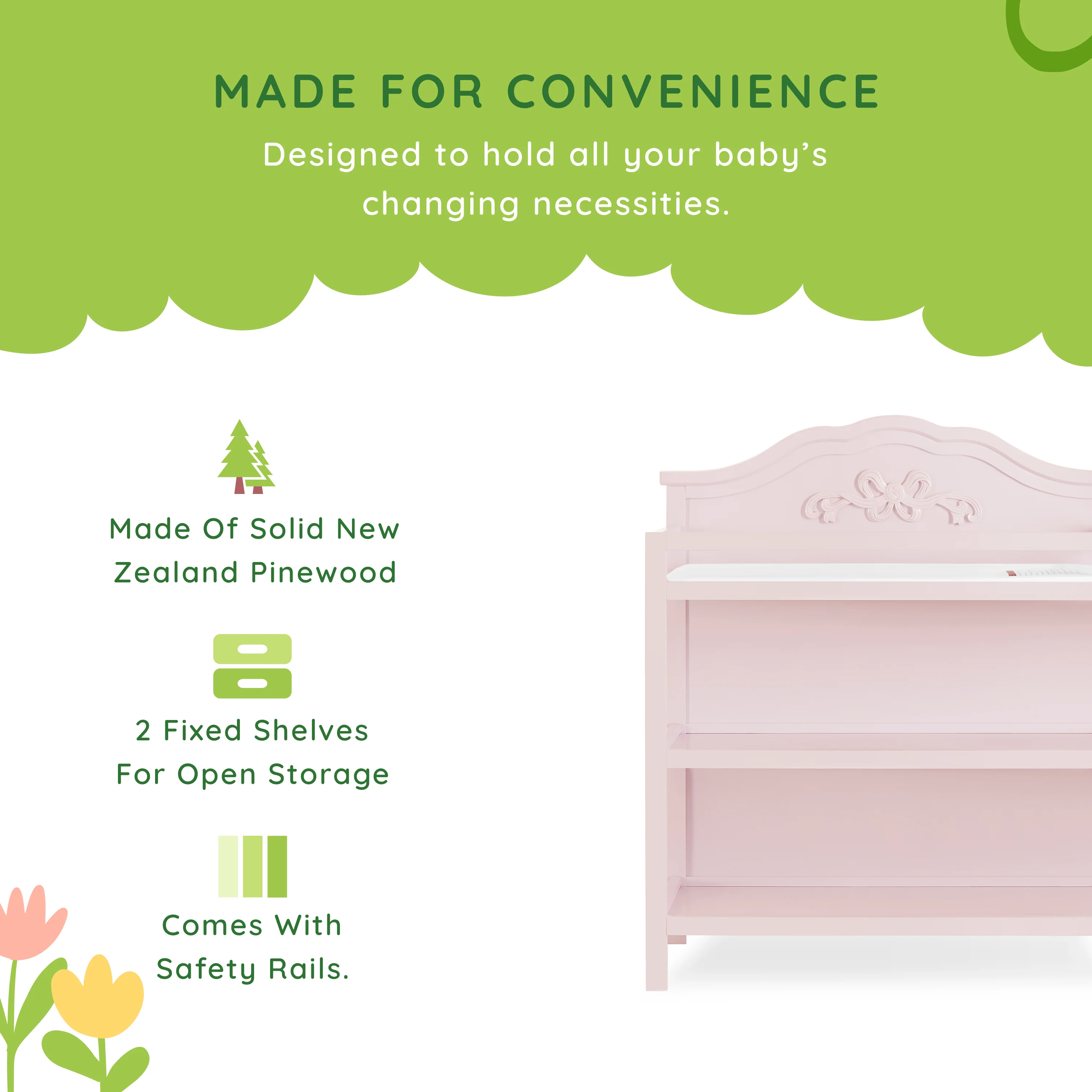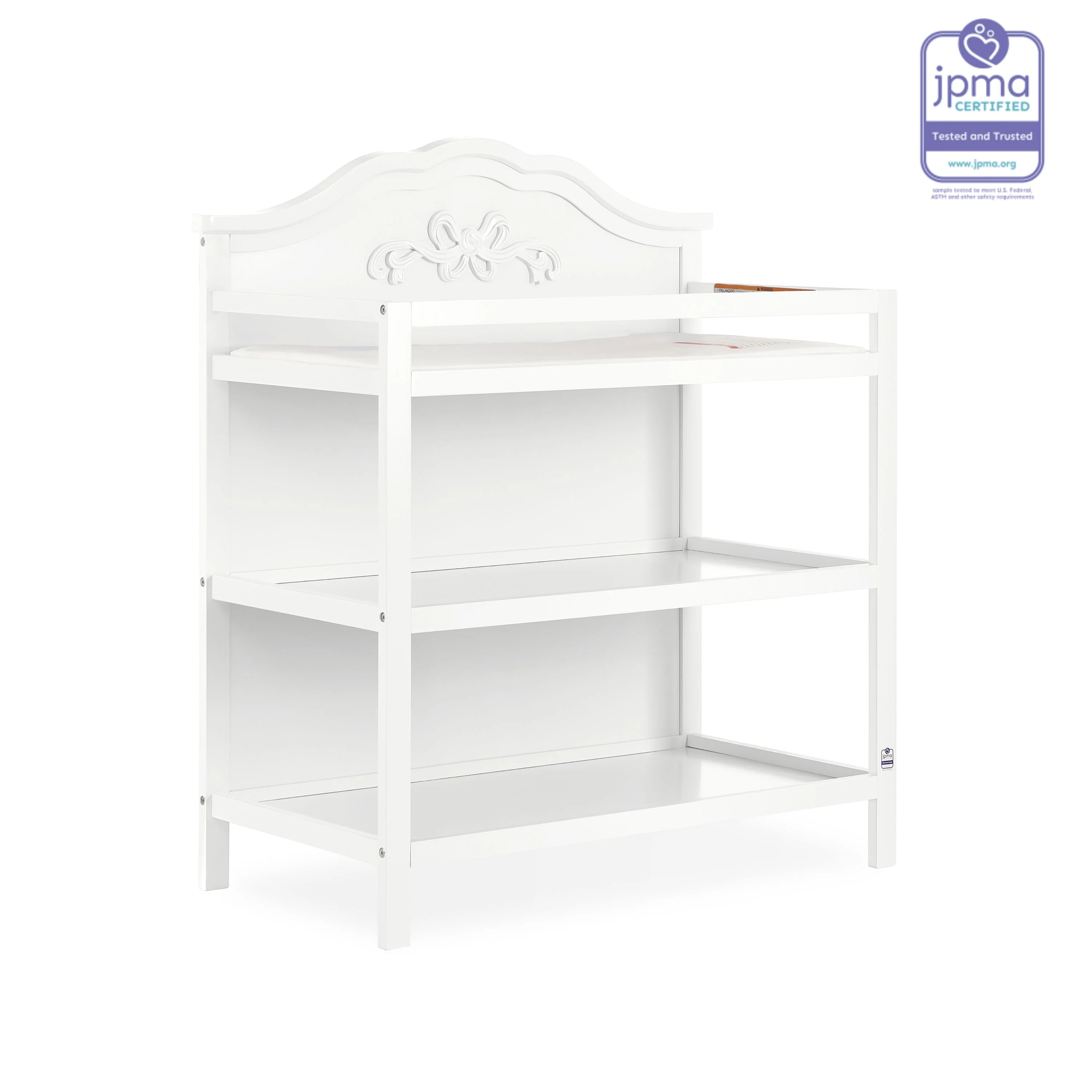- CRAFTED FOR ANY DÉCOR: The Jasmine Changing Table boasts of intricate ribbon bow scrollwork and comes in 4 lovely, non-toxic finishes �?Blush Pink, Lavender, Platinum, and White.