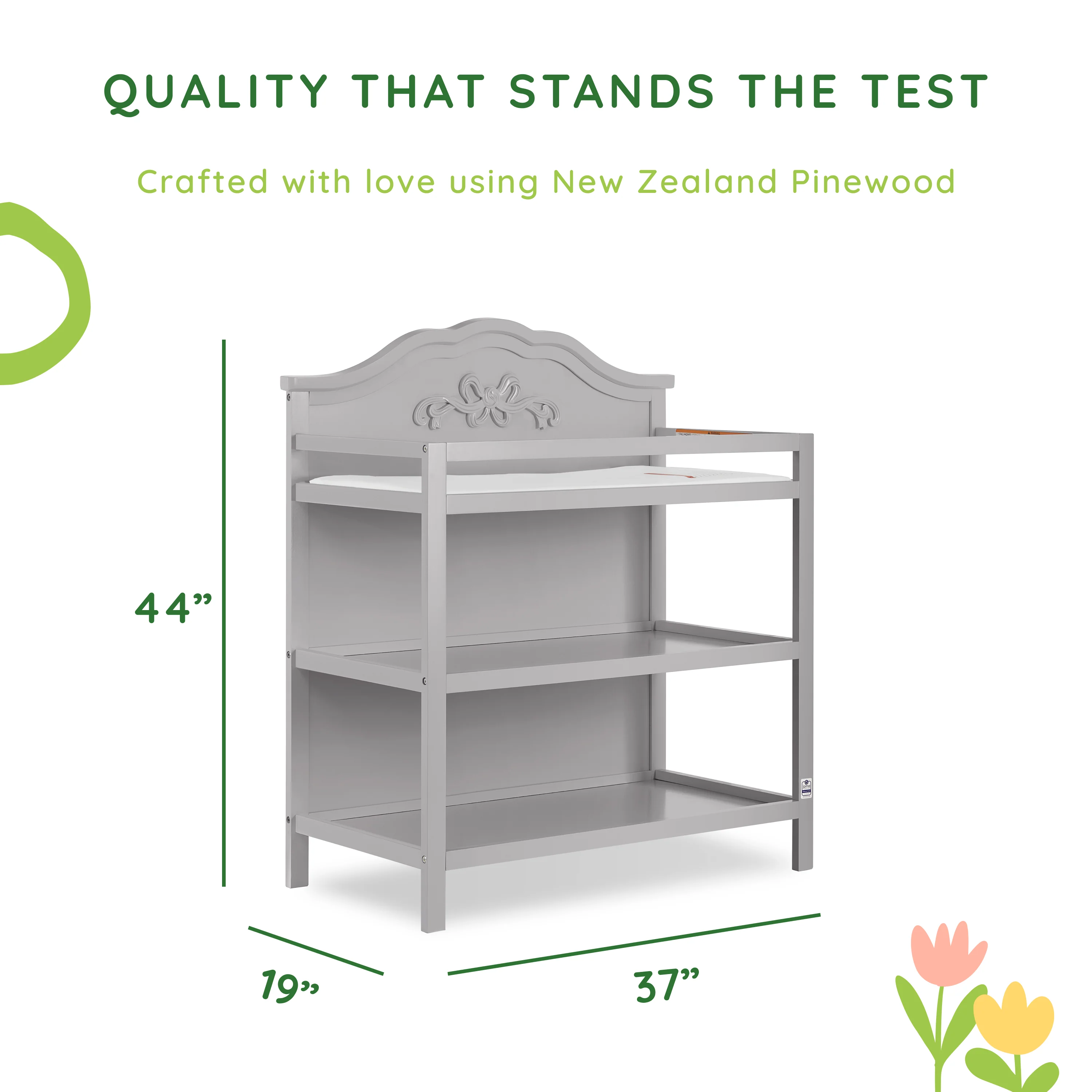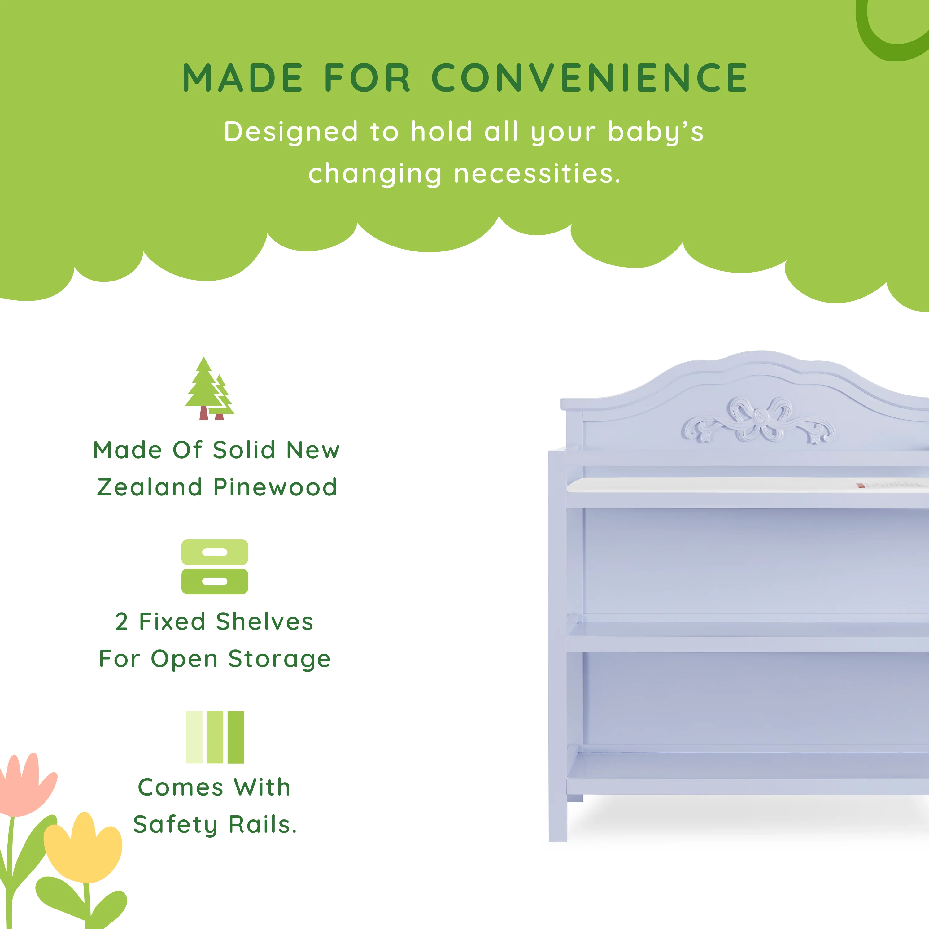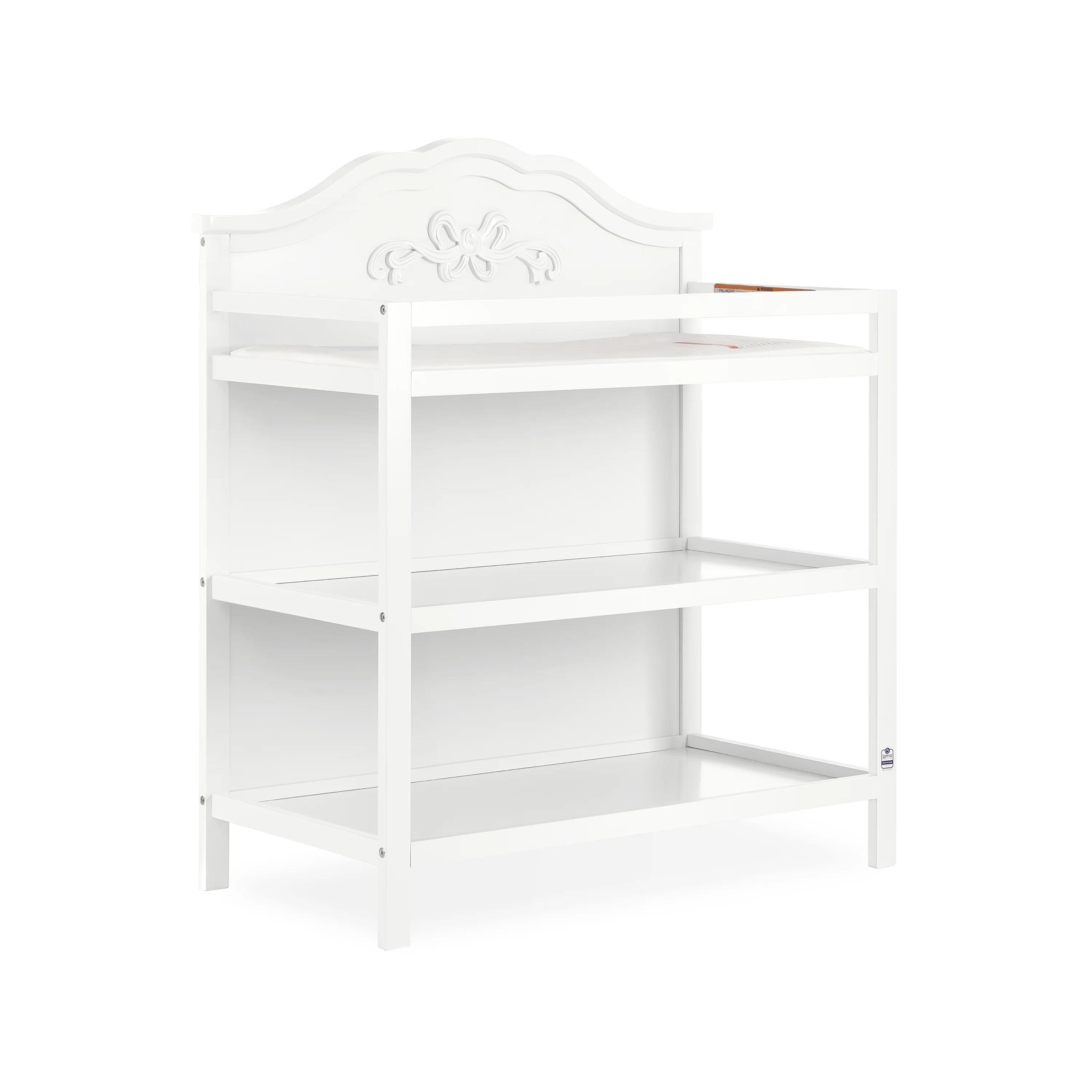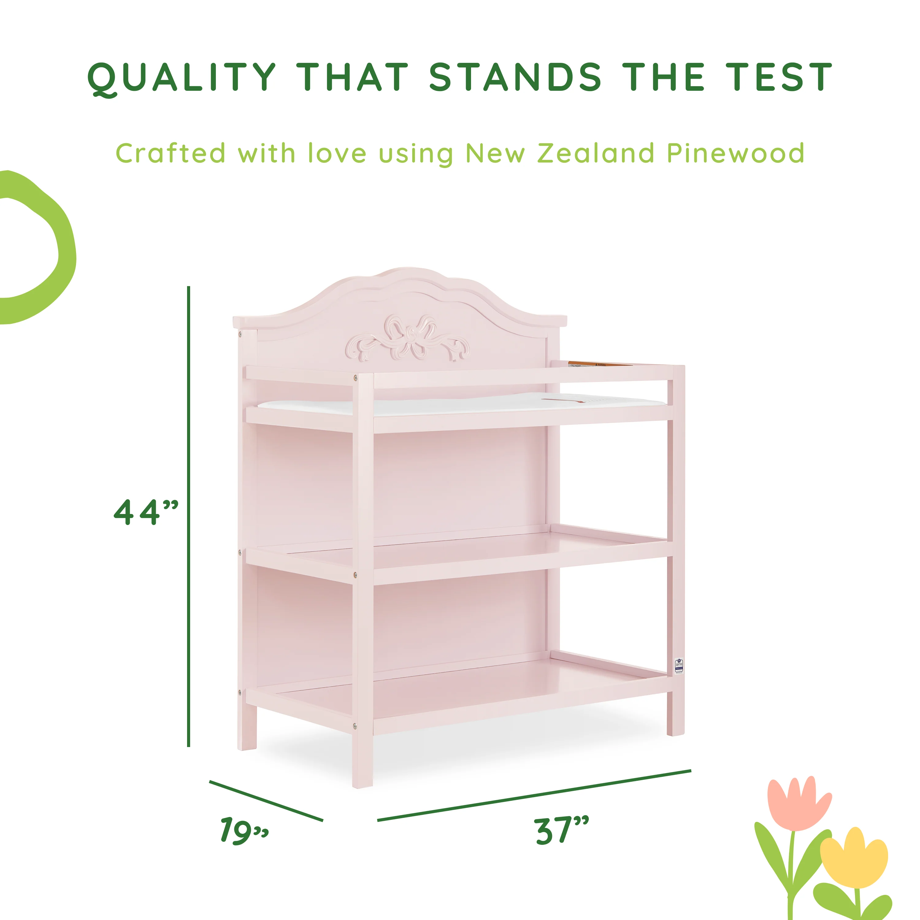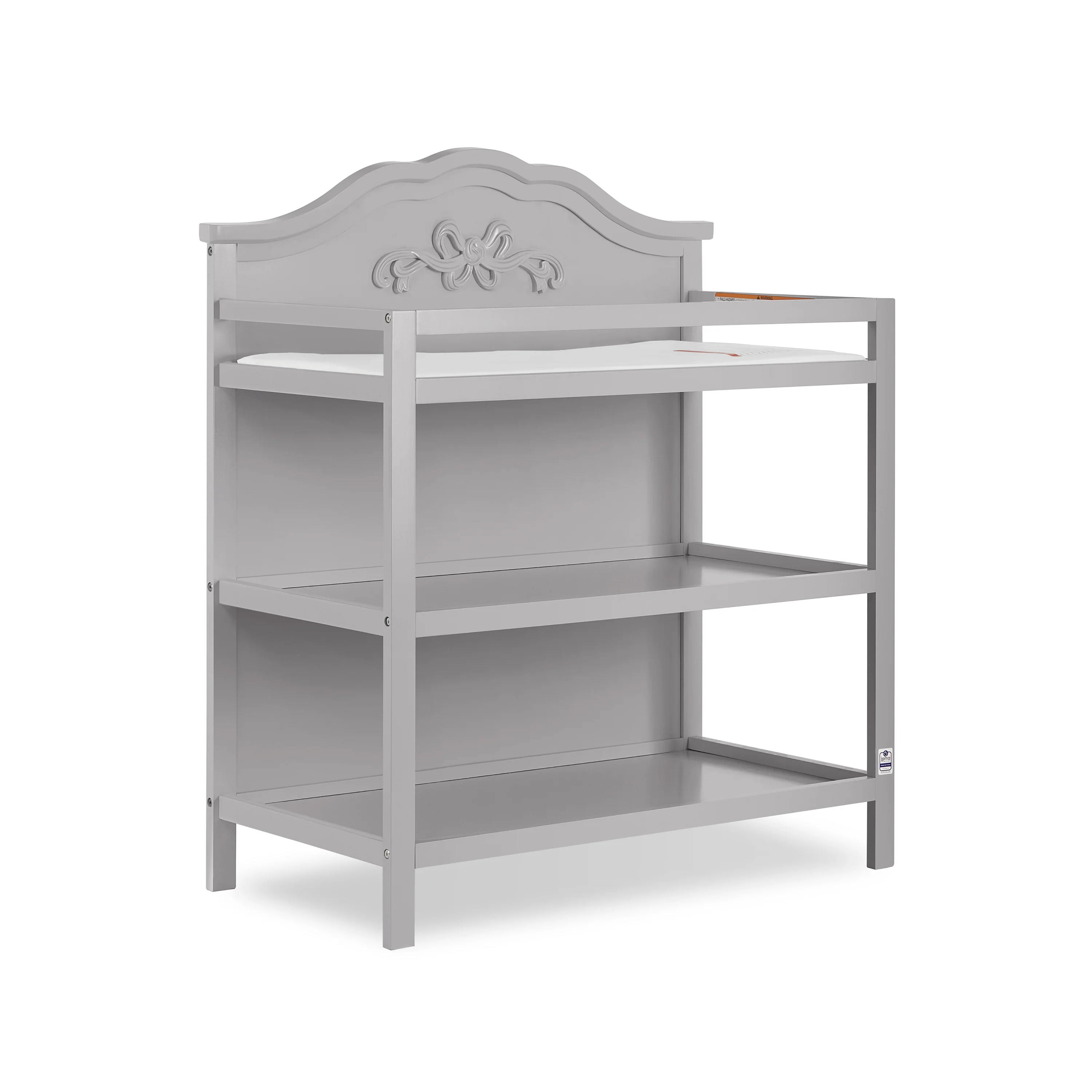 - CRAFTED FOR ANY DÉCOR: The Jasmine Changing Table boasts of intricate ribbon bow scrollwork and comes in 4 lovely, non-toxic finishes �?Blush Pink, Lavender, Platinum, and White.