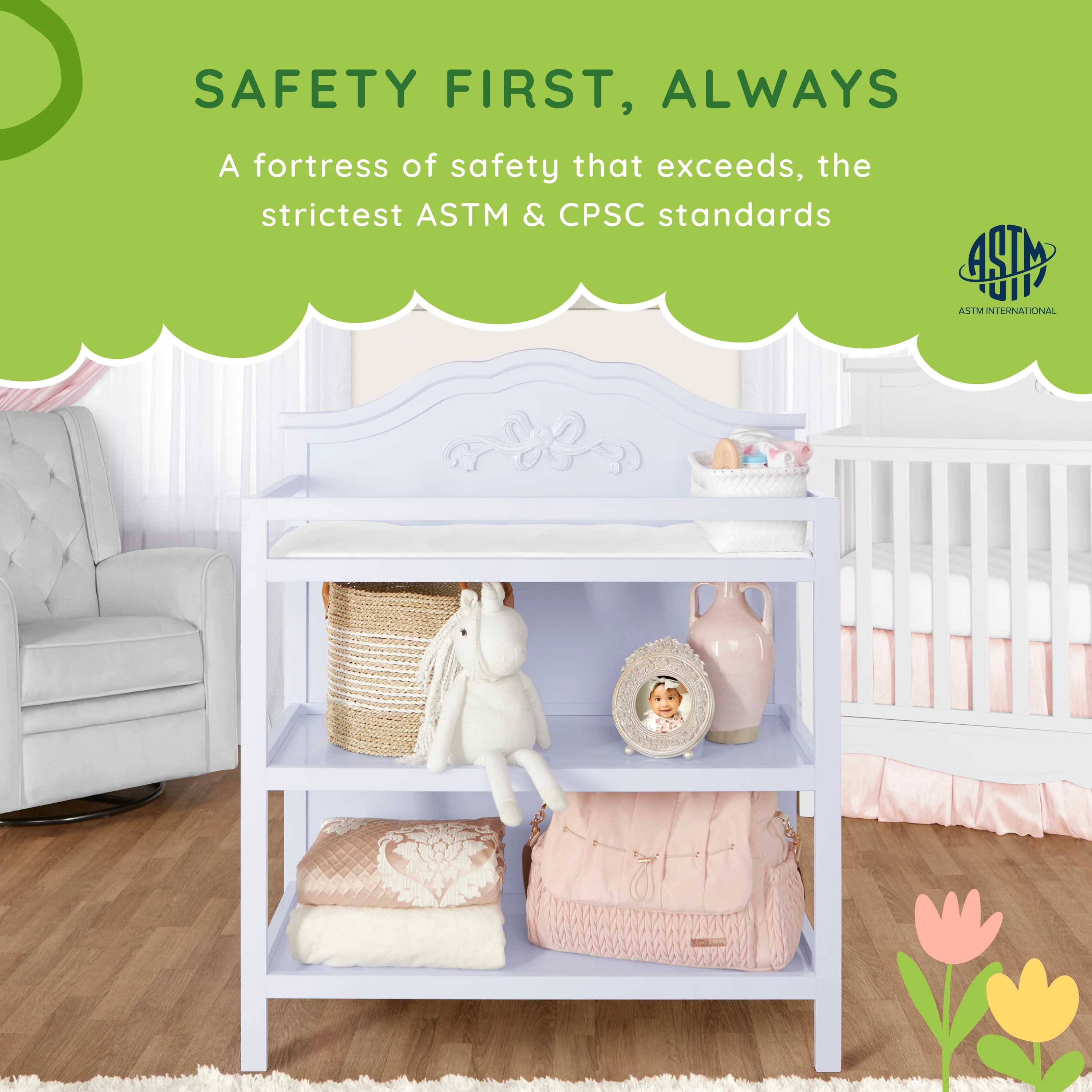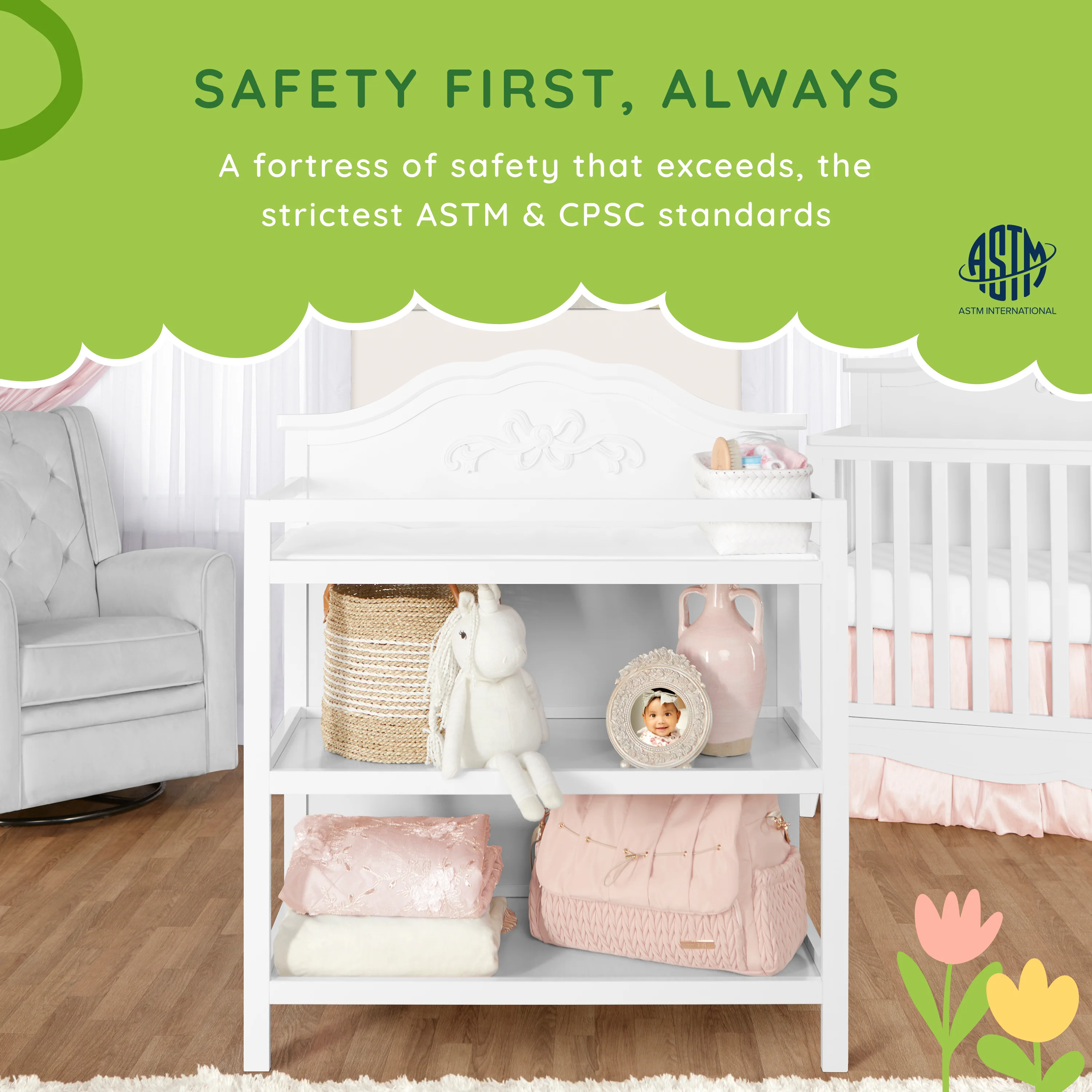 - DESIGNED FOR SAFETY: The Jasmine Changing Table meets or exceeds all ASTM standards and comes with safety rails.