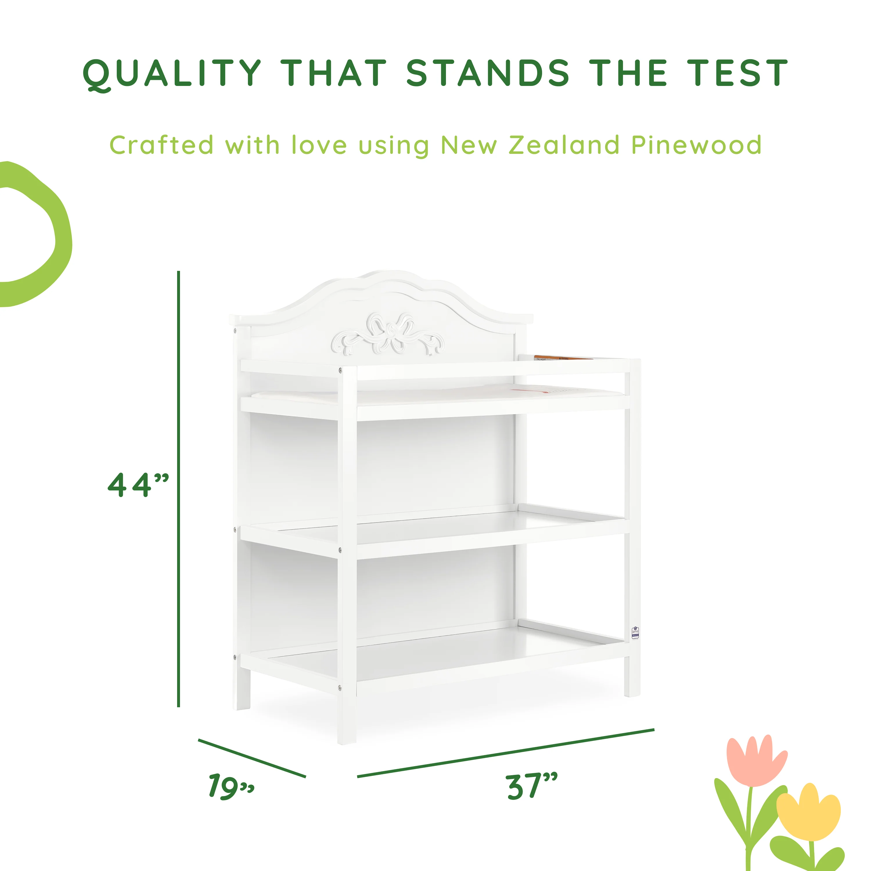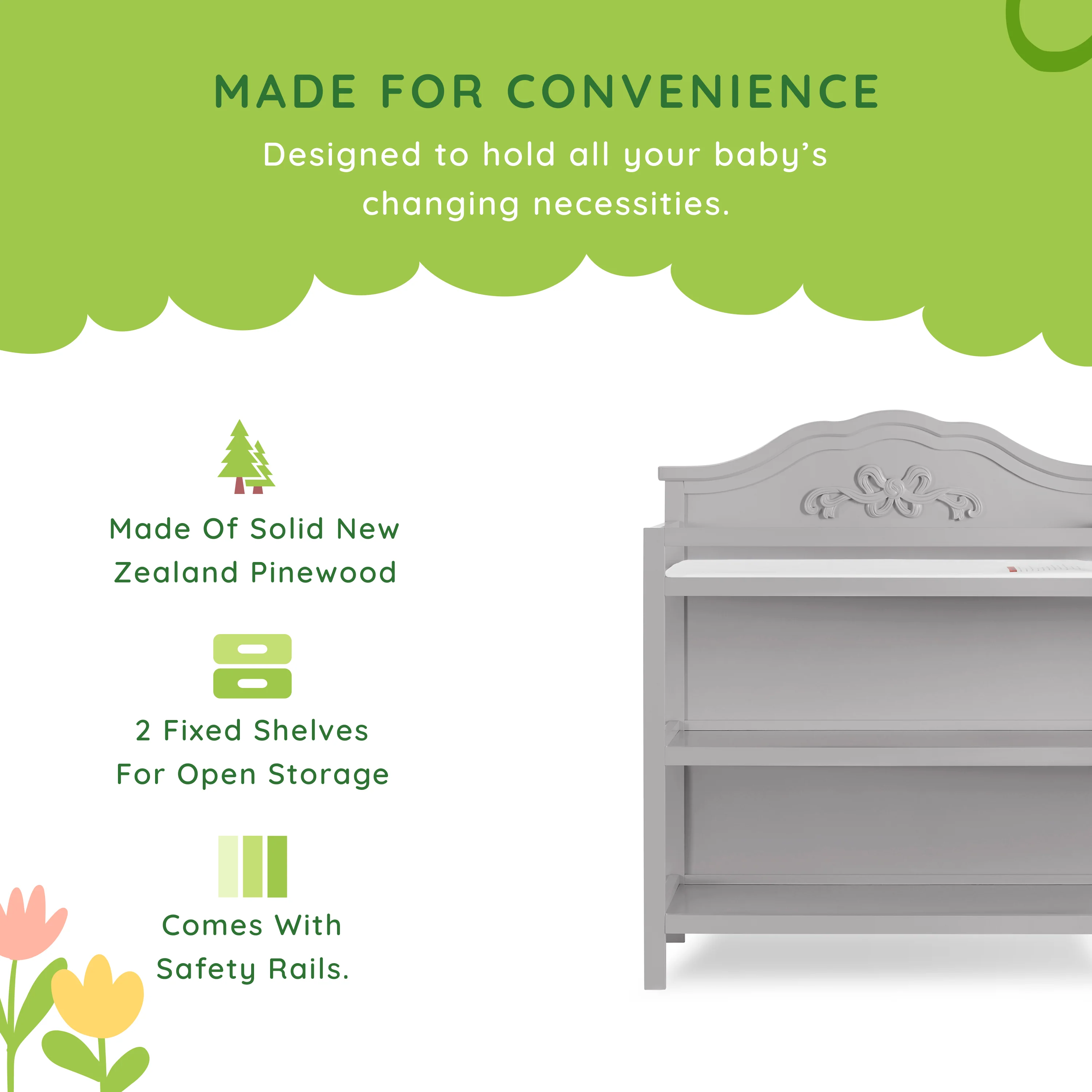 - ENGINEERED FOR STORAGE: The Jasmine Changing Table boasts of 2 fixed shelves for open storage and easy accessibility.