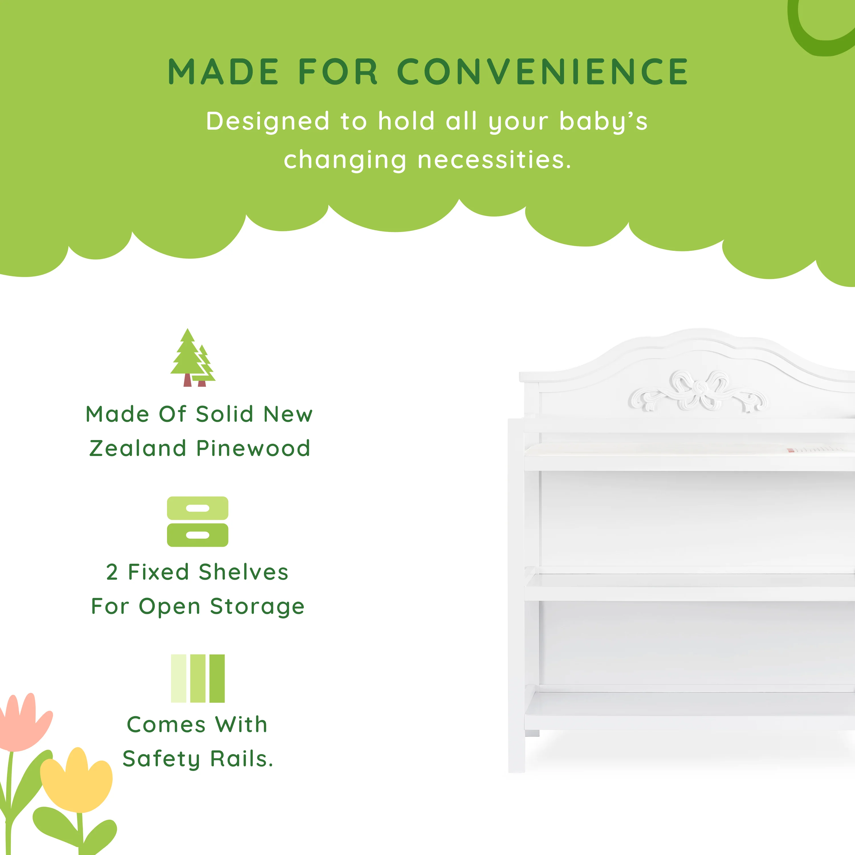 Comfort & ease with a touch of blossoming whimsy �?it’s the Sweetpea Baby Jasmine Changing Table! Designed to hold all your baby’s changing necessities and comfortably cradle your little one as you change them, this changing table is sturdy. Made of solid New Zealand Pinewood, it comes with 2 fixed shelves for open storage and easy accessibility. Safety conscious, the Jasmine Changing Table comes with a safety strap & safety rails to keep your little one secure and meets or exceeds all ASTM standards. What’s more, it’s built for your convenience as well as this changing table comes with a 1�?thick, water-resistant mattress pad and all necessary assembly tools. Crafted for any nursery décor, the Jasmine Changing Table boasts of intricate ribbon bow scrollwork and comes in 4 lovely, non-toxic finishes �?Blush Pink, Lavender, Platinum, and White.