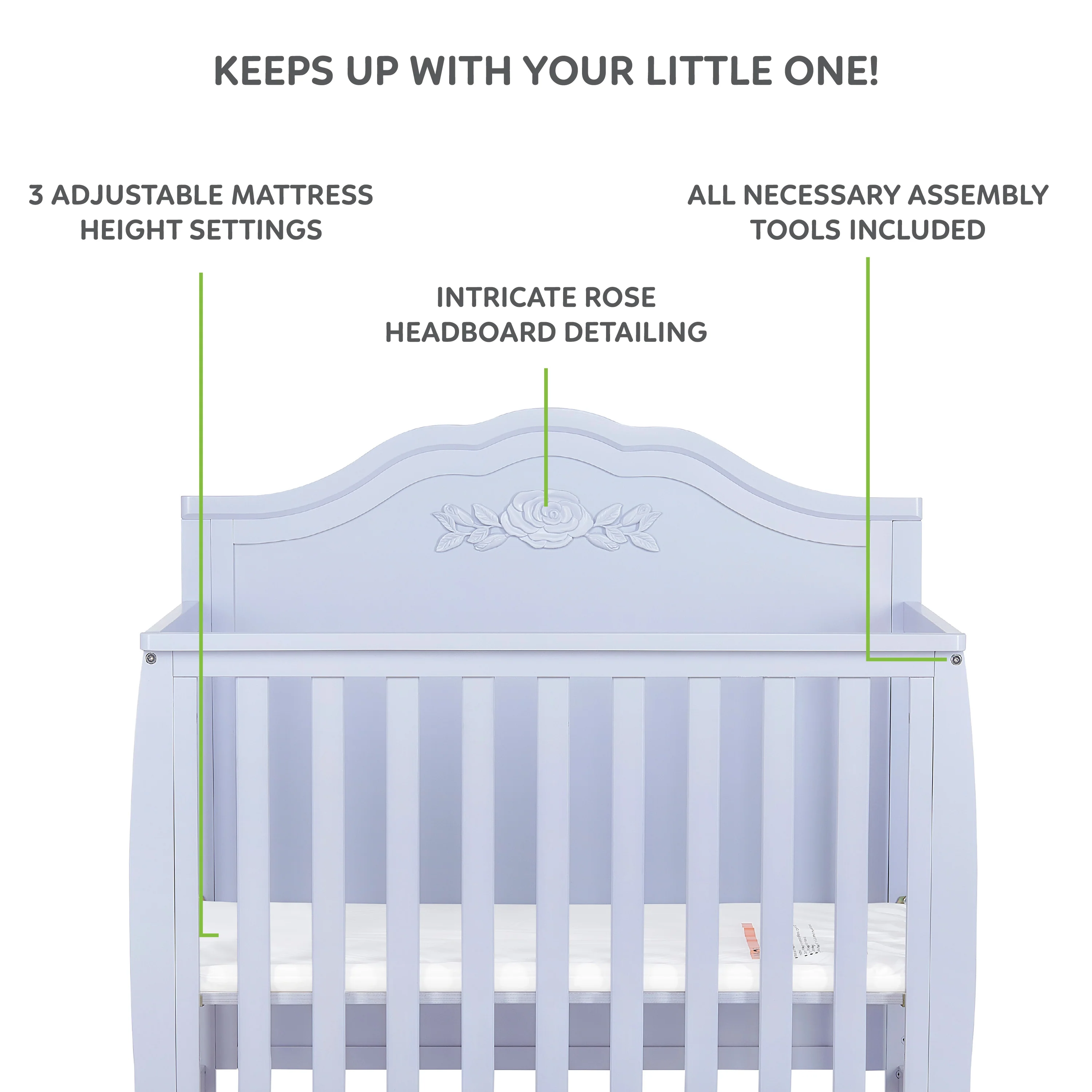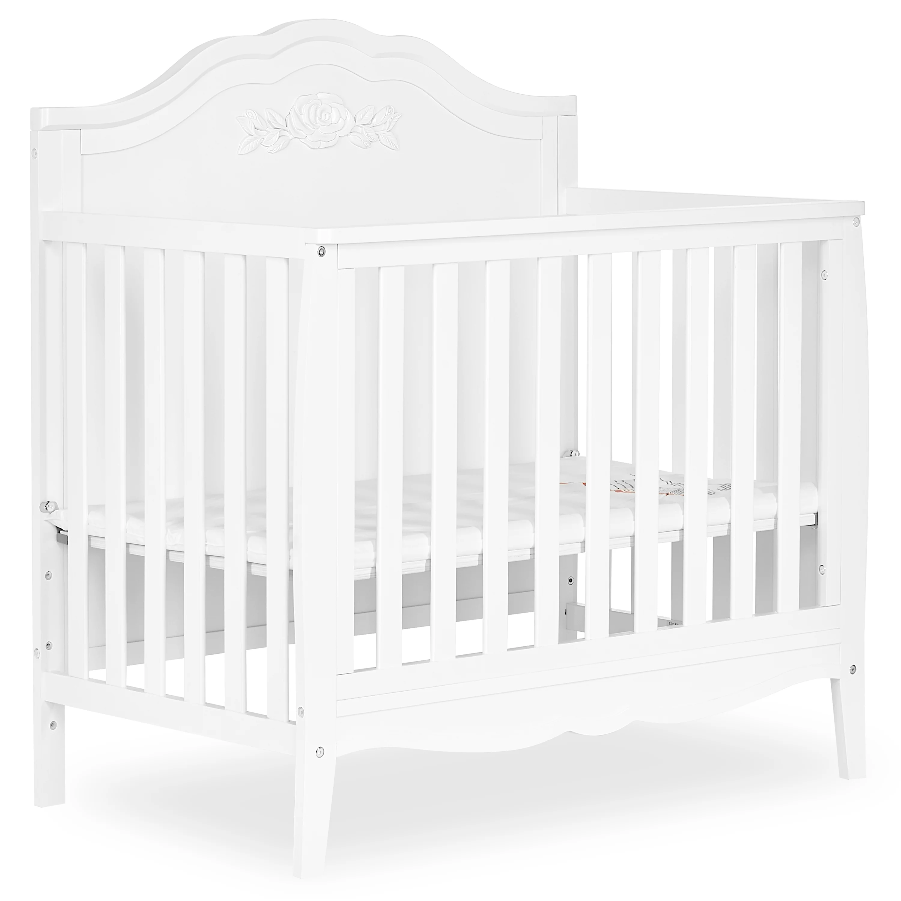 Designed to evolve as your sweet little one blossoms and grows, the Sweetpea Baby Rose 4-in-1 Convertible Mini Crib is the perfect, compact addition to any nursery.