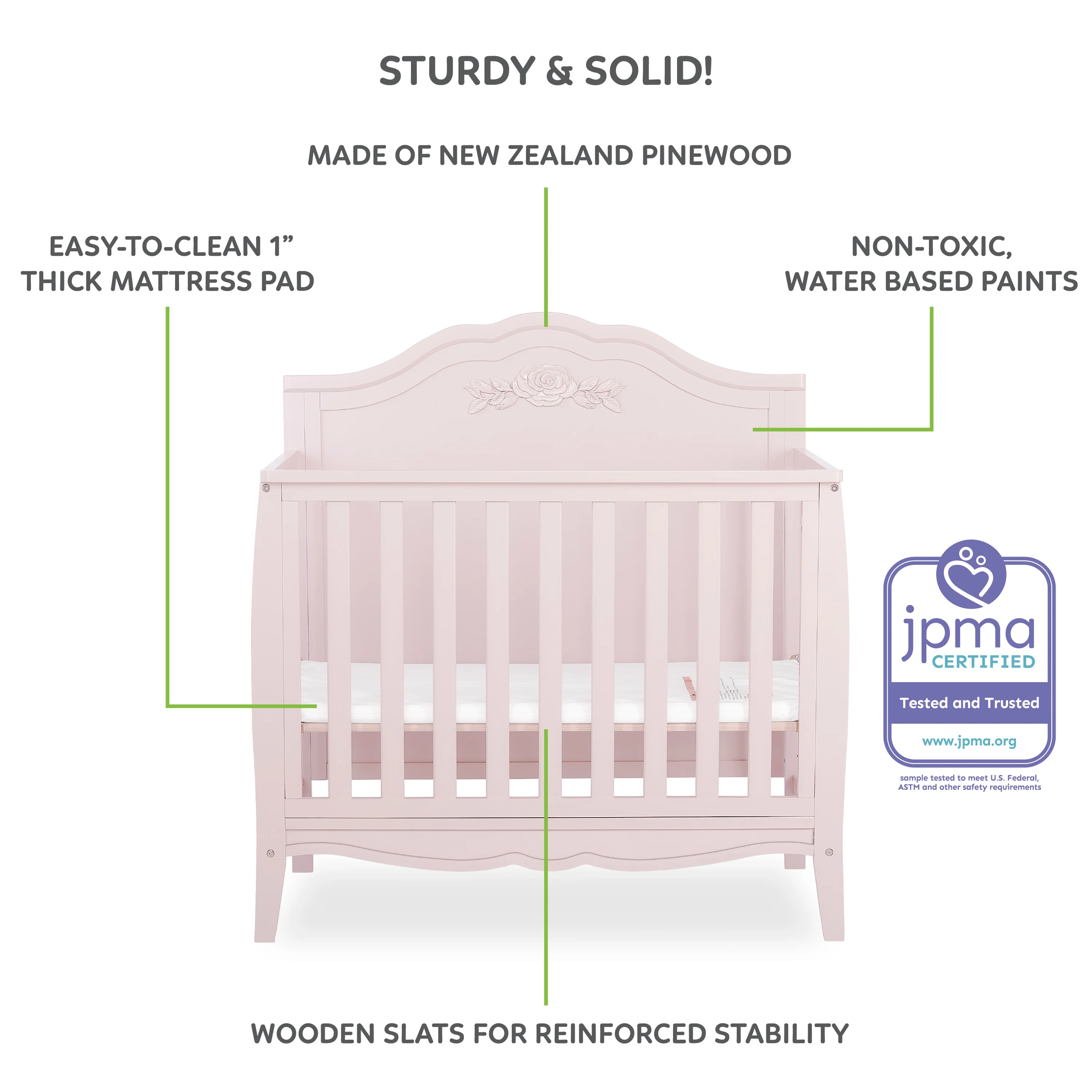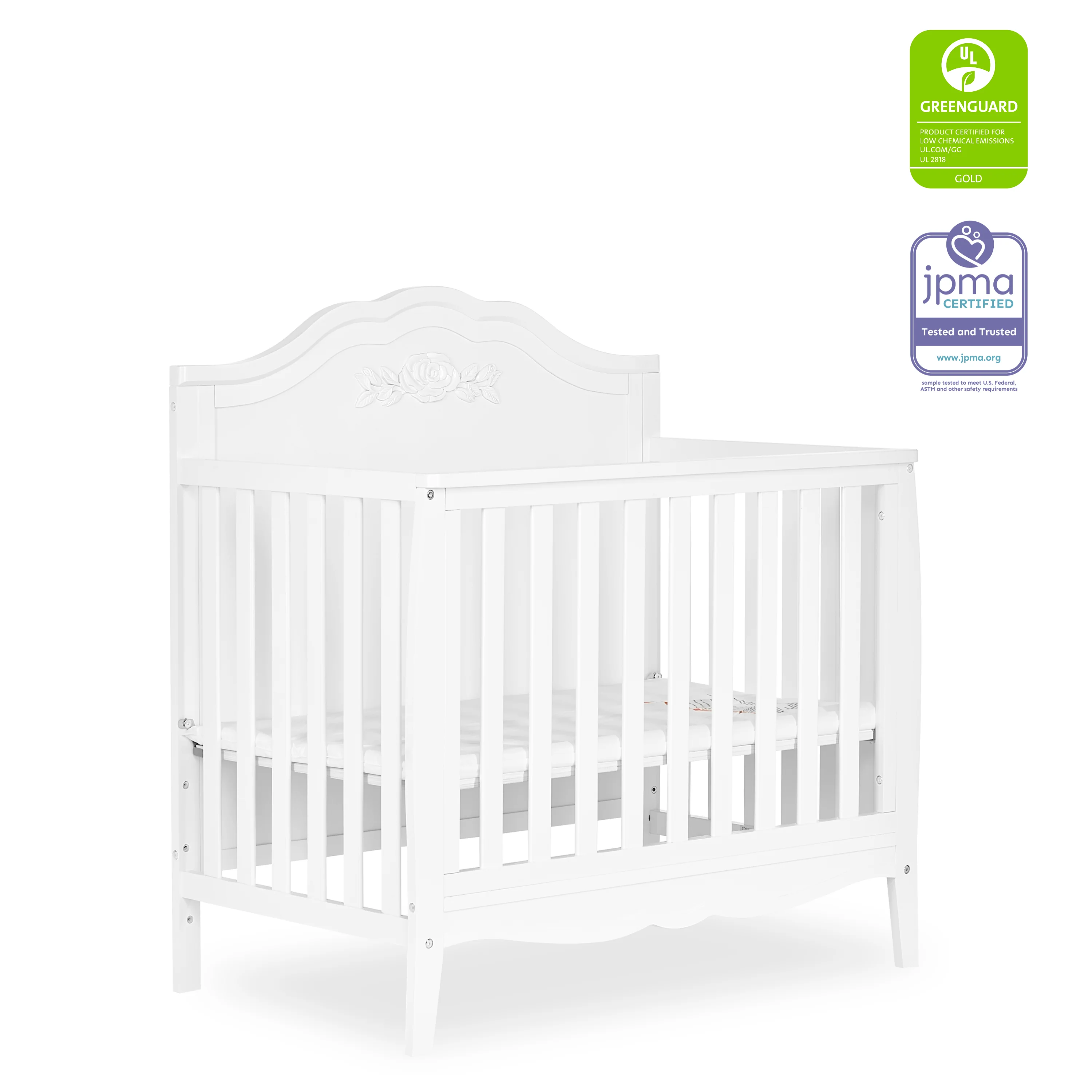 • The Rose Mini Crib is JPMA certified and completed with a non-toxic finish. Safety note: maximum weight capacity of the crib is 50 lbs.