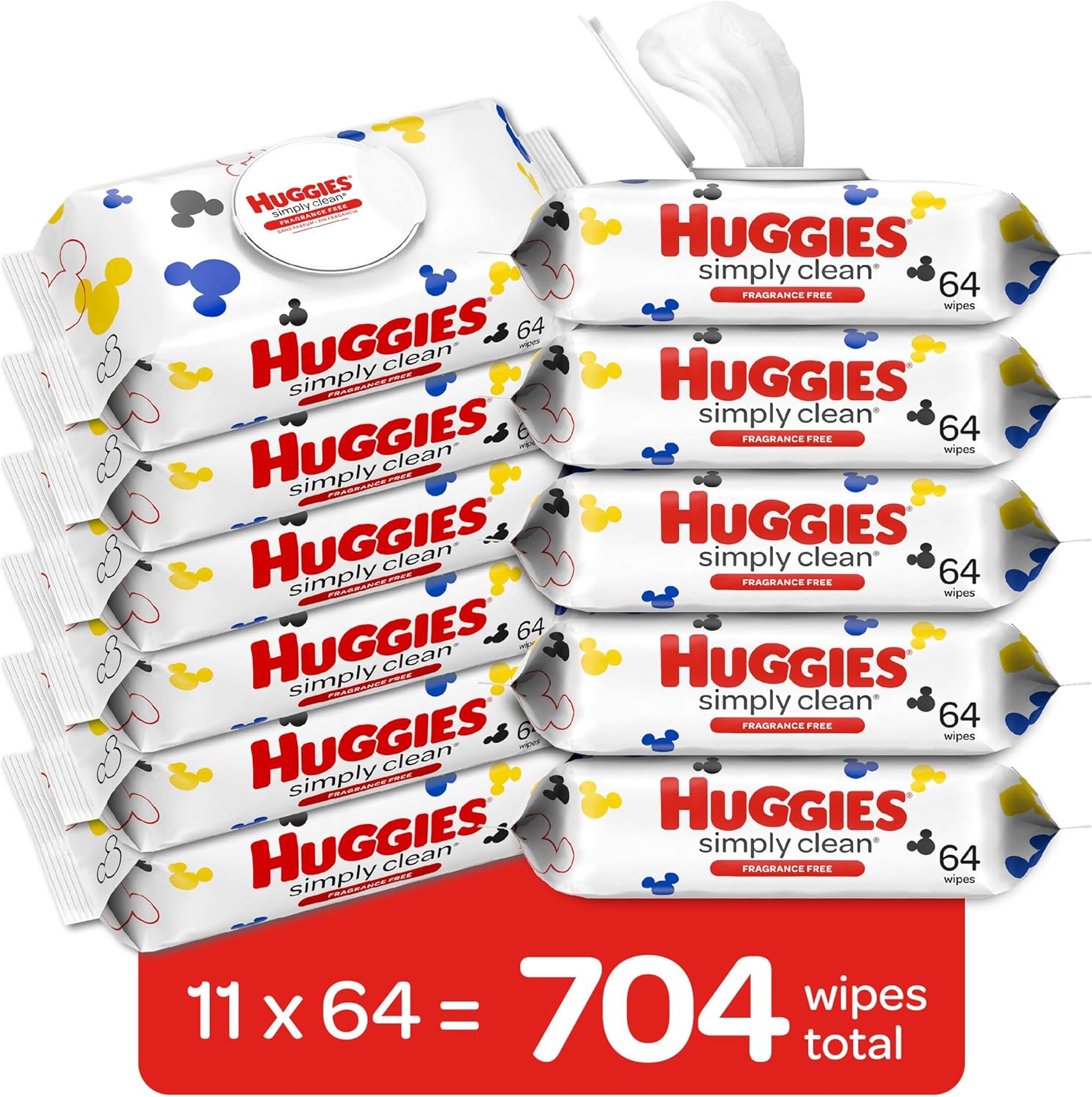 - Huggies Simply Clean Fragrance-Free Baby Wipes: 11 flip-top packs of 64 unscented baby wipes (704 wipes total)