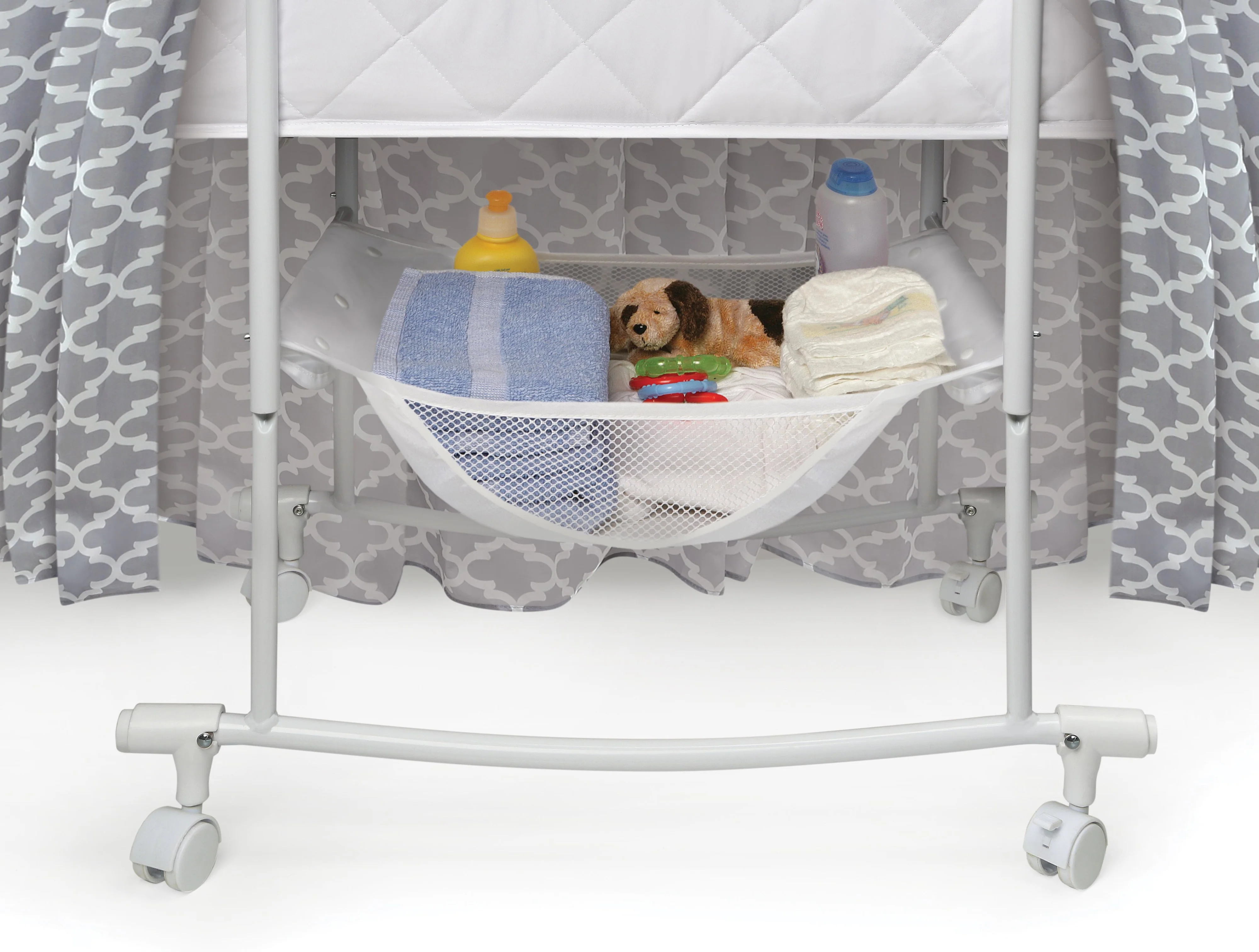 Badger Basket's lovely Wishes Bassinet comes complete with everything your baby needs for the first few months of sleep. It features crisp bedding with a floor-length pleated skirt, finished off with a wide ribbon belt. Generously sized, adjustable canopy. The locking caster wheels can be flipped up to rock the bassinet like a cradle! Convert the bassinet to the cradle position easily - no tools needed. Mesh storage basket beneath the bassinet. Complete bedding set (hood, fitted sheet, and quilted liner/skirt) and foam pad included.