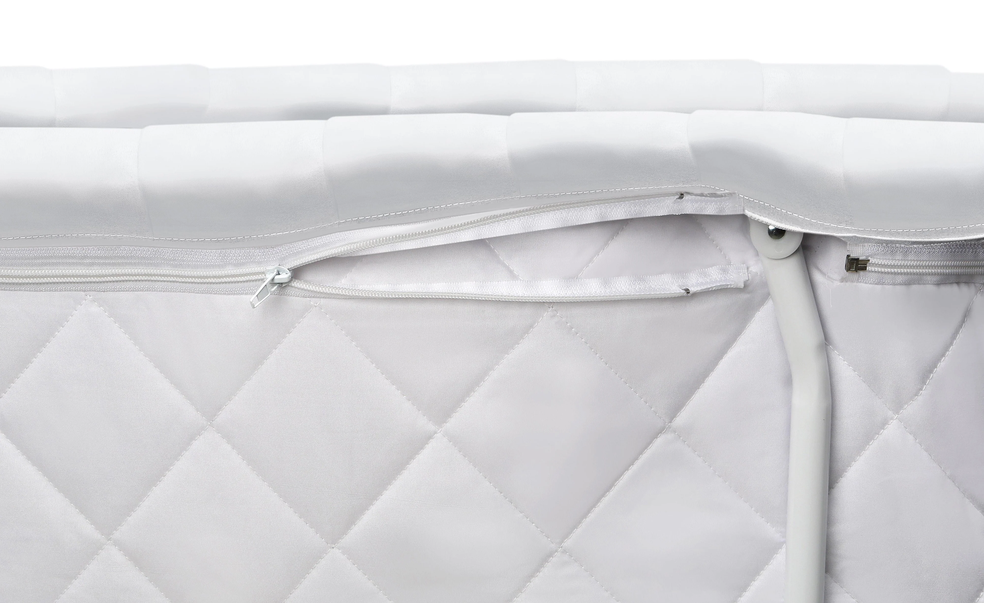 - Metal bassinet frame assembles quickly without tools and the bedding is easily attached and detached for washing. Bedding fabric is 100% Polyester.
