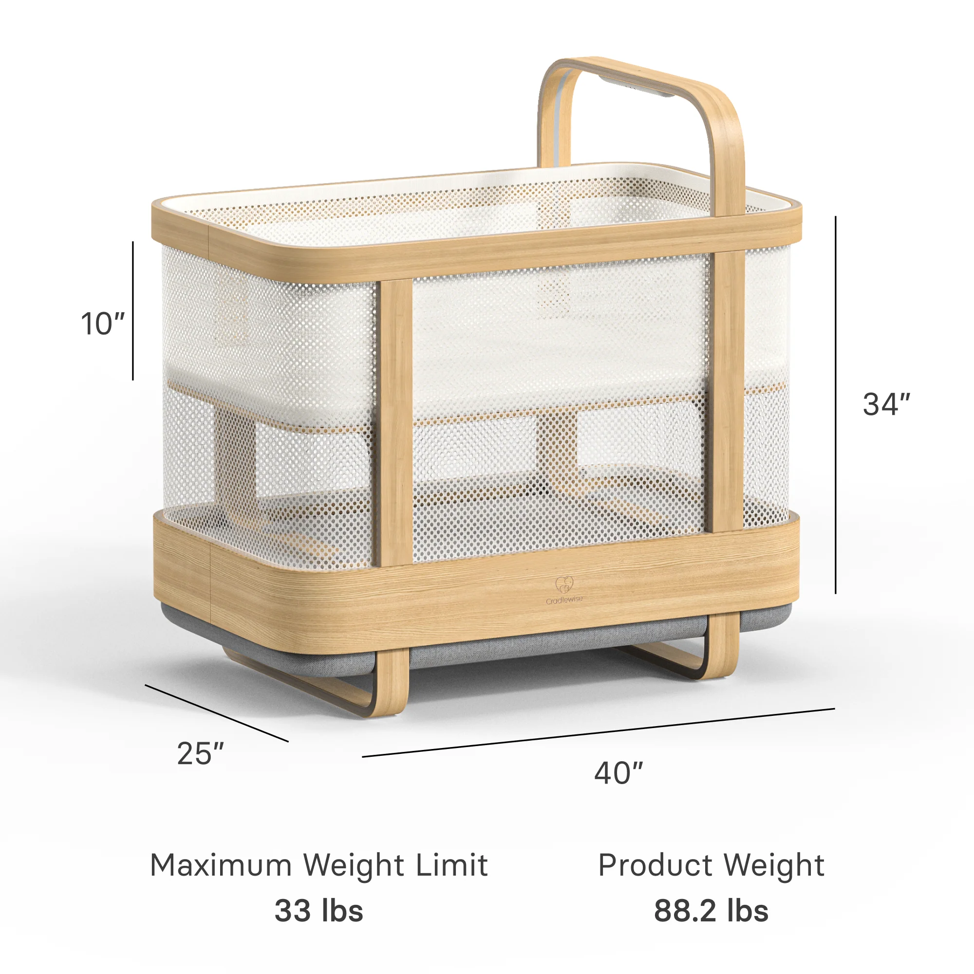 - Crib material: Crafted from premium molded ply with veneer cladding, the Cradlewise Smart Crib is both durable and stylish.
