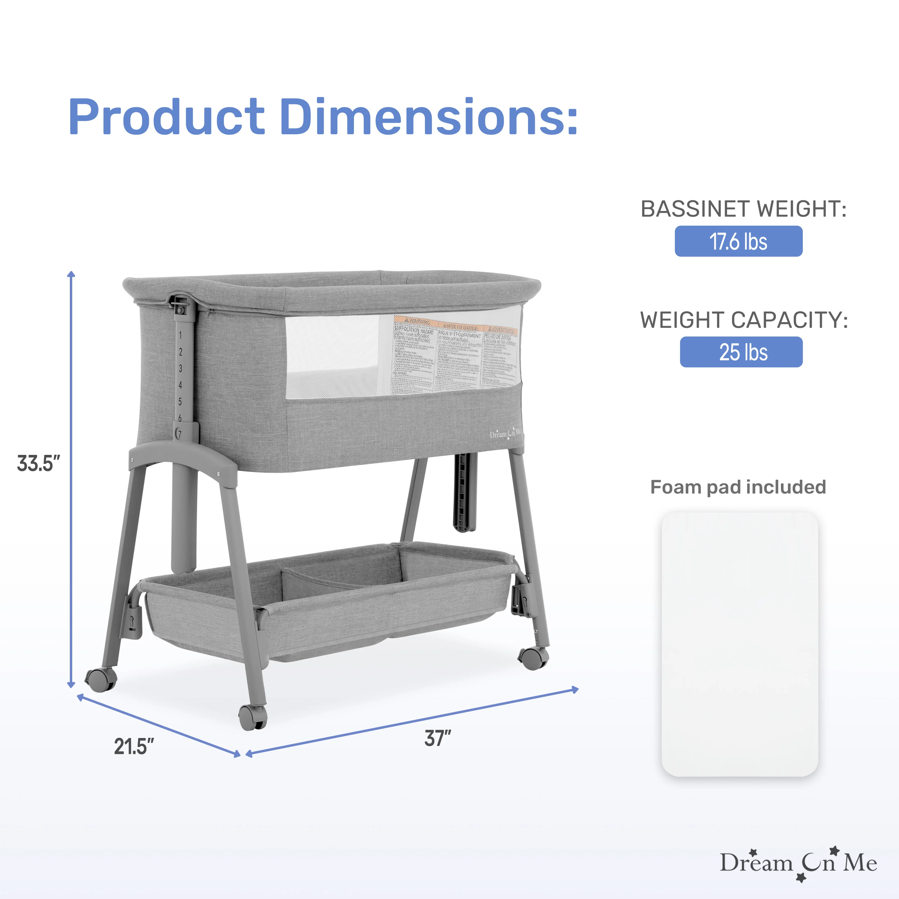Calypso ensures a secure environment for your baby. The seven adjustable height positions, complemented by a second lock, provide versatility for your convenience. The Calypso Bassinet is designed and crafted with utmost care, adhering to the stringent ASTM safety standards. The high-density foam pad guarantees comfort, and the removable soft goods make cleaning a breeze. The beautiful finishes add a touch of elegance to this practical and stylish bassinet. Product dimensions are 37" L x 21.06" W x 33.07" H, with a maximum weight capacity of 25 Lbs.