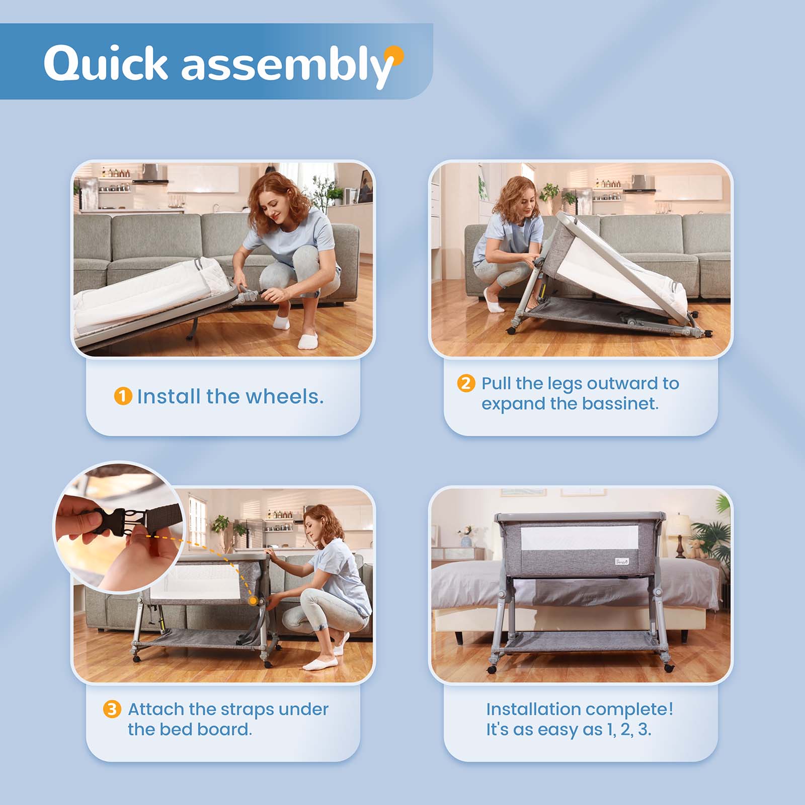 Forget about complicated assembly instructions and tools – the Li'l Pengyu Bedtime Bliss Bassinet is ready to use straight out of the box. There's no assembly required, except for the wheels which can be easily attached in no time. As parents, we know that time is precious, and our bassinet is designed to save you those precious moments.