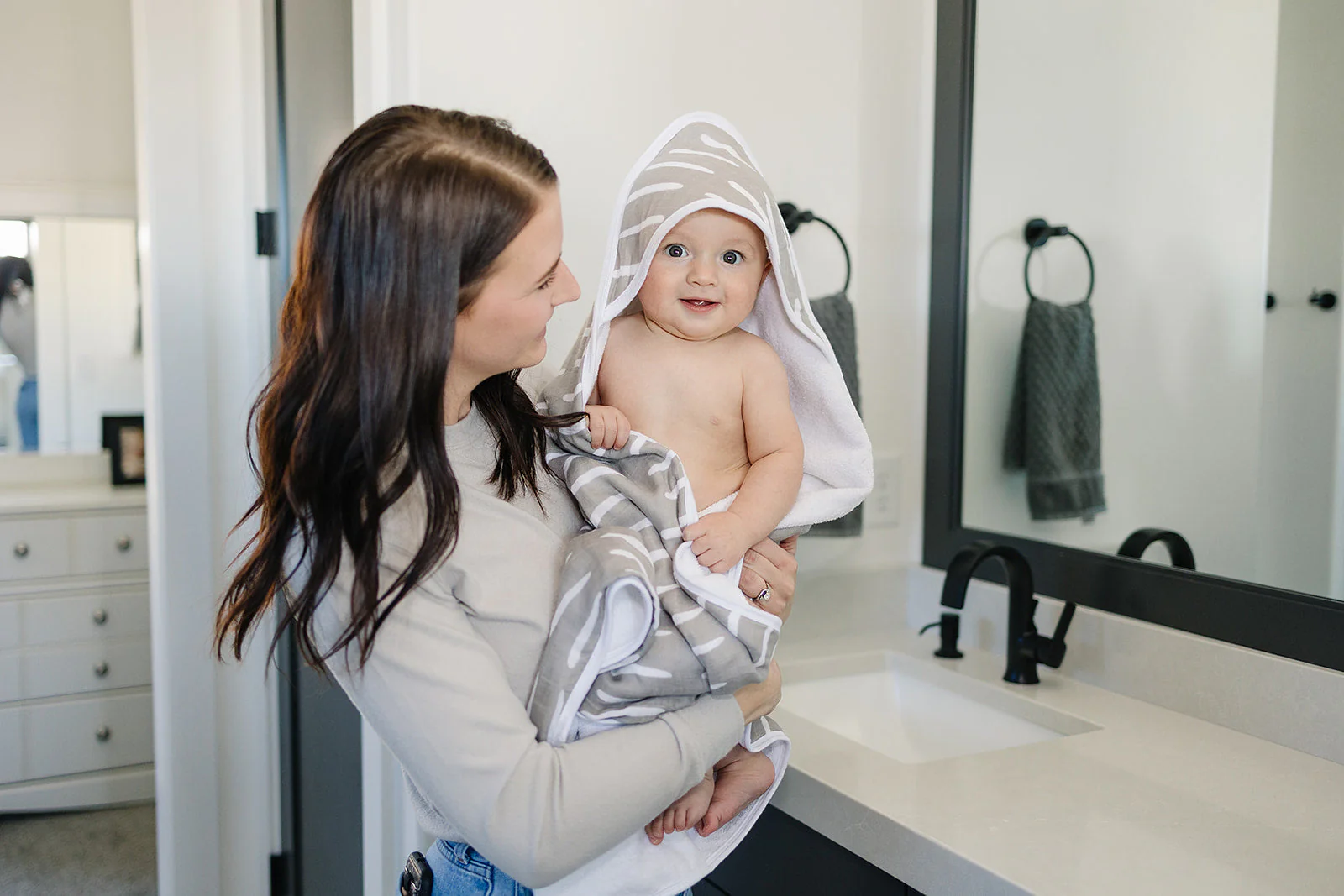 Wrap your little one in comfort with the Grey Dash Muslin Towel. This gender-neutral towel is specially designed for babies and toddlers, making bath time or swimming a cozy experience. The towel features a hood to keep your child's head warm and easily dry their hair. Not only is this towel functional, but it also adds a touch of style to any bathroom decor. Made from soft muslin fabric, it is gentle on delicate skin and provides the perfect size for your little one. Ensure your child stays warm and comfortable with this versatile and chic towel.