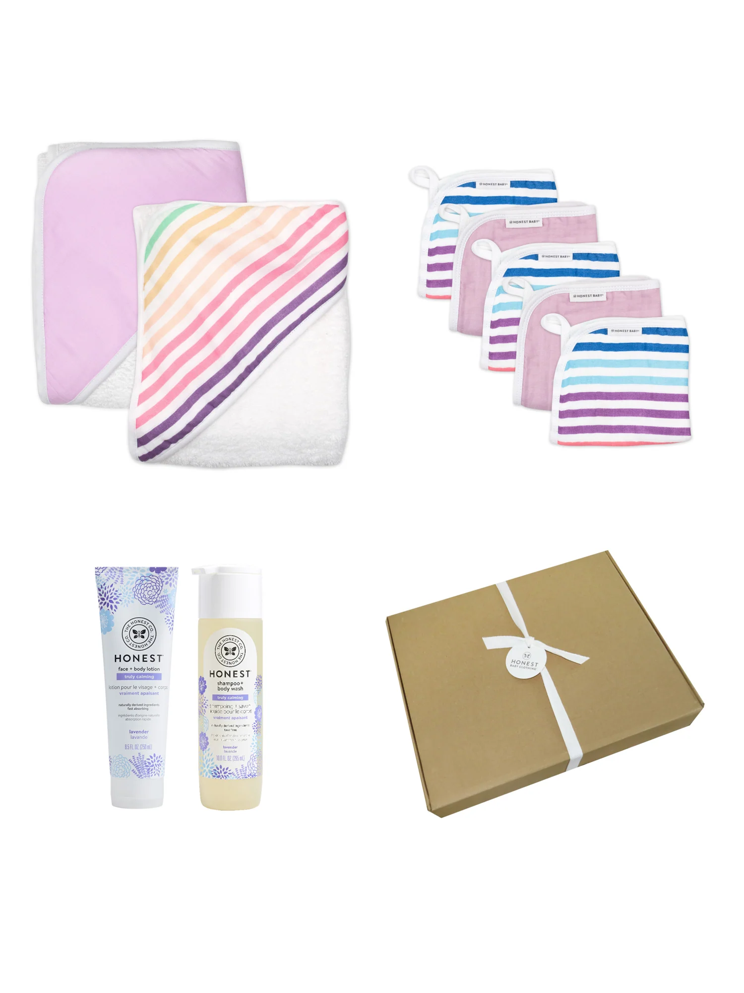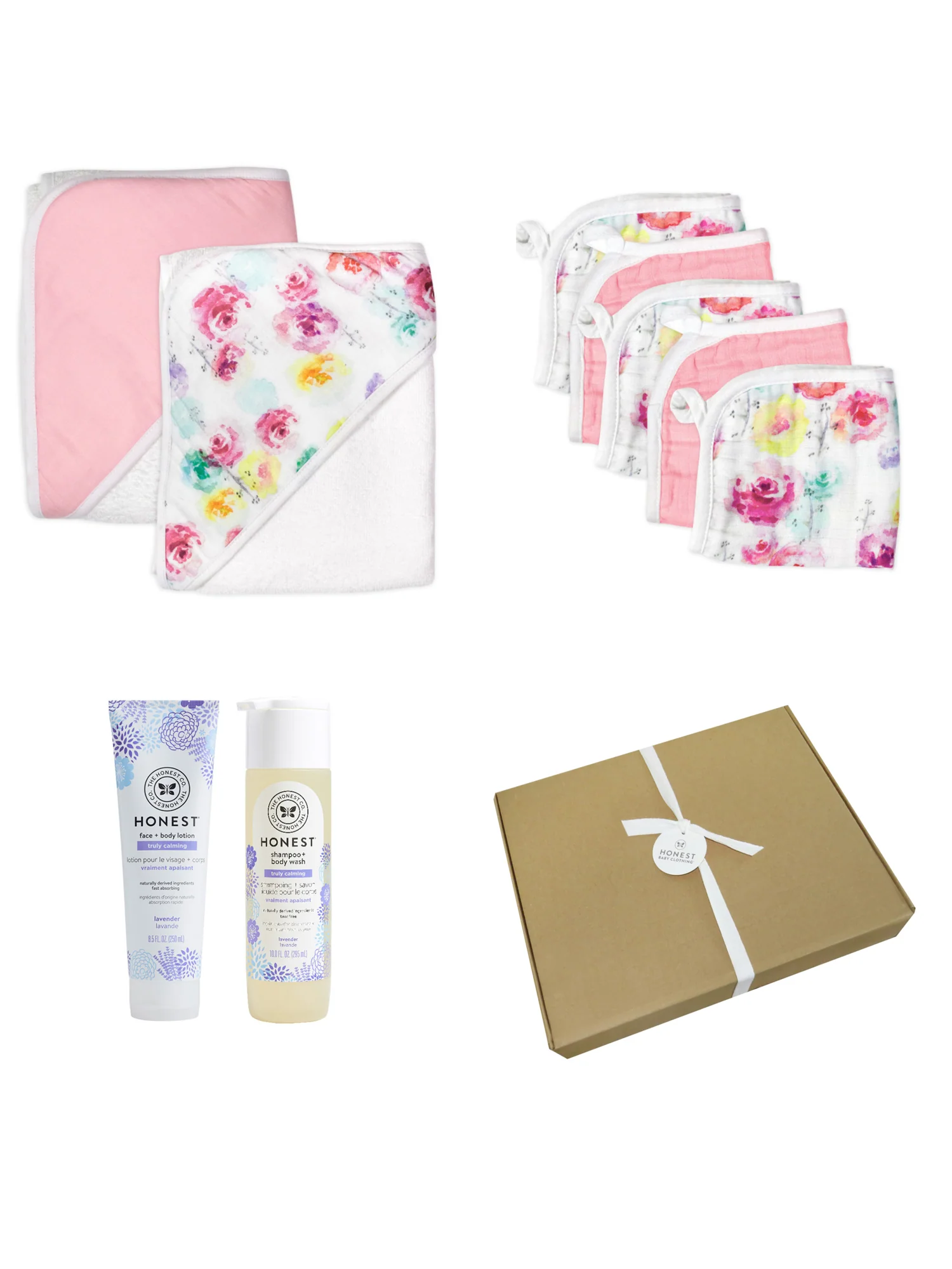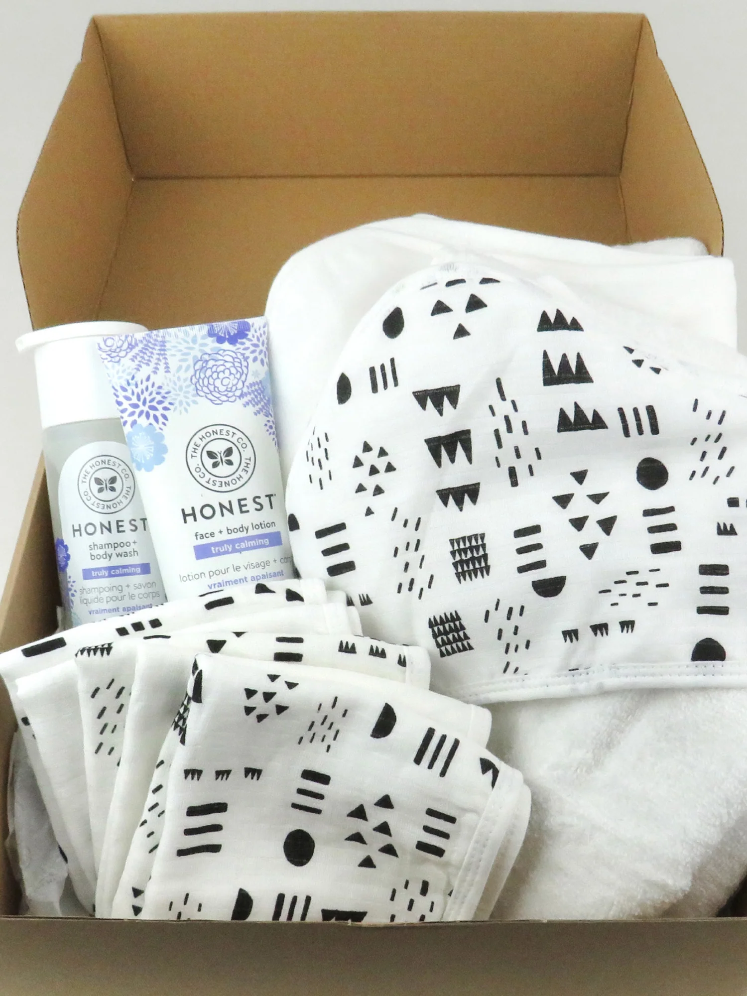 Are you looking for the perfect baby gift? Check out this adorable 9-piece bath time gift sets! Our extra plush and 100% organic cotton hooded towels and washcloths are must-have baby essentials that any mom would love. Our bath time gift set comes with two hooded towels and 5 washcloths with Honest® body lotion and shampoo + body wash. We pack this cute set in a craft gift box with a ribbon and tag so you don't have to add gift-wrapping for this item - it's included! Does it get any easier to give a great gift? That’s a wrap!