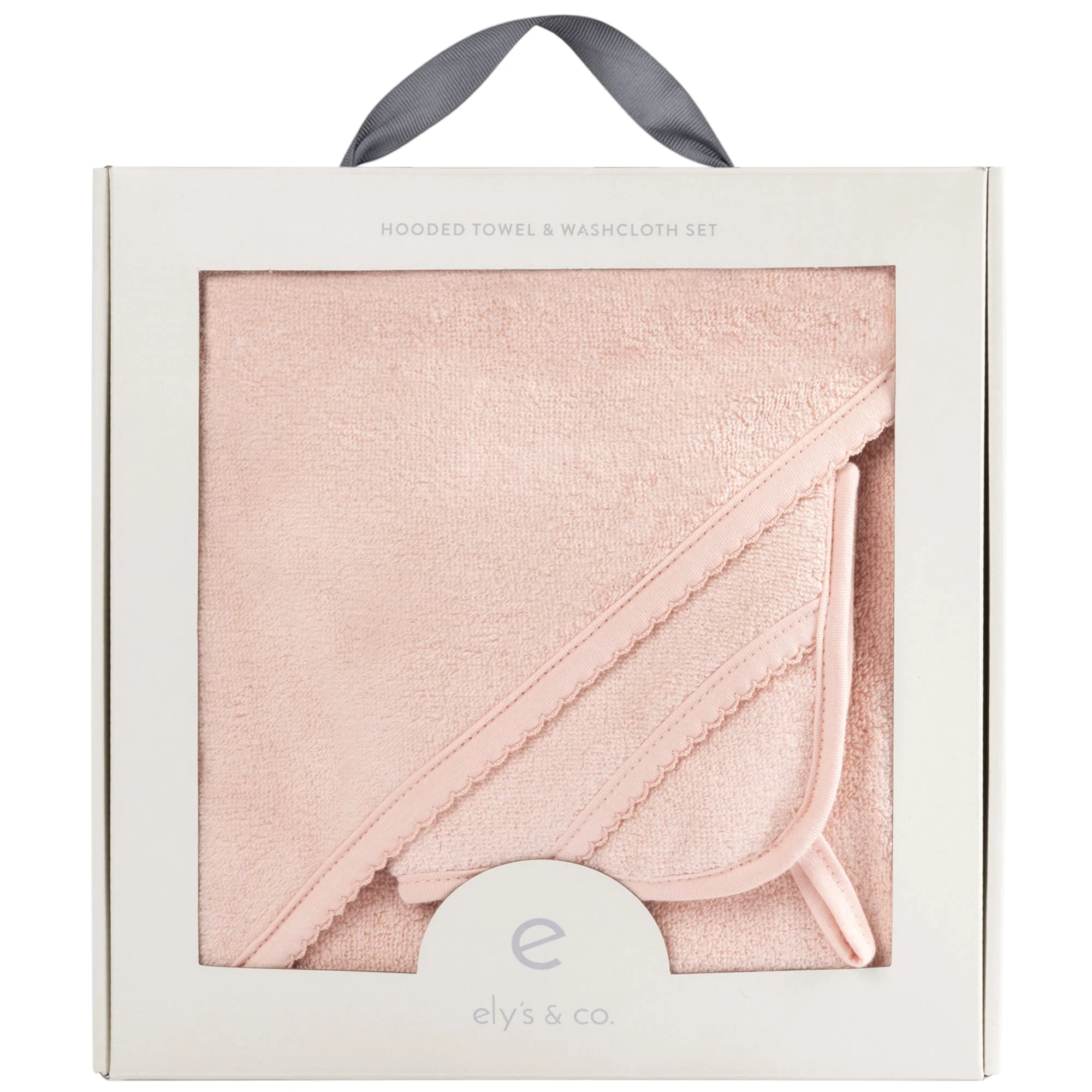 - Ely’s & Co. Cotton Terry Hooded Towel and Washcloth Set includes 1 (one) 35” x 35” hooded towel and 1 (one) 10” x 10” washcloth. Bundled in a chic, ivory gift-ready box, this essential bath time set makes for the perfect baby shower gift!