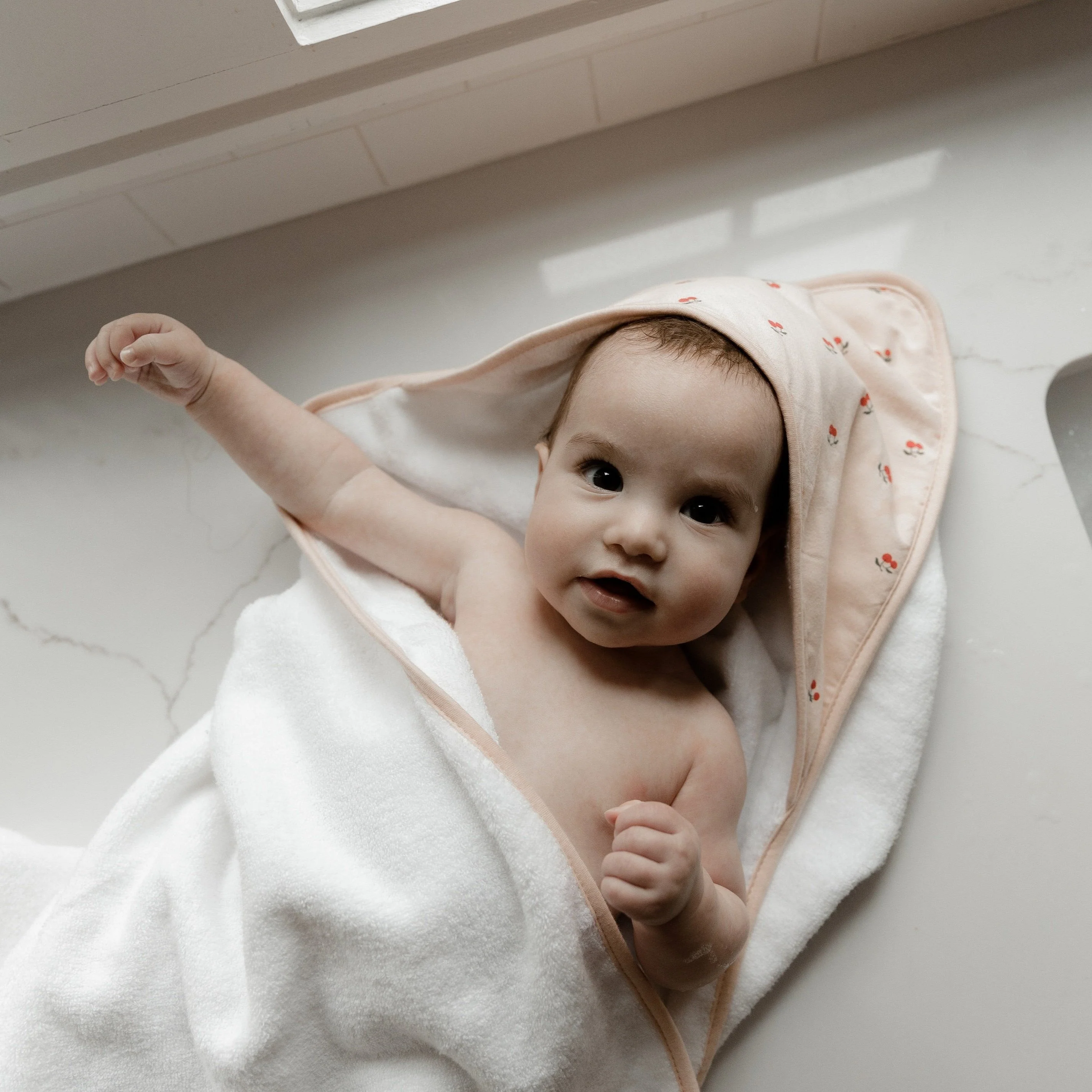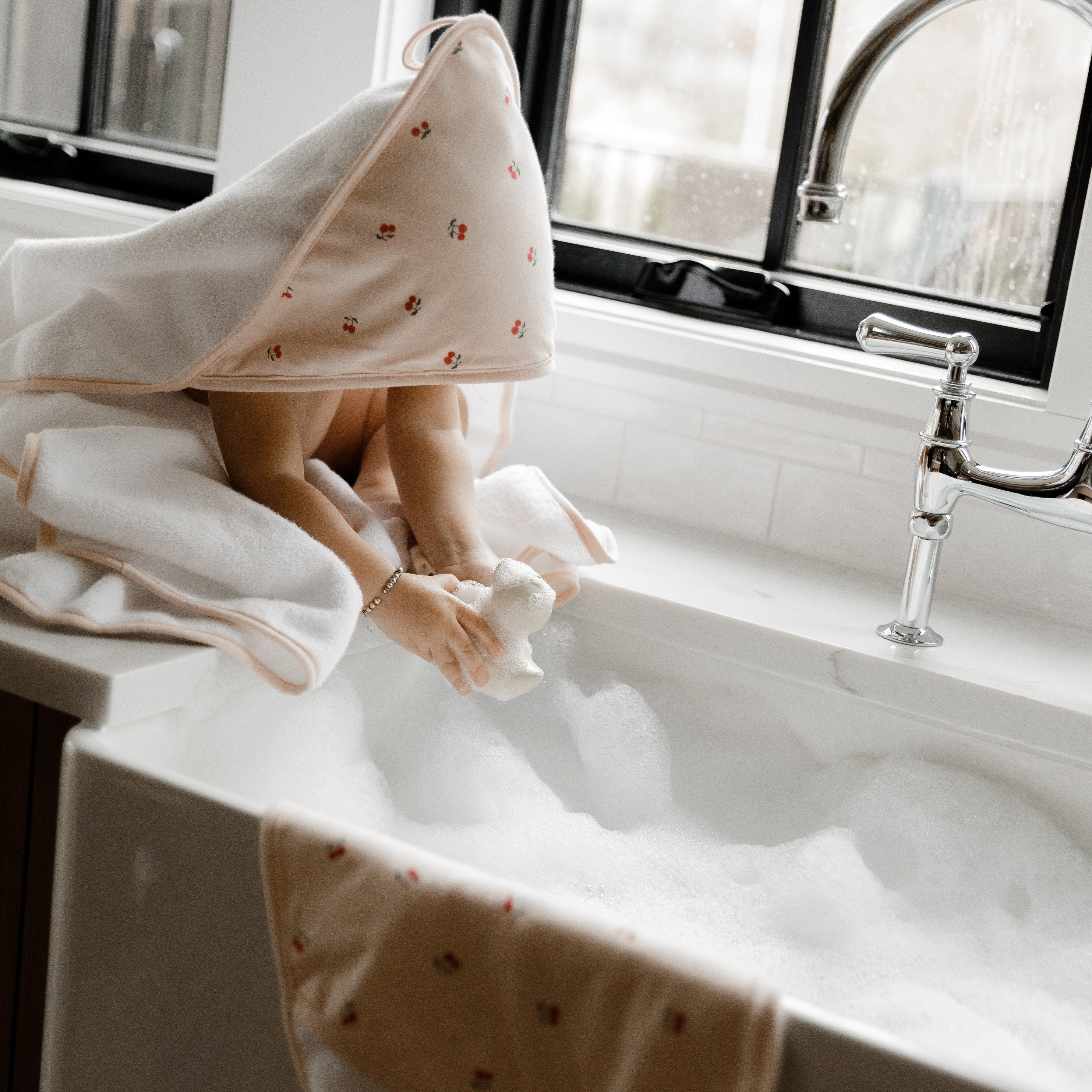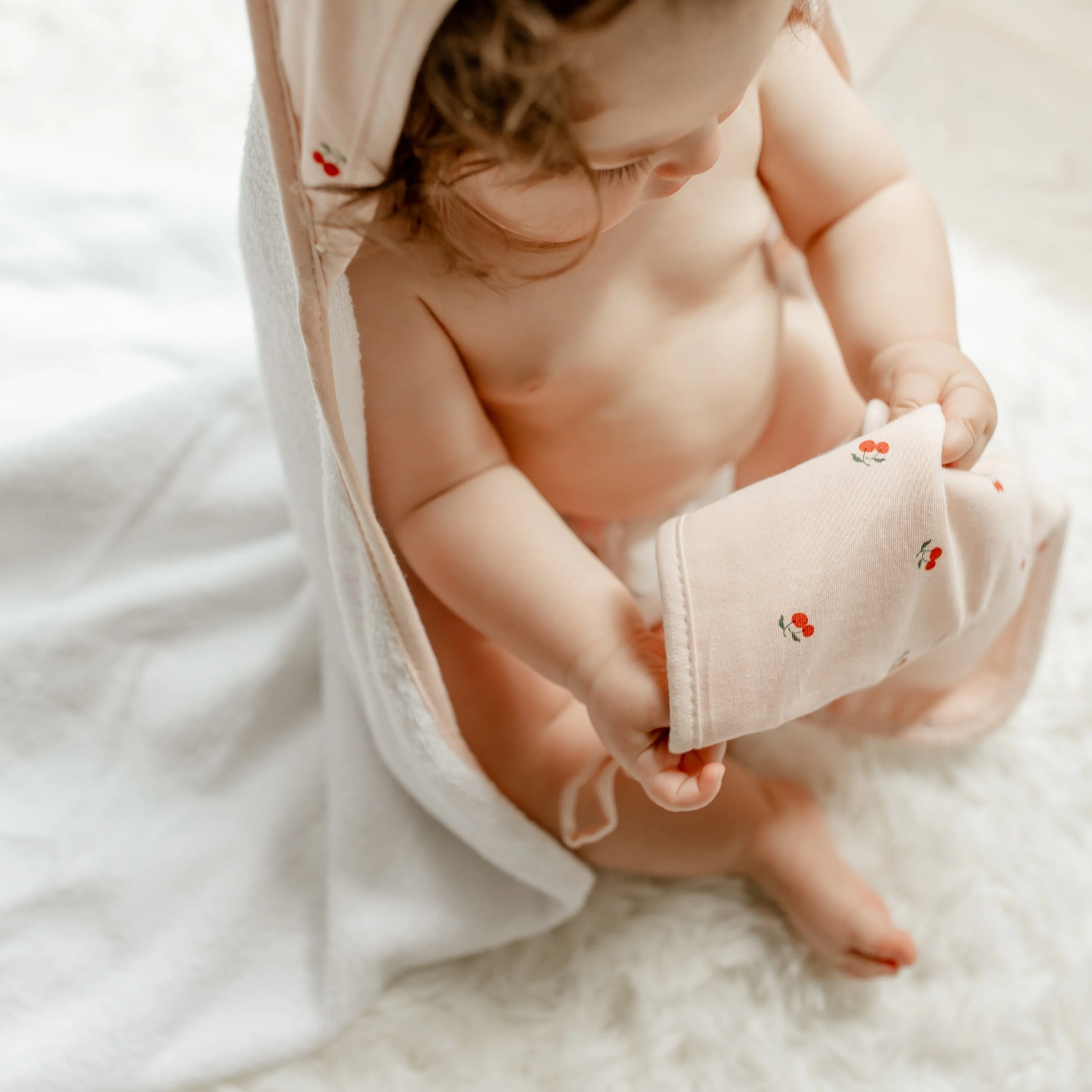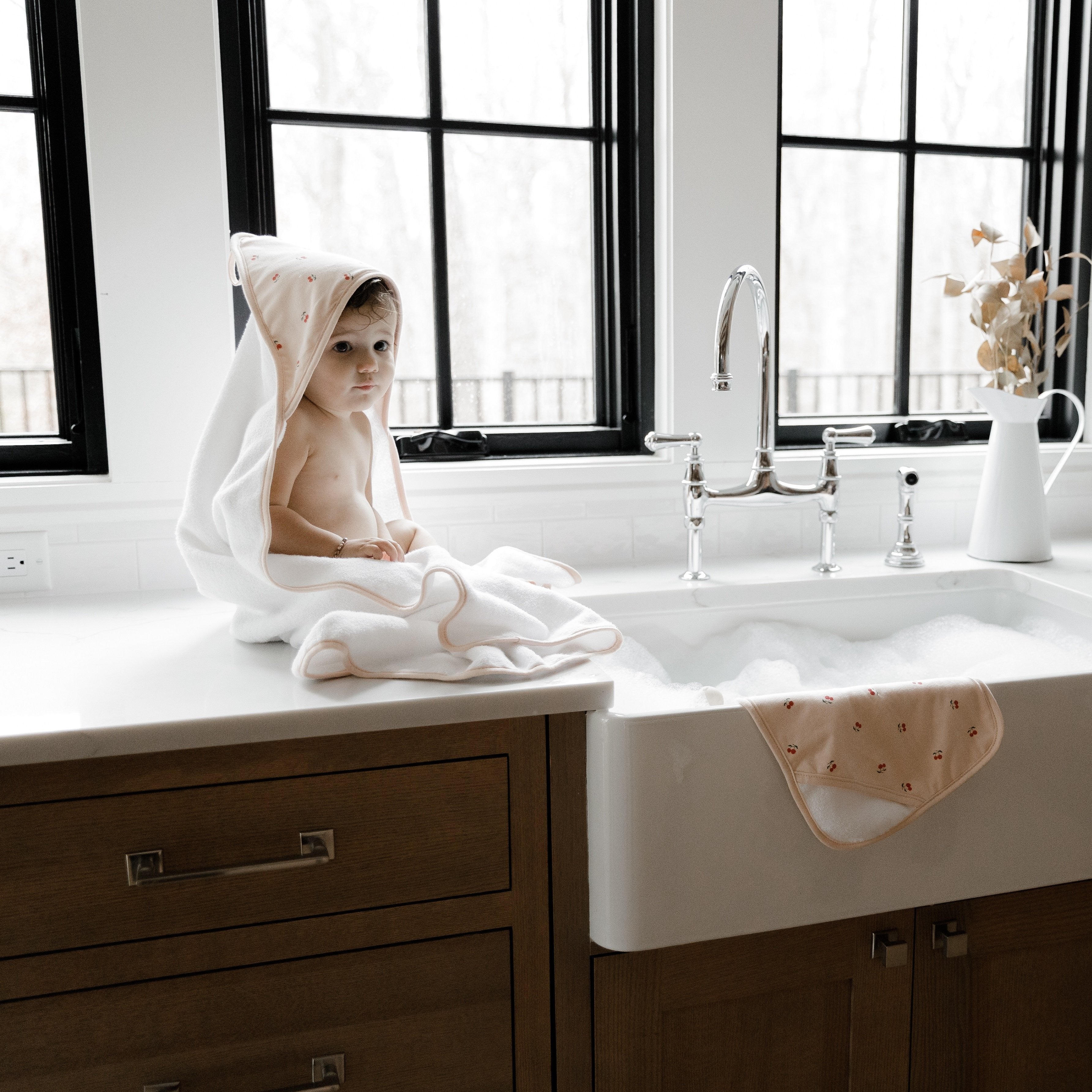 - This ultra-cozy, hooded towel and washcloth set features a sweet pink cherry print on ivory jersey knit cotton embellished with a soft and neutral sage trim. Classic, comfortable and designed on-point with the latest fashion trends, this ultra-absorbent bath set is a must-have addition to your Baby Registry and modern décor.