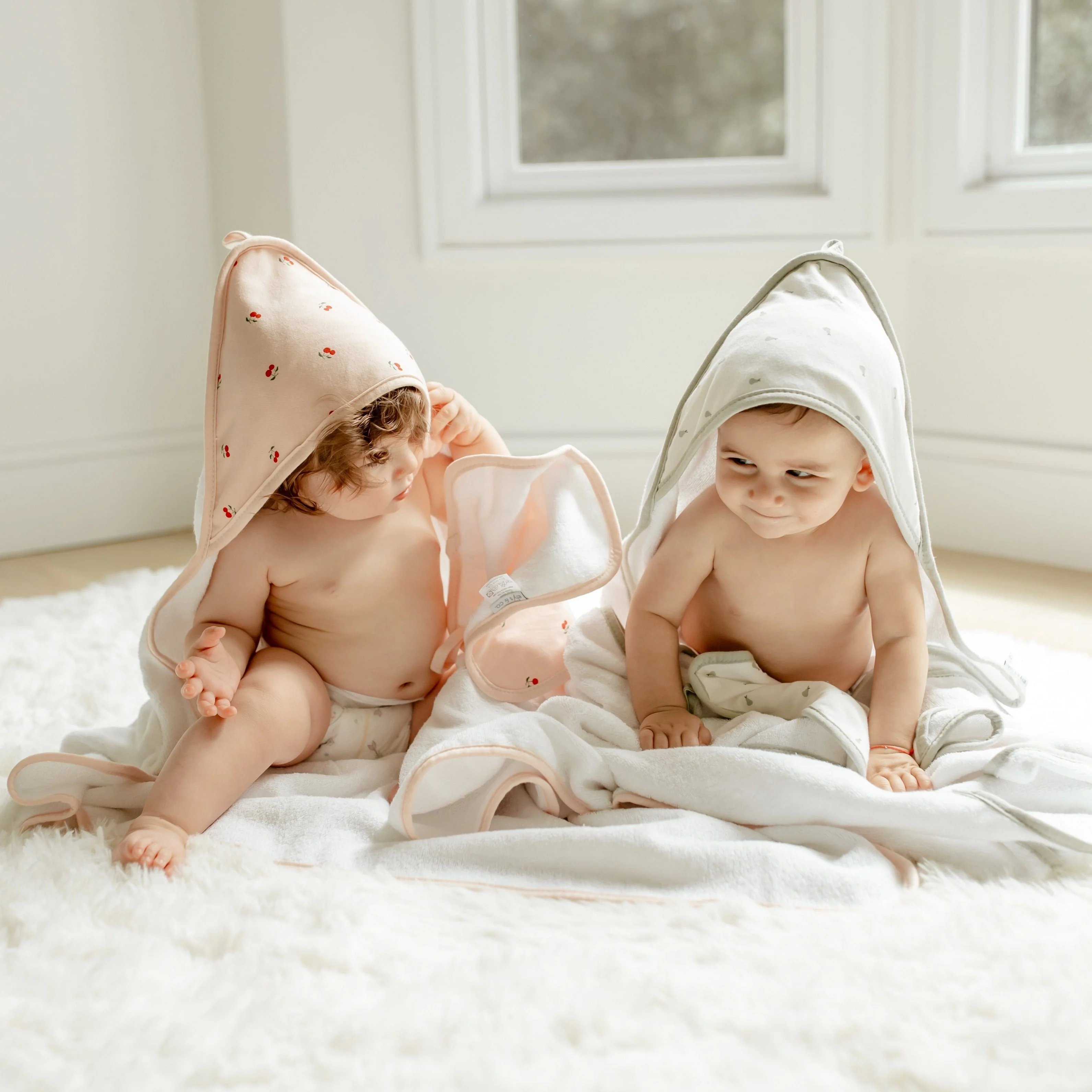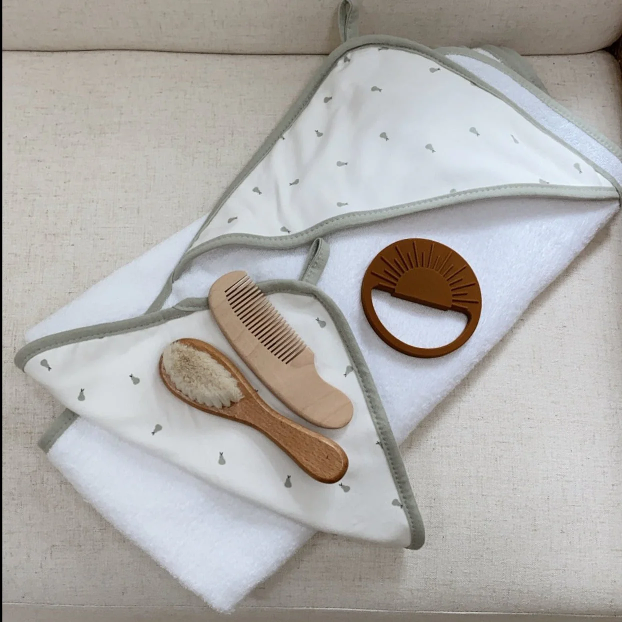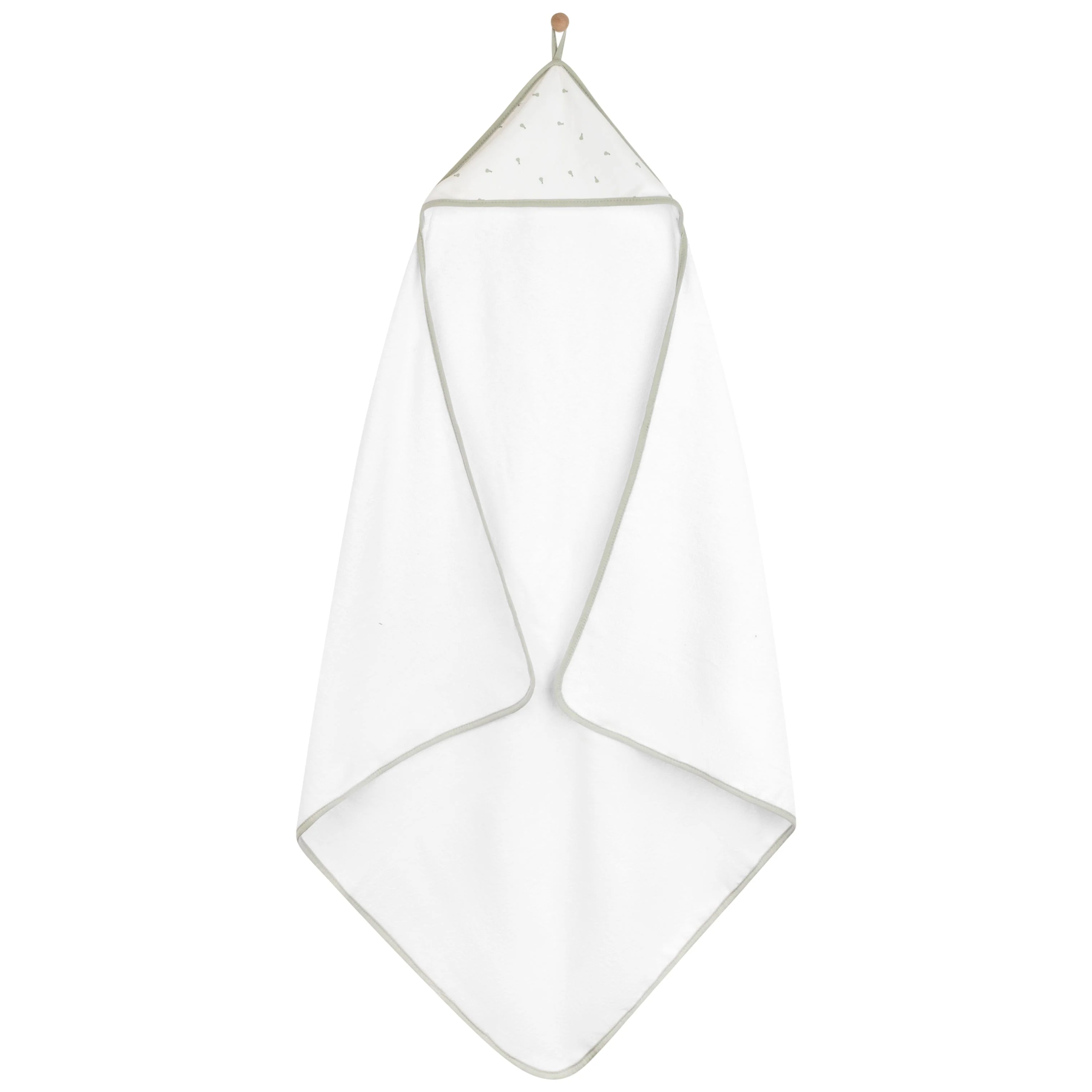 - This ultra-cozy, hooded towel and washcloth set features a sweet and whimsical, sage pear print on ivory jersey knit cotton embellished with a soft and neutral sage trim. Classic, comfortable and designed on-point with the latest fashion trends, this ultra-absorbent bath set is a must-have addition to your Baby Registry and modern décor.