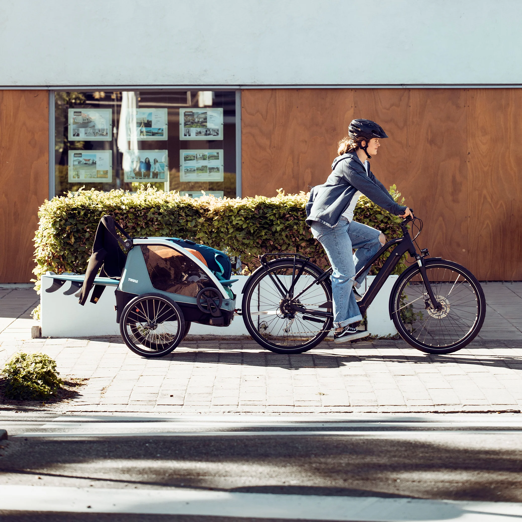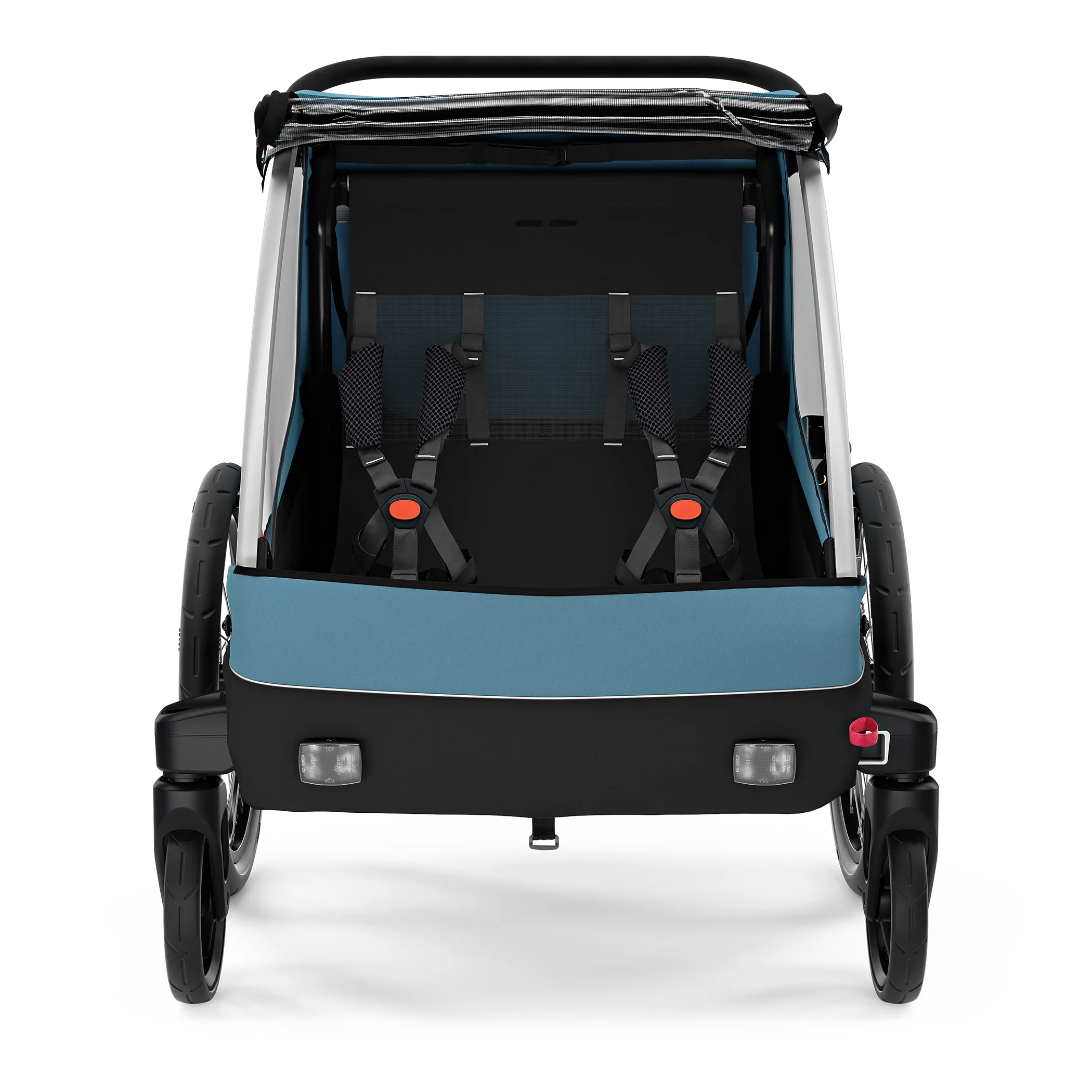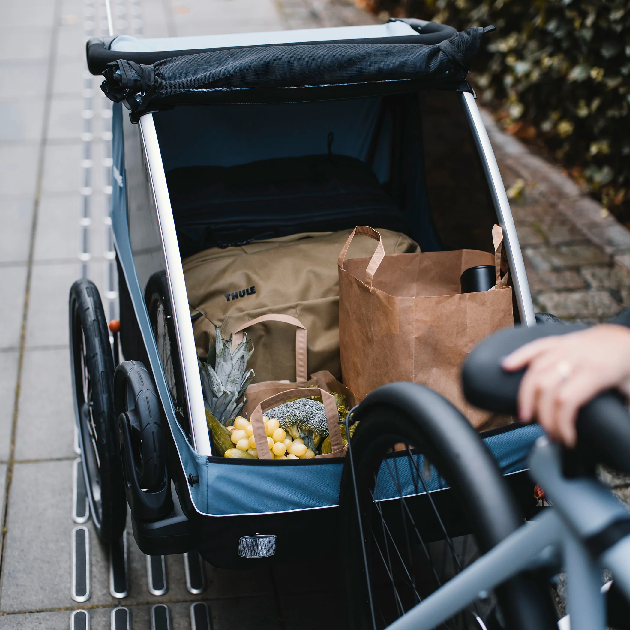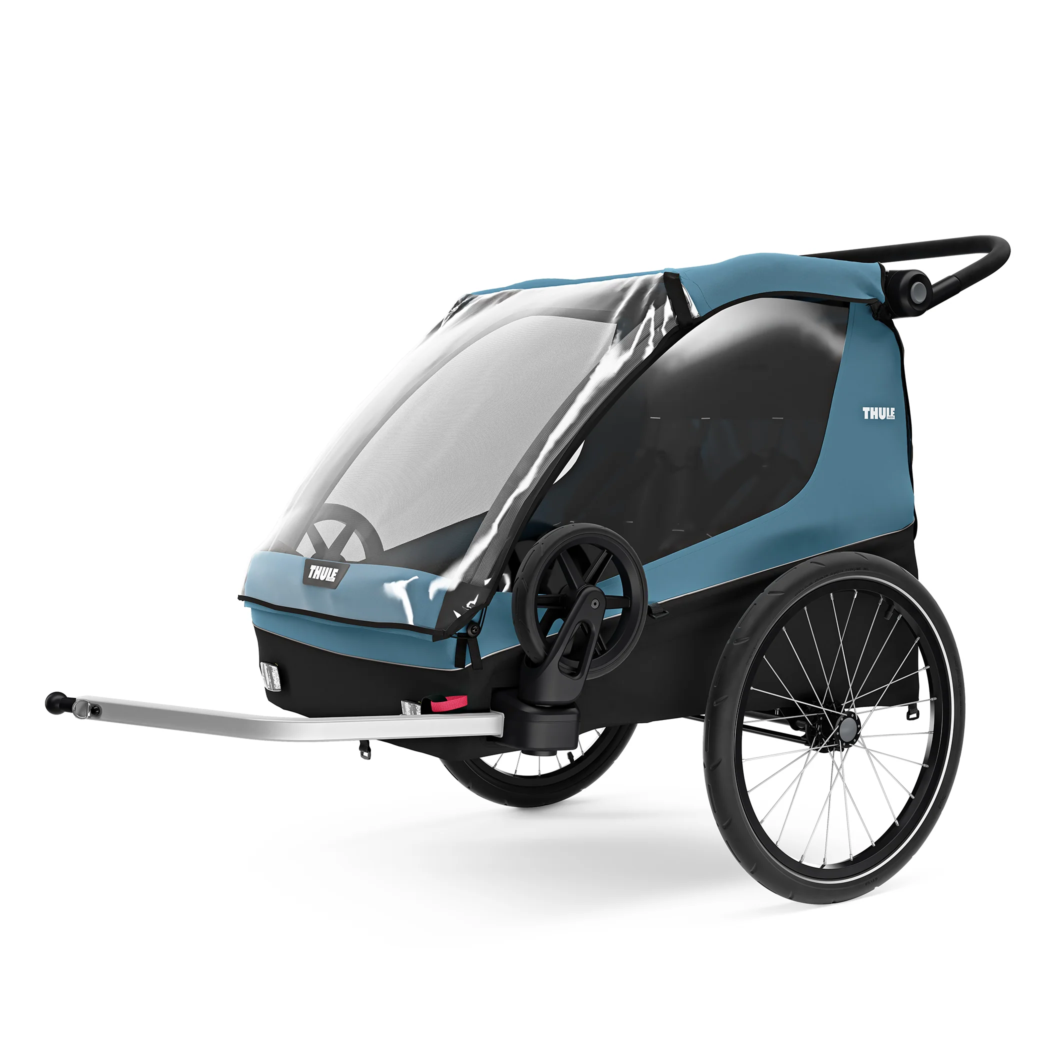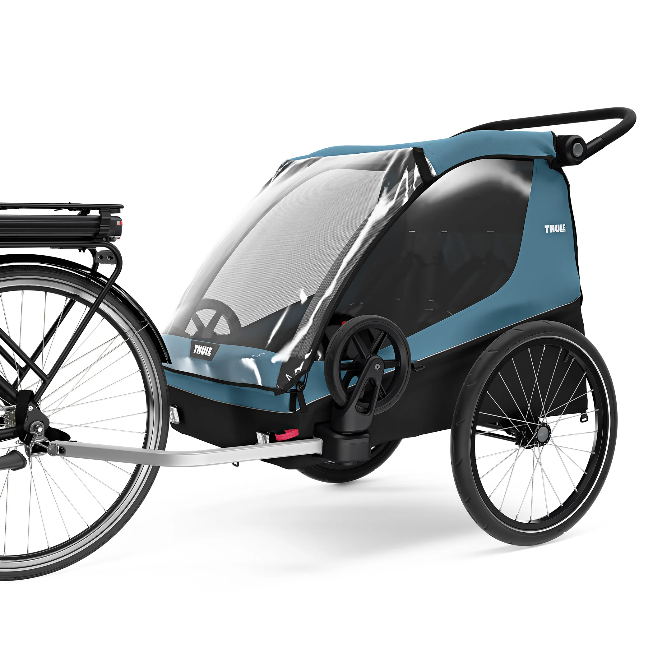 Flexibility for any family outing, Thule Courier is a versatile bike trailer for all types of families. This durable carrier is perfect for long rides as a family or for quick trips into town with its roomy cockpit for two children. It’s great for commuting and taking kids to school – and when you arrive, it easily converts into a stroller with compact wheels for maneuvering in crowded areas and a fully adjustable handlebar for parents. This comfortable bike carrier also features the option to fully convert into a cargo trailer and more.Commuting made easy,It’s a great bike carrier – and a great stroller. No compromises made. Thule Courier comes with two strolling wheels and a premium Thule bike trailer kit for easy commuting.Great cargo space Thule Courier can also easily convert into a cargo trailer. With a durable and sturdy cargo floor and integrated attachment points your gear stays secure at all times.Room for your four-legged friend Want to bring your puppy for the ride? You can! The optional dog trailer kit (sold separately) transforms Thule Courier into a trailer suitable for your dog. With an included soft dog bed and a roof cover with integrated rain cover you can include your best friend in your outdoor adventures."