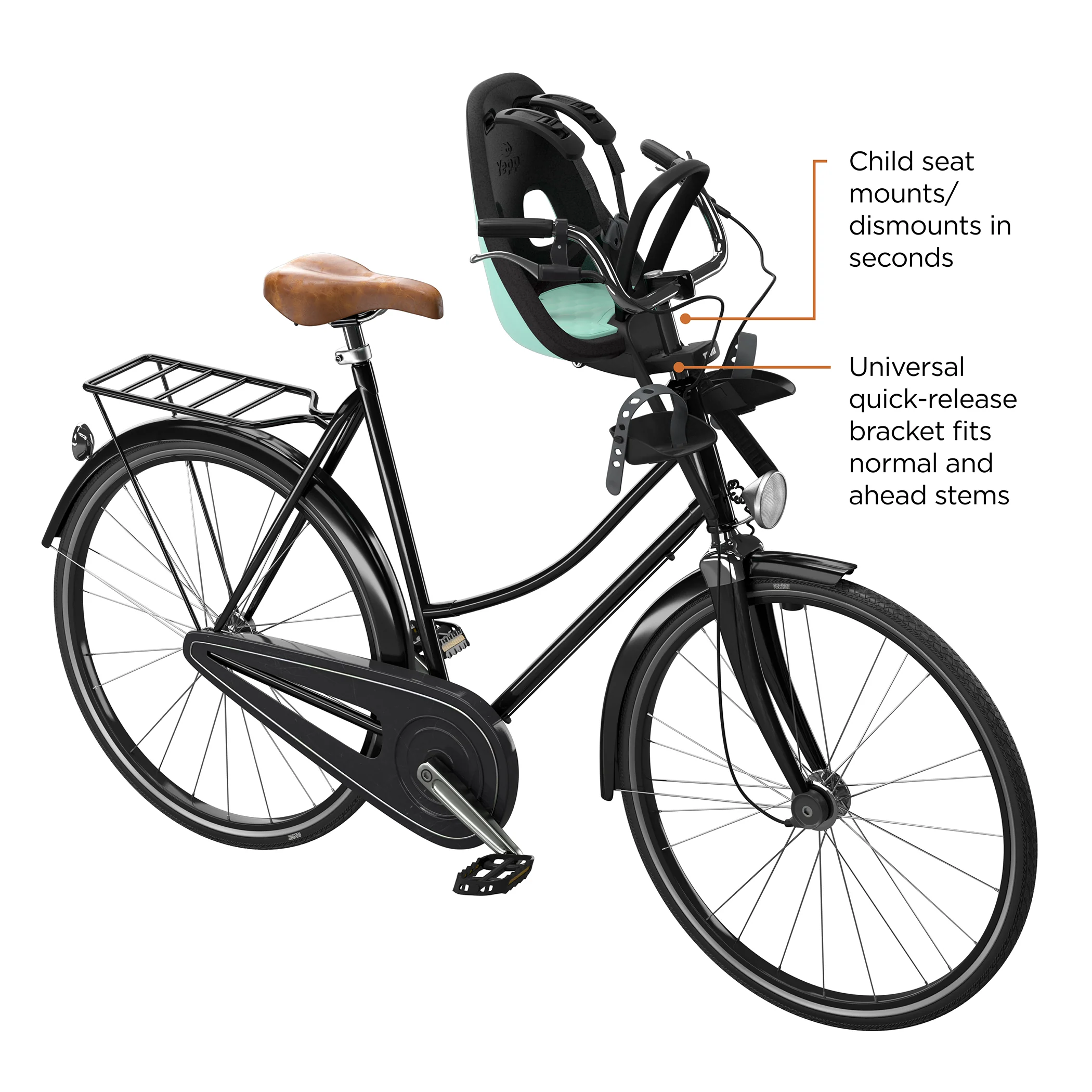 - Seat can be mounted/dismounted from bike in seconds with the universal quick-release bracket, fitting both normal and ahead stems