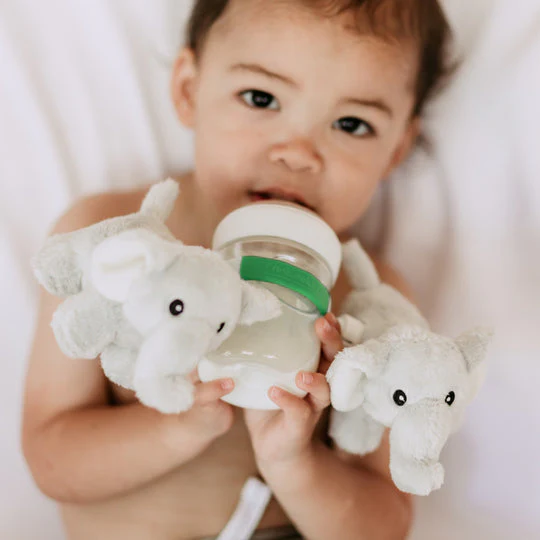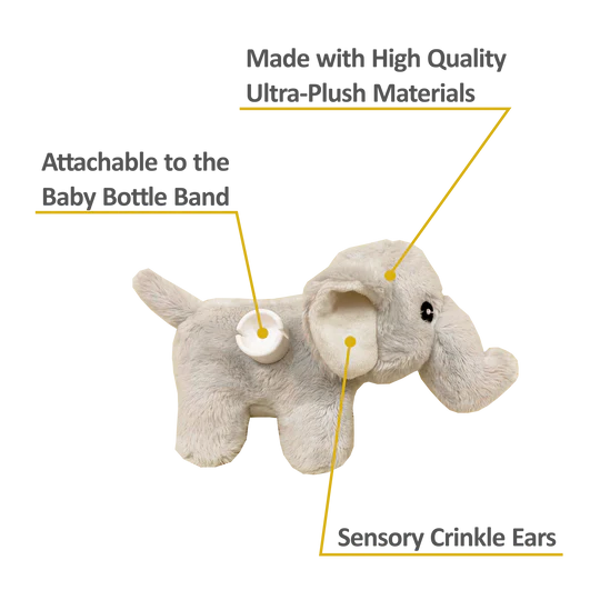 A gripping baby is a happy baby. Keep your baby busy feeding with this stretchable band that allows interchangeable handles to be attached onto the bottle for your baby to explore, exercise their grip and play. Attach these two adorable elephant plush to your favorite baby bottle or toddler sippy cup. These handheld plush will keep your baby interested and entertained while they bottle feed!