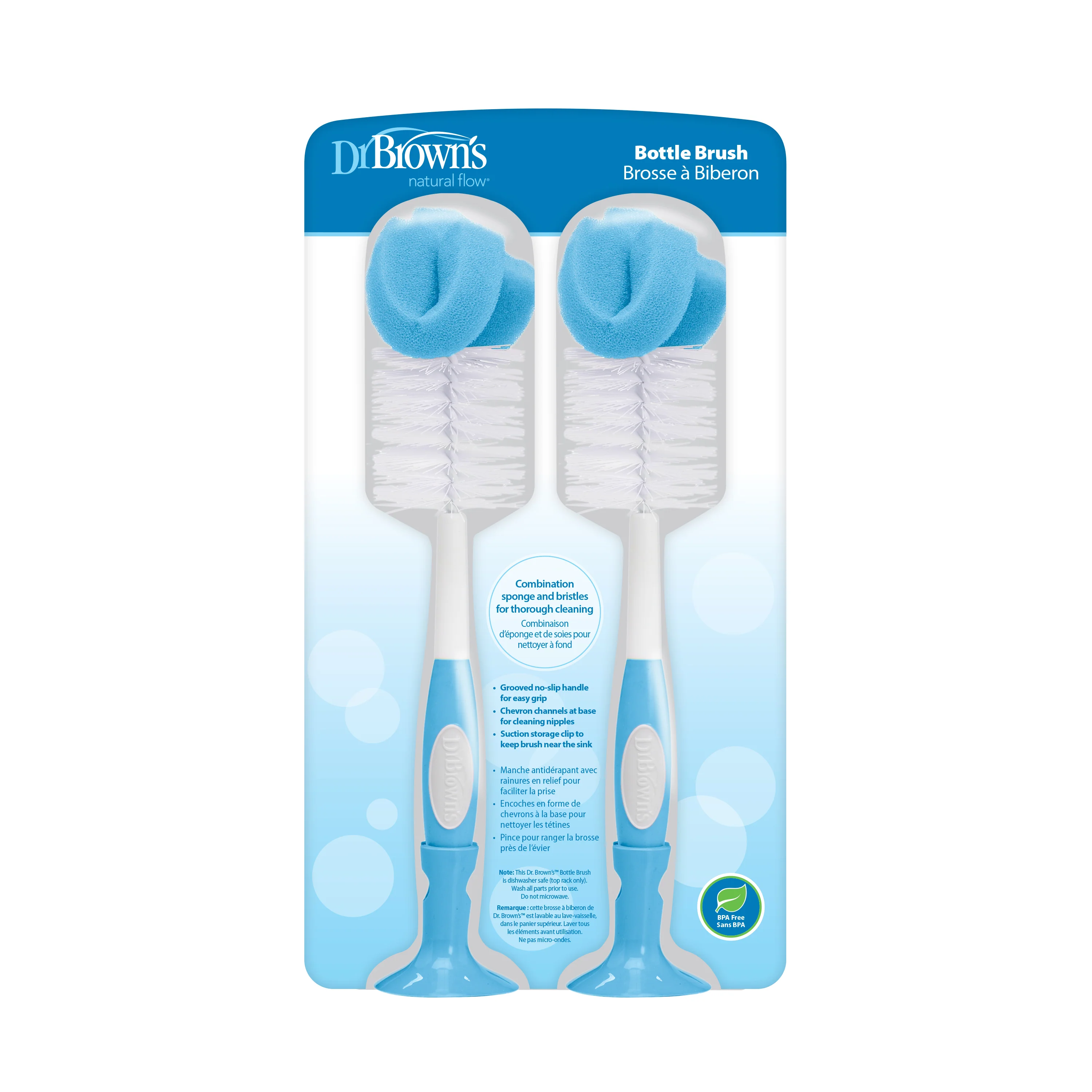 Dr. Brown's Natural Flow Bottle Brush is designed to keep baby bottles squeaky clean. It features a combination sponge and bristle brush head for thorough, easy cleaning of bottles and chevron channels at the base of the brush to clean nipples.
