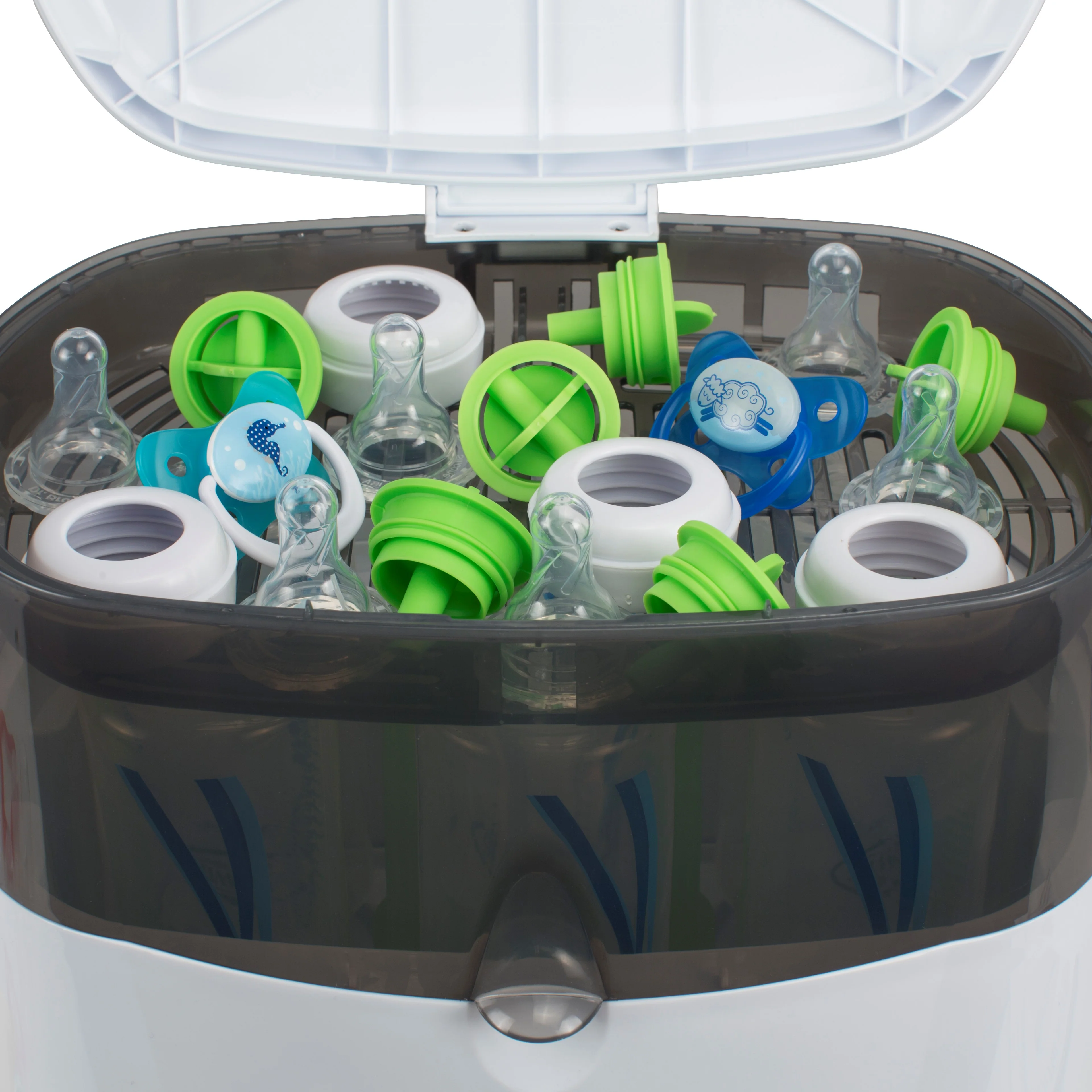 The Dr. Brown's Deluxe Electric Steam Bottle Sterilizer will give you the quality clean you're looking for by sterilizing 6 bottles in 12 minutes. It includes tongs and a convenient accessory tray to sterilize pacifiers, nipples, and other small items.