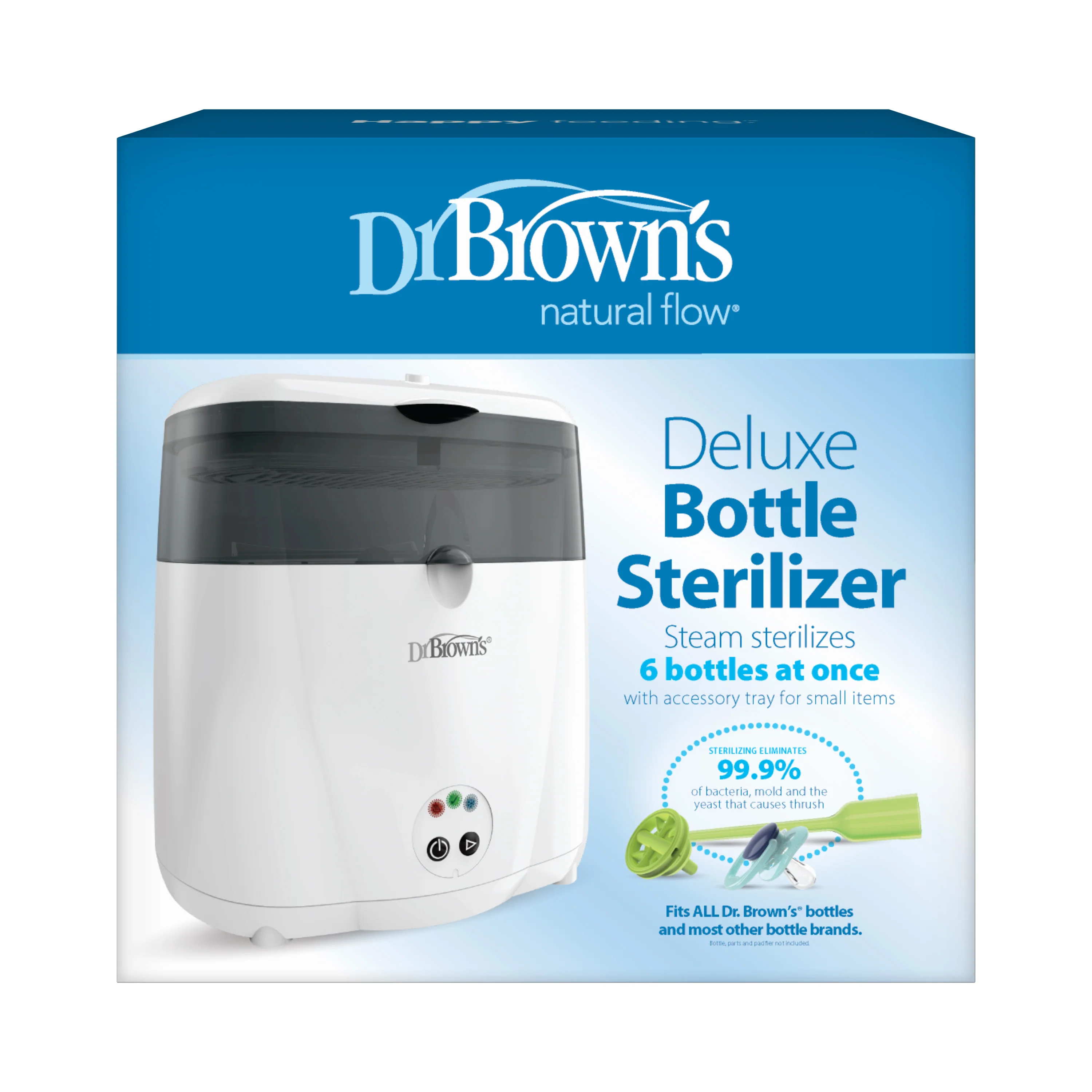 - Dr. Brown's Deluxe Electric Steam Bottle Sterilizer features a removable basket to sterilize 6 bottles and includes an accessory tray for cleaning pacifiers and other small feeding items.
