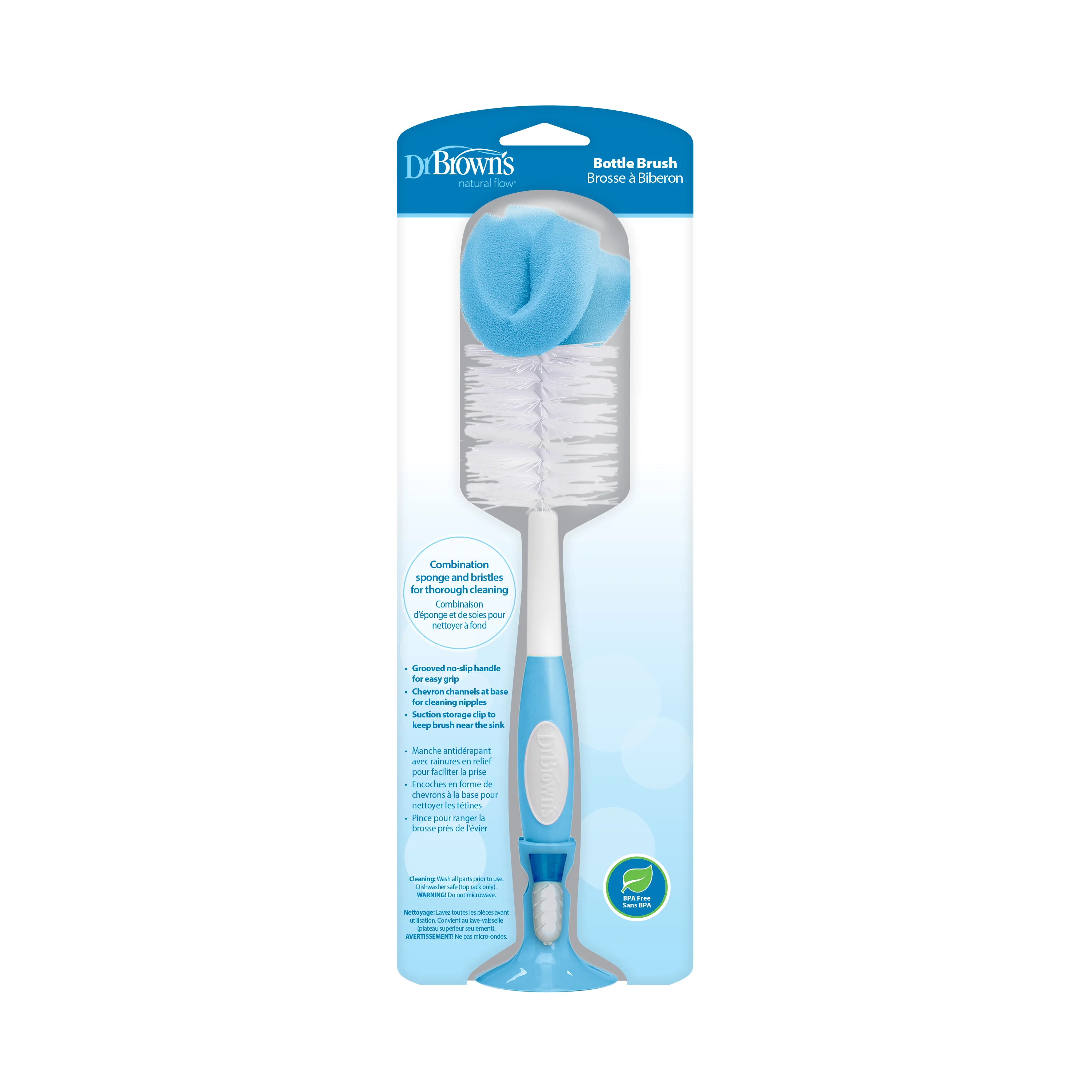 For use with standard and wide-neck Dr. Brown's Natural Flow baby bottles, this brush features a combination sponge and bristle brush head for thorough cleaning. Its grooved, no-slip handle offers ridged chevron channels to clean nipples with ease.