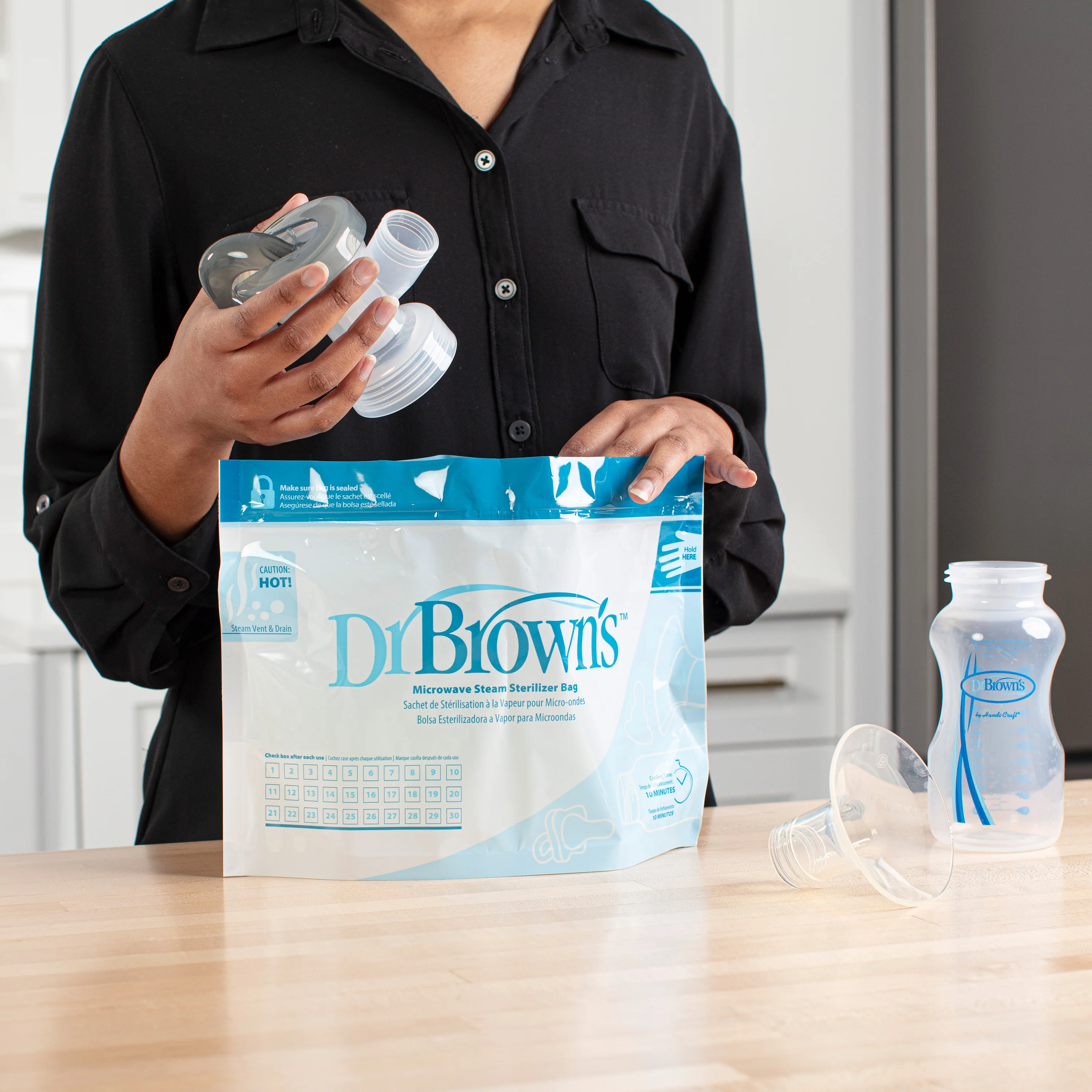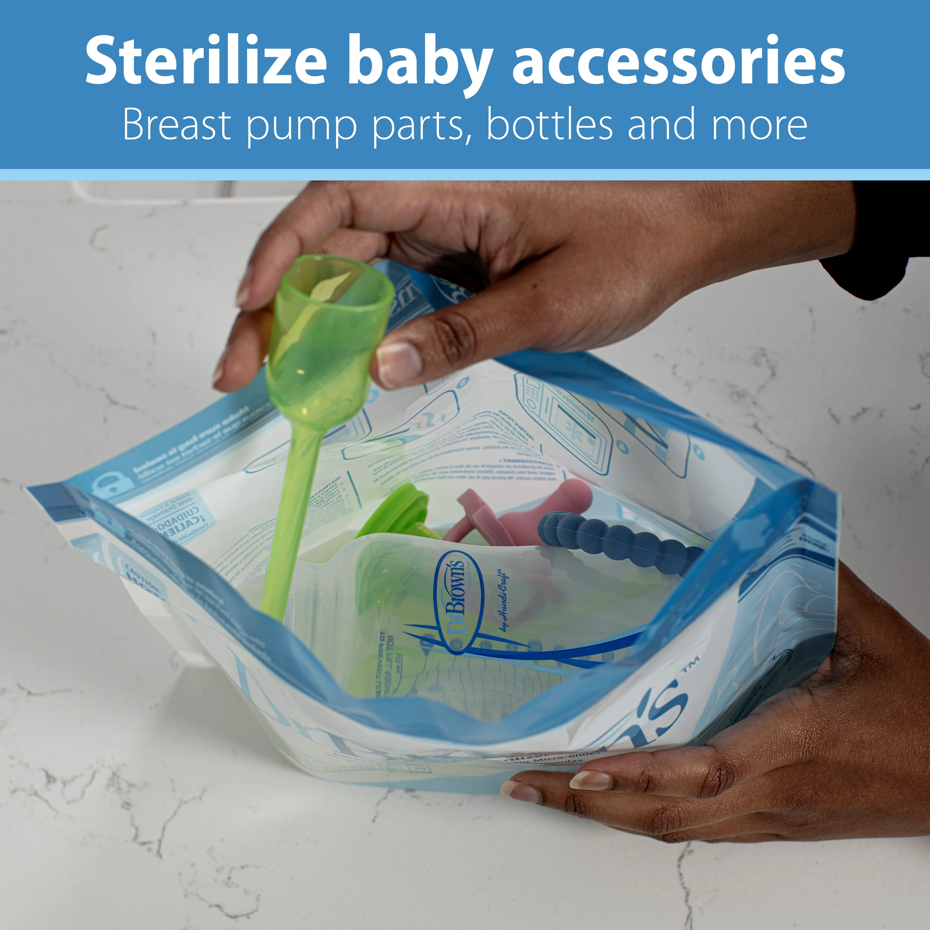 Use Dr. Brown's Microwave Steam Sterilizer Bags to quickly and effectively sterilize parts from Dr. Brown's baby bottles, eliminating 99.9% of most household bacteria and germs. The bags are designed to fit all Dr. Brown's baby bottles and parts.